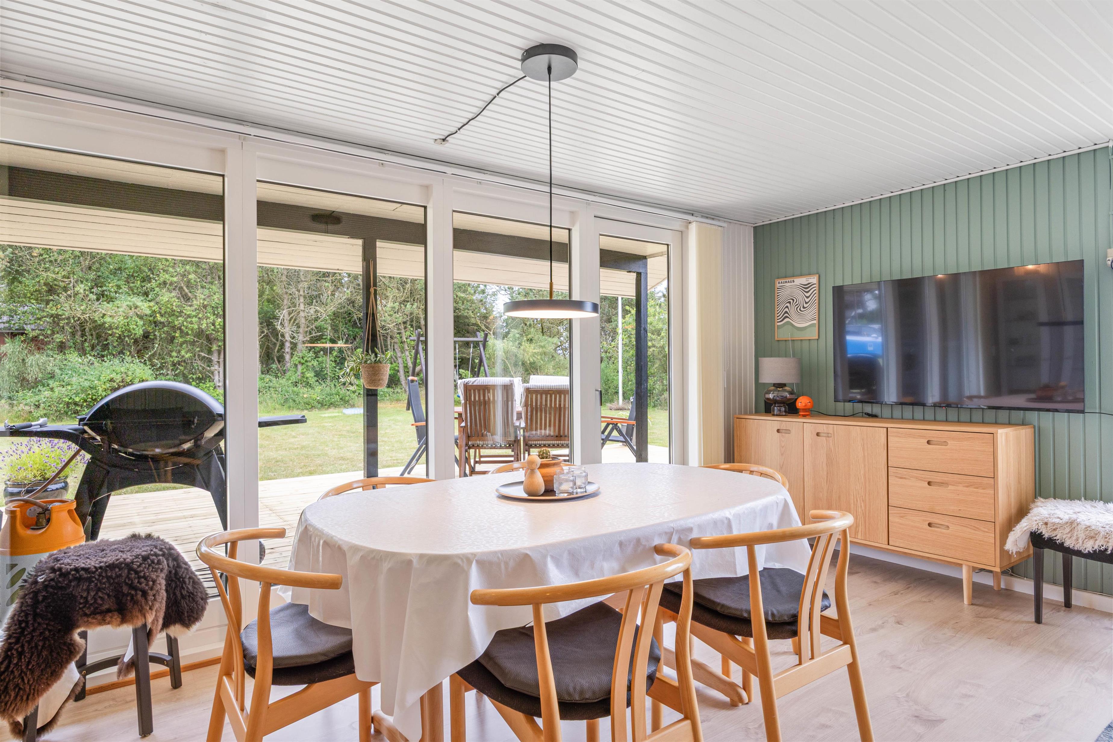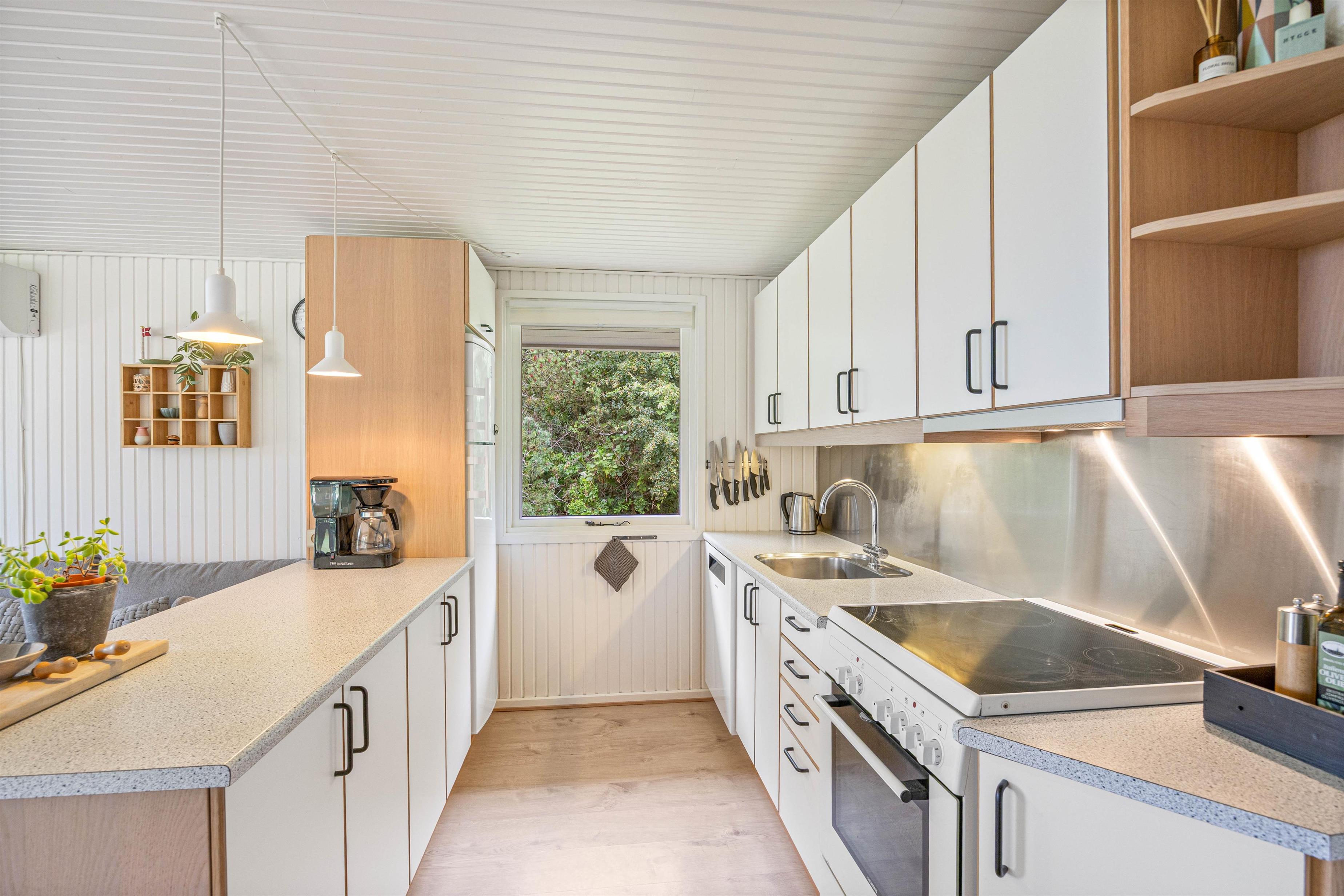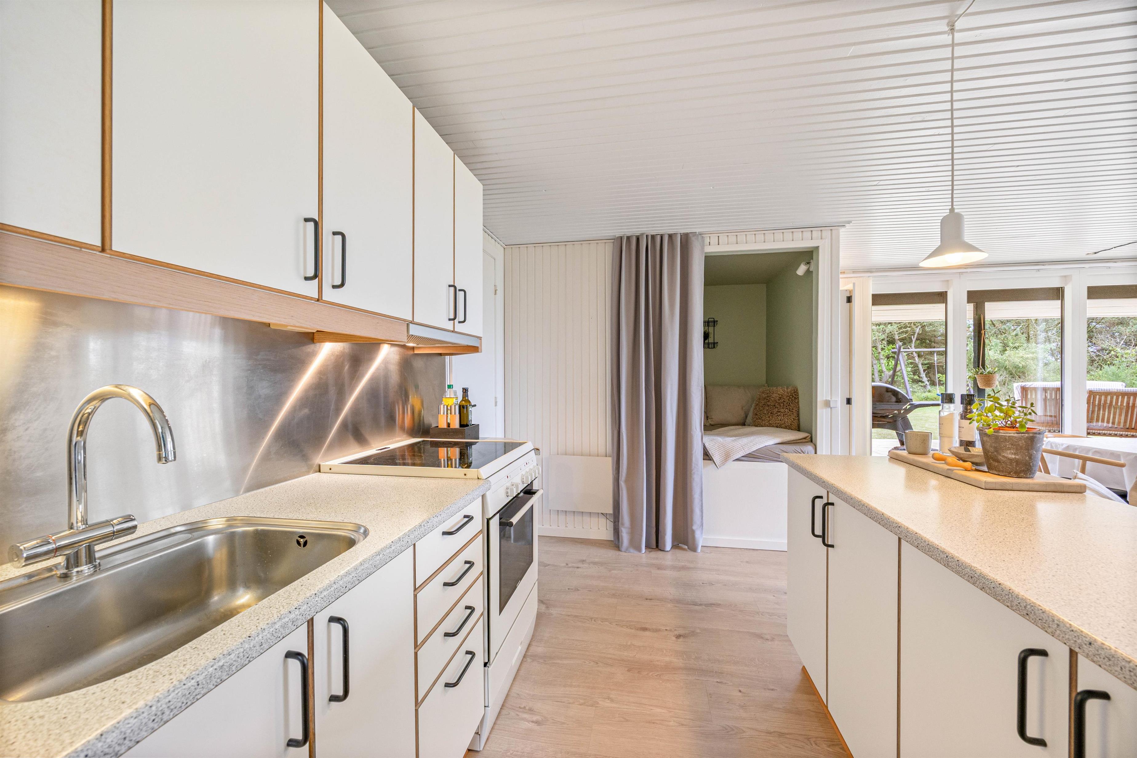 Sommerhusets hjerte er det åbne køkken-alrum i direkte forbindelse med stuen, hvor familien kan samles om madlavning, brætspil eller en god film. De store vinduespartier mod syd og vest lukker masser af naturligt lys ind og bringer naturen helt tæt på, hvilket skaber en indbydende og behagelig atmosfære.