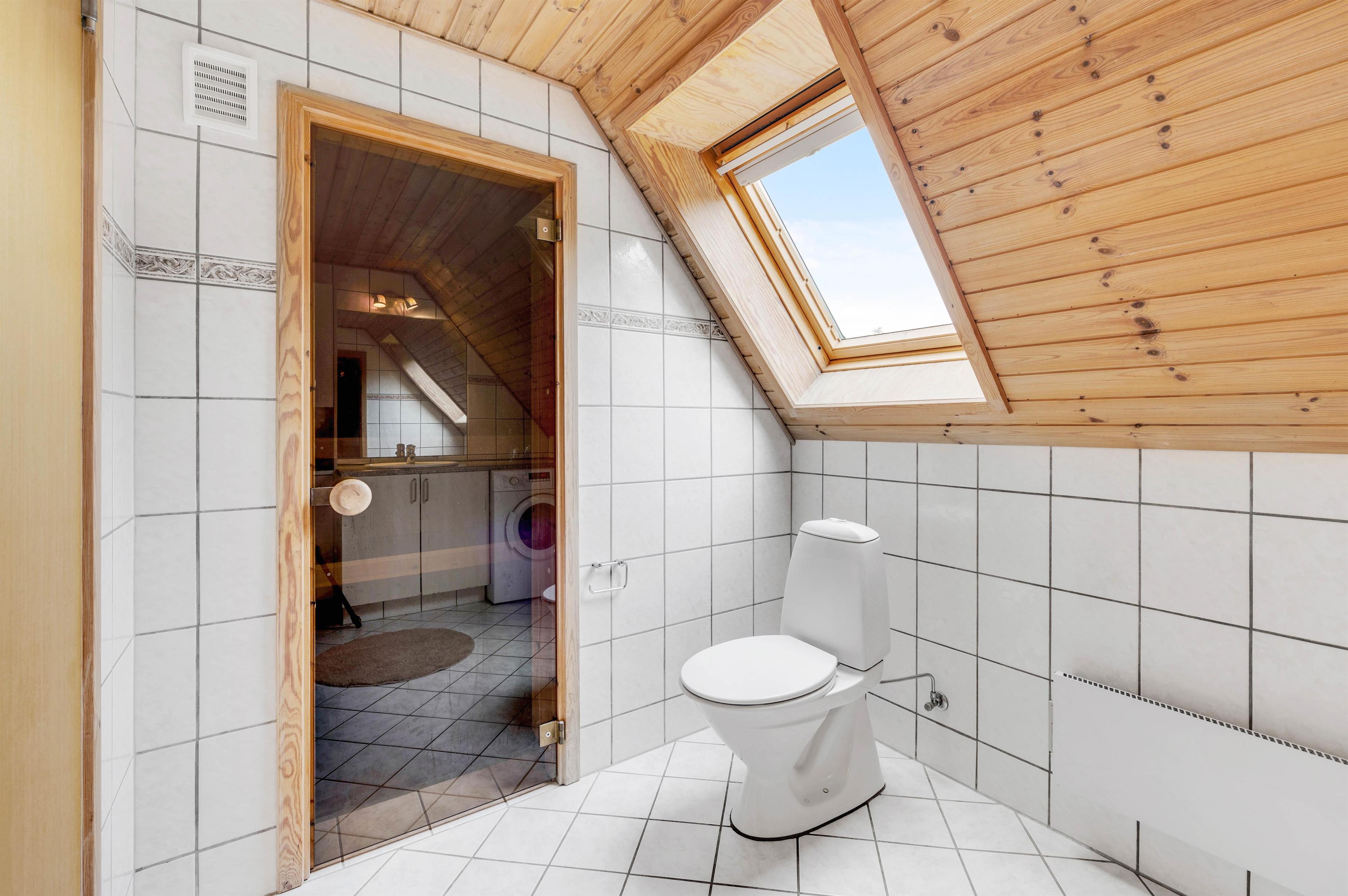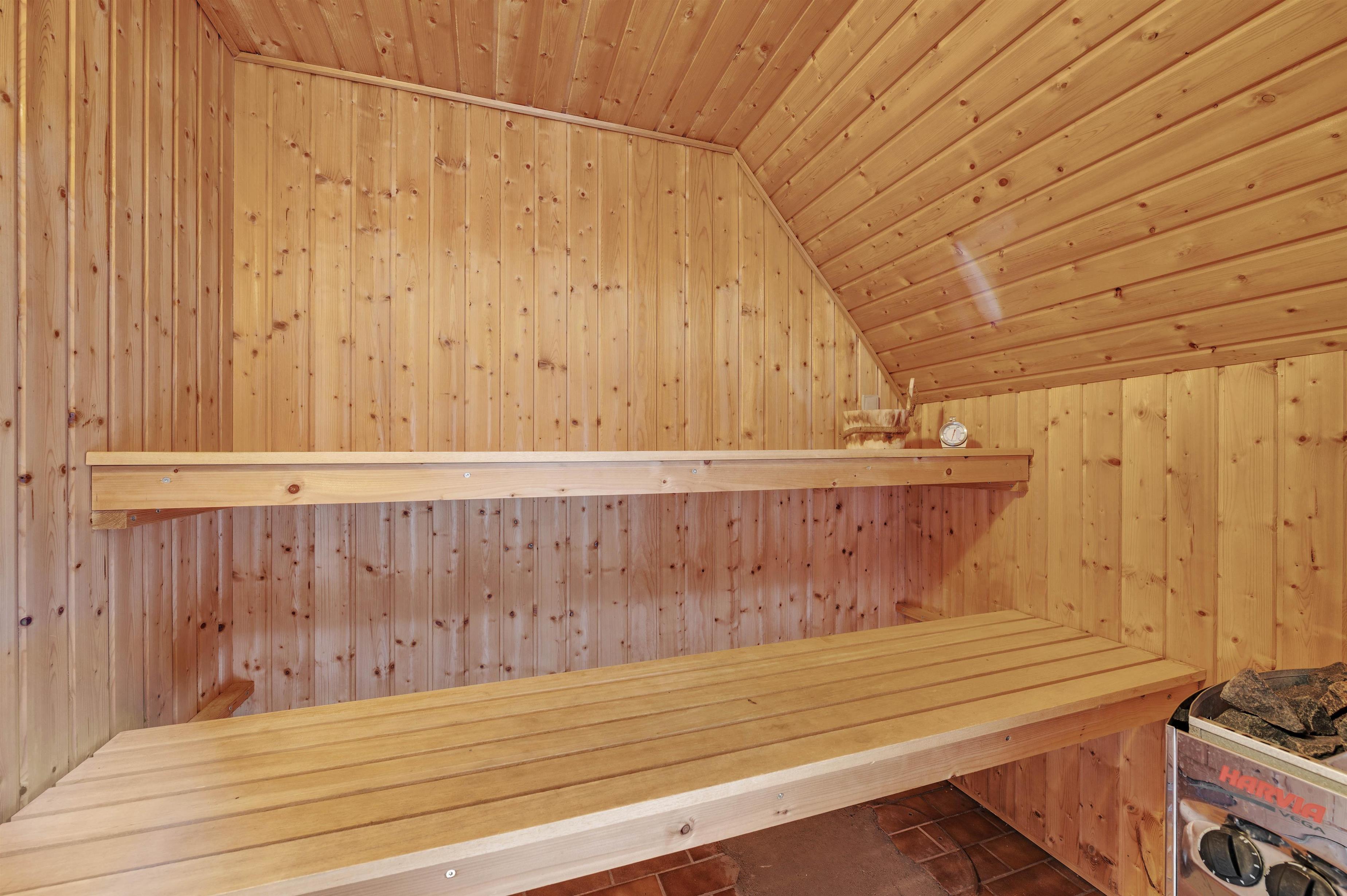 Fra sommerhusets badeværelse har I adgang til en skøn sauna. Her kan I sætte jer ind, når I trænger til lidt ekstra afslapning på jeres ferie, eller efter en frisk tur til Vesterhavet, hvor I trænger til at blive varmet godt igennem igen.