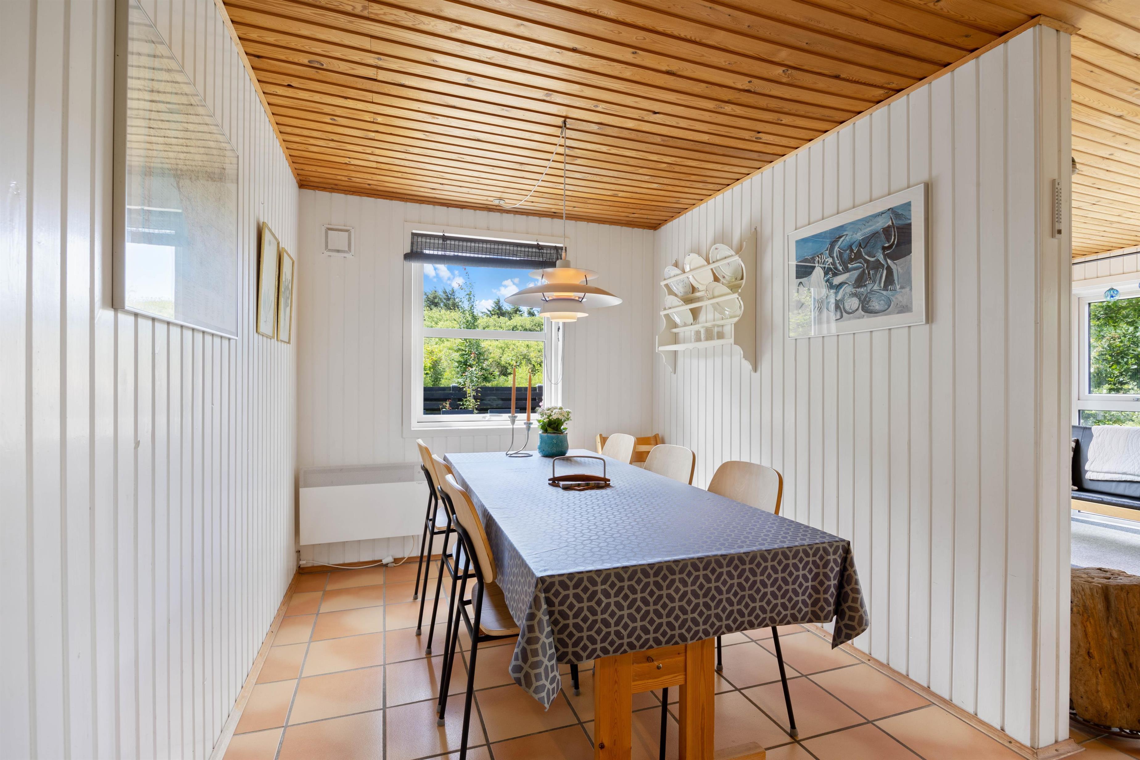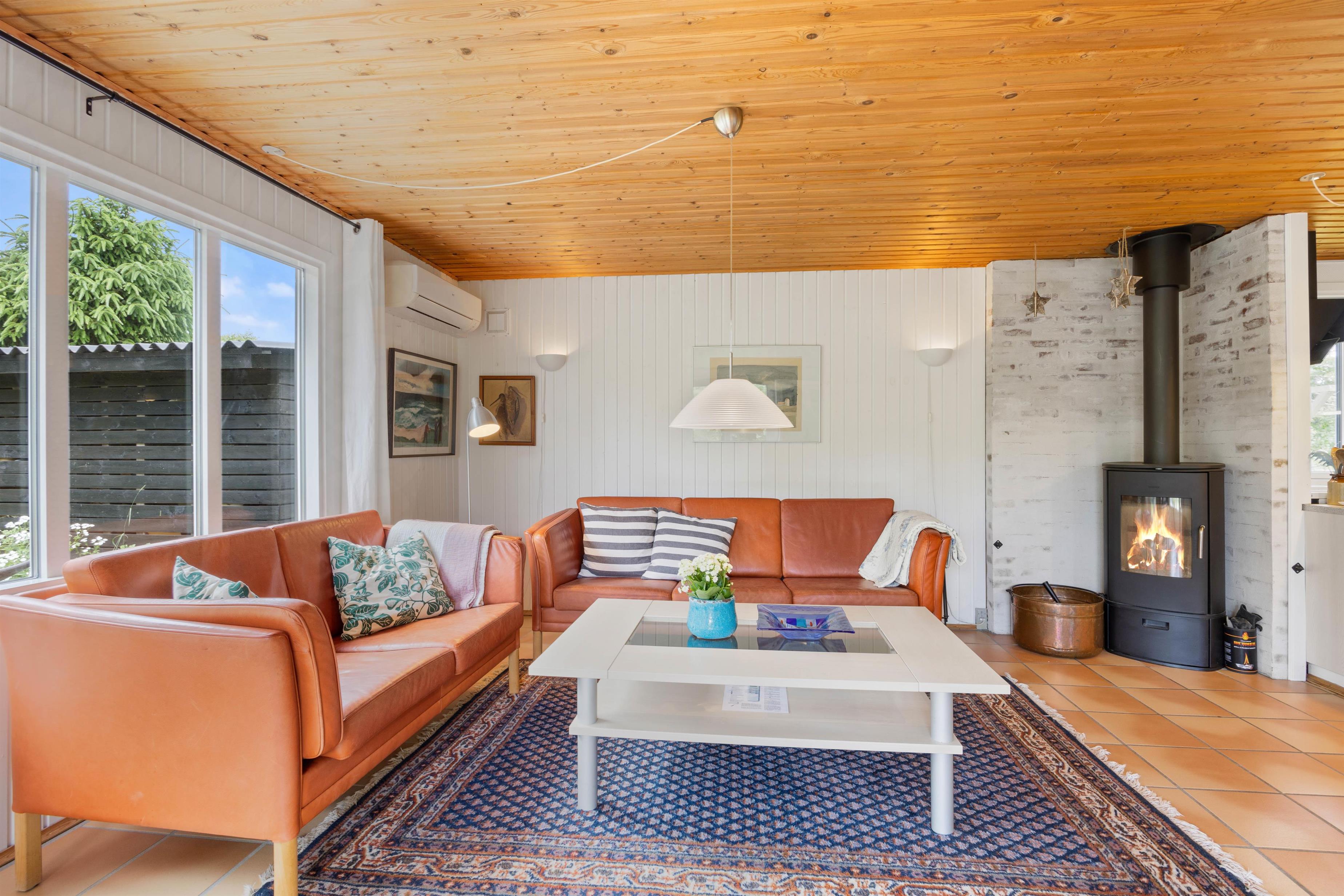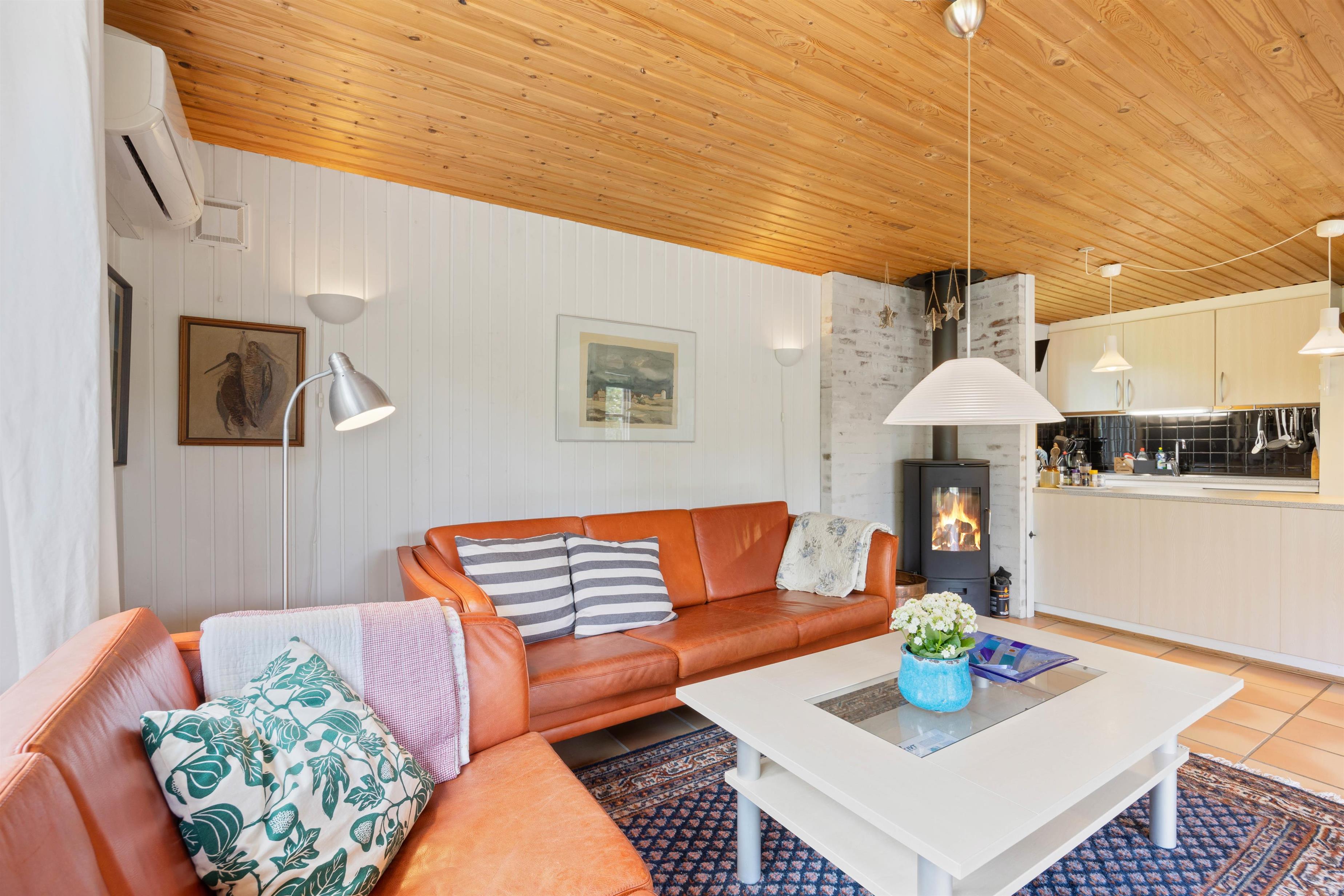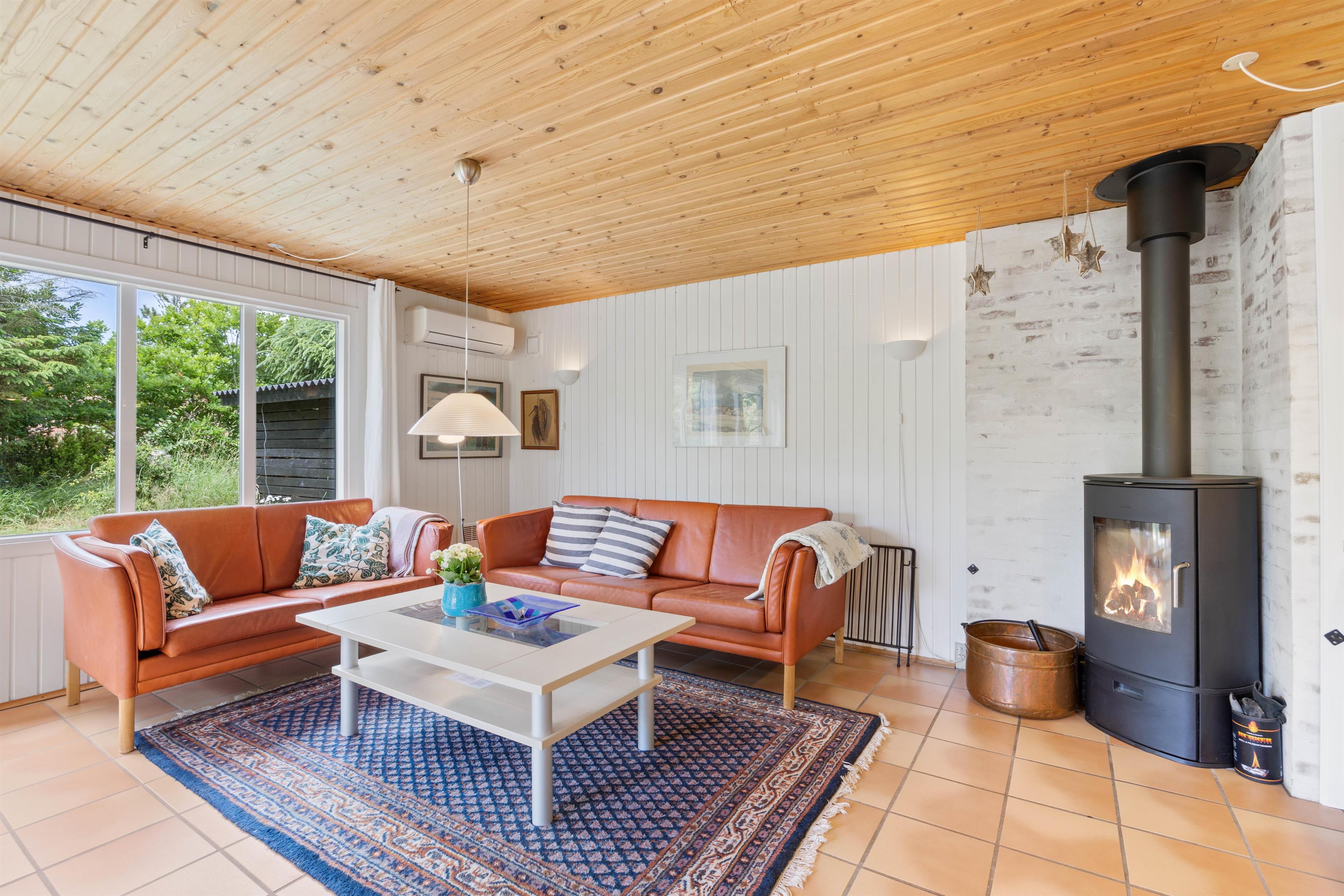 Når I træder ind i sommerhuset på Koglevej i Lodbjerg Hede, vil I straks blive mødt af den hyggelige sommerhusatmosfære, som huset emmer af. Her findes alle de elementer, som man forbinder med sommerhus: panelbeklædte vægge, lun brændeovn, hyggelige kroge og behagelige møbler, hvor man kan slappe af i.