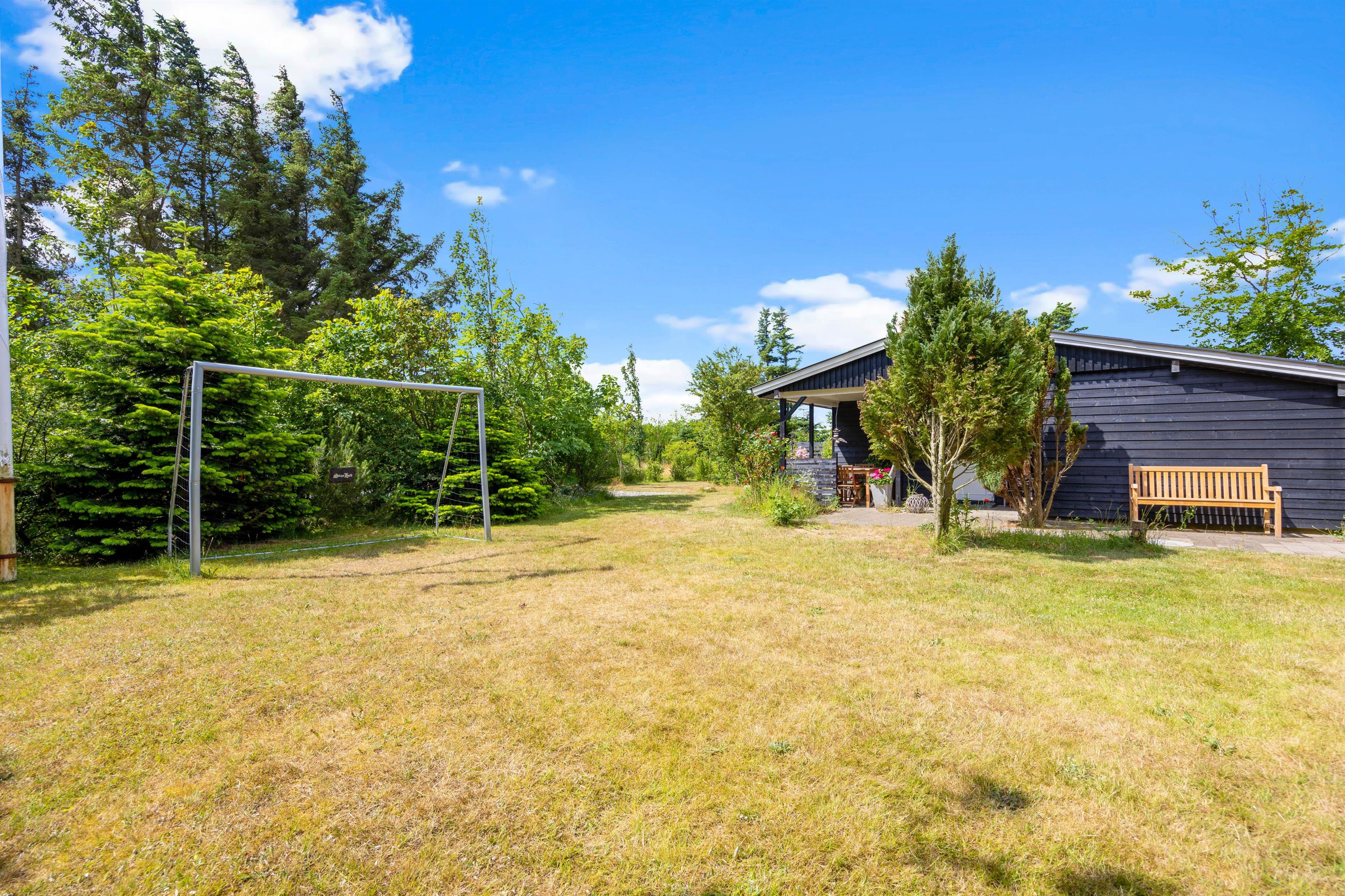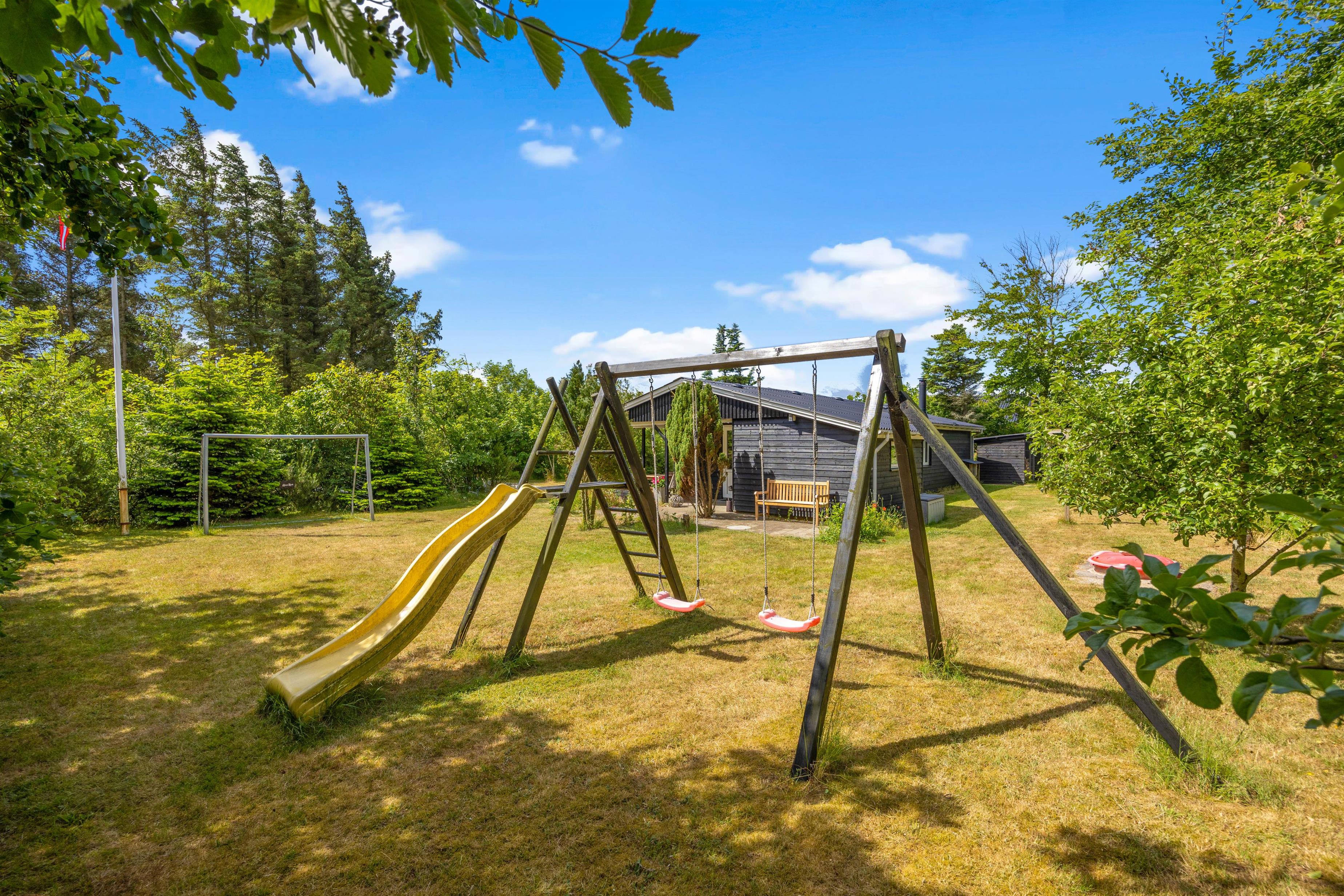 Selve grunden er omgivet af grønne træer og buske, der skærmer for vind og vejr, men som også giver ekstra privatliv. Her findes en dejlig, stor grøn plæne, der er oplagt til boldspil og vandkamp. På plænen finder I også både gyngestativ med rutsjebane, en sandkasse og et fodboldmål. Så børnenes underholdning er grangiveligt sikret.