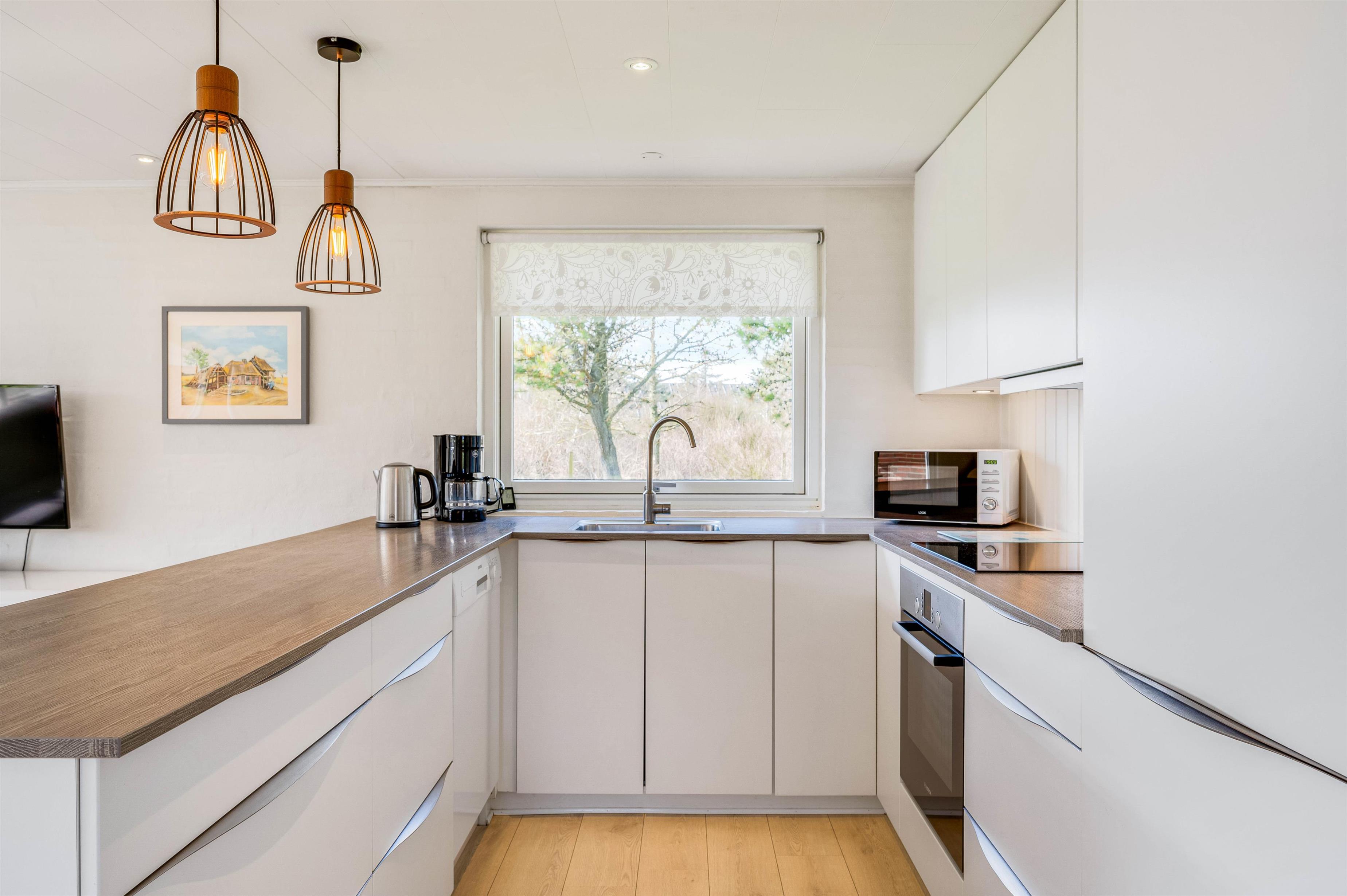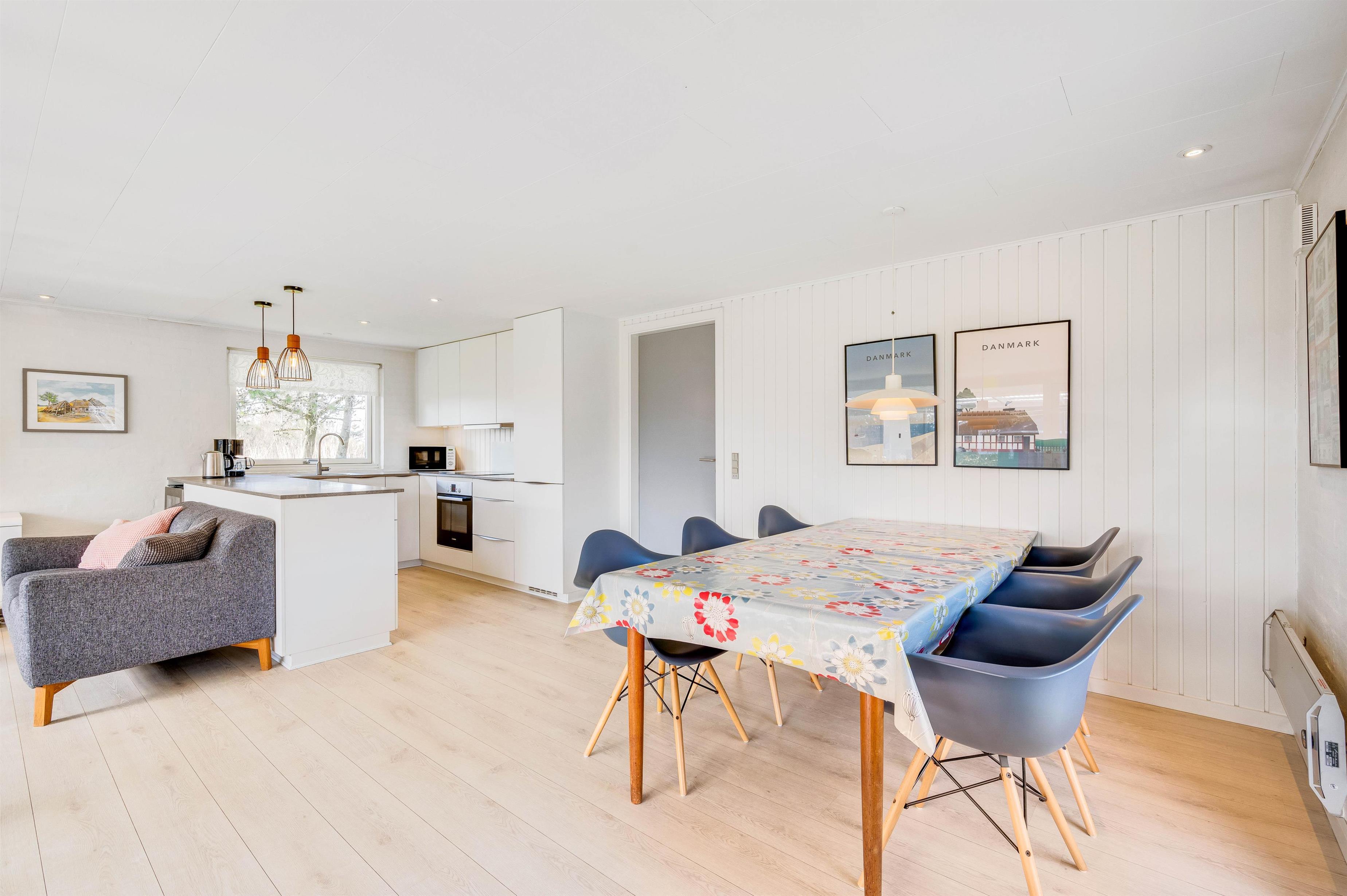 Sommerhuset består af et dejligt køkkenalrum, hvor spisestue, stue og køkken smelter sammen i én enhed. Det gør rummet til det naturlige samlingspunkt, hvor I kan være beskæftiget i forskellige afdelinger, men alligevel er samlet i samme rum. Det føles trygt og intimt. I stuen står de behagelige sofaer klar til at blive indtaget til filmaftener med popcorn, mens I kan nyde den knitrende pejs i baggrunden.