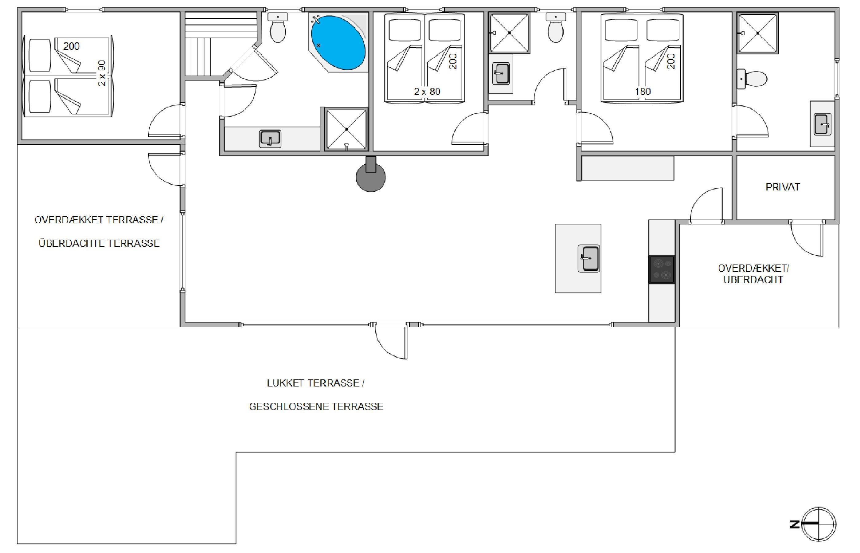 Feriehusets 3 badeværelser sørger for, at der aldrig er kø til toilettet, og det er også på det ene badeværelse, I får mulighed for at nyde lidt ekstra wellness i saunaen og badekarret. Der findes næppe bedre måder at tanke nye kræfter på efter en dag i den friske havluft!