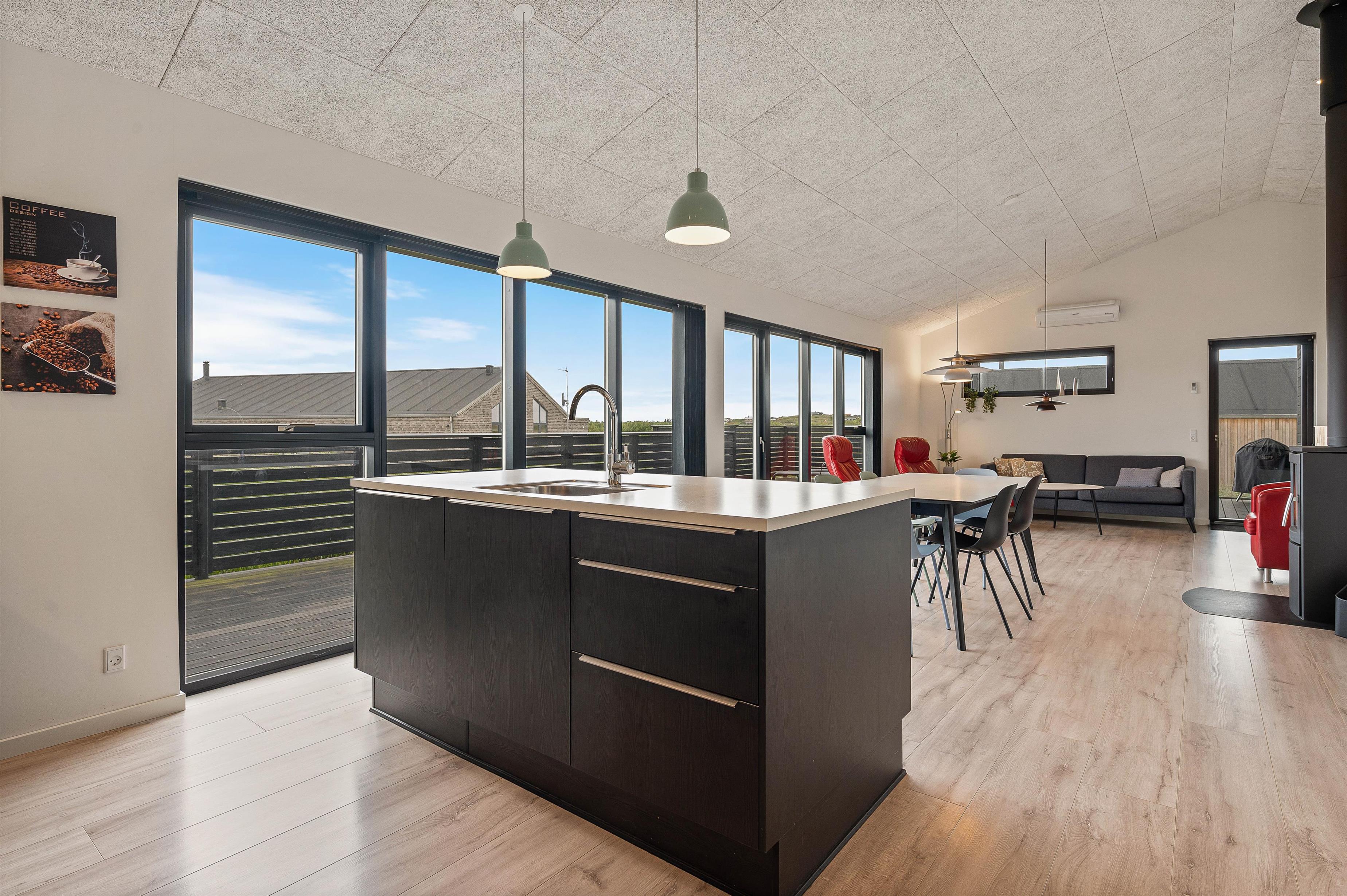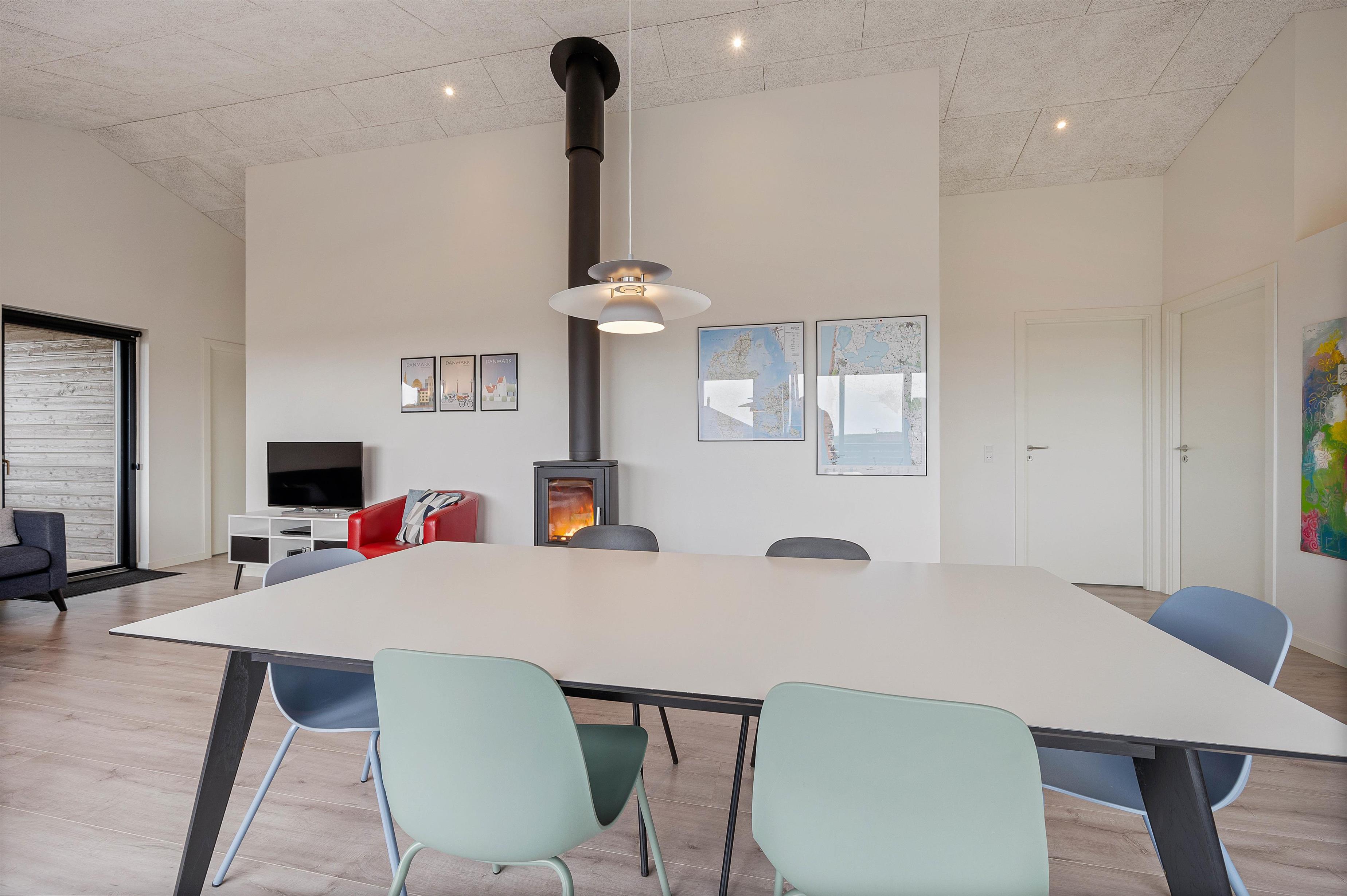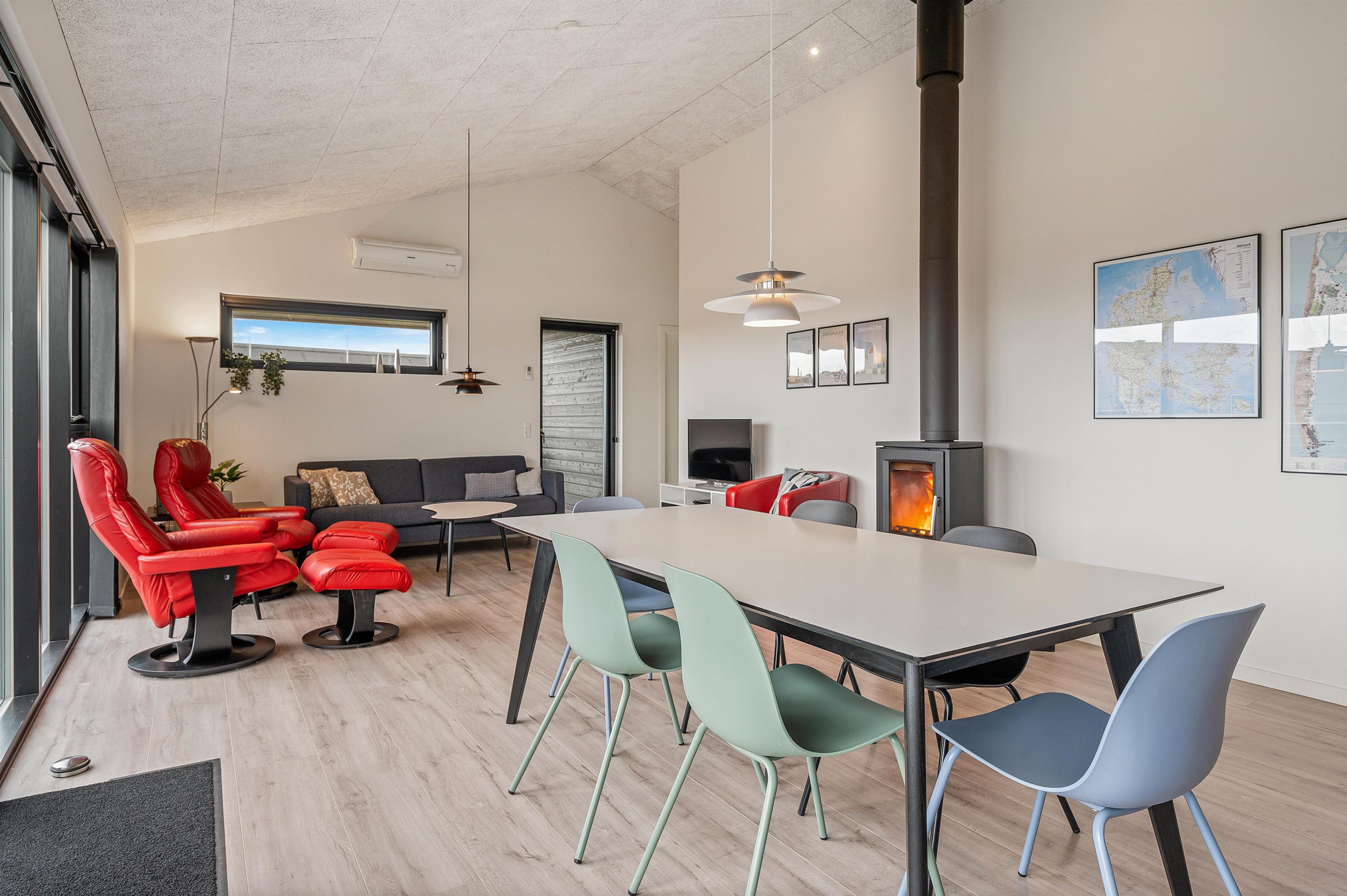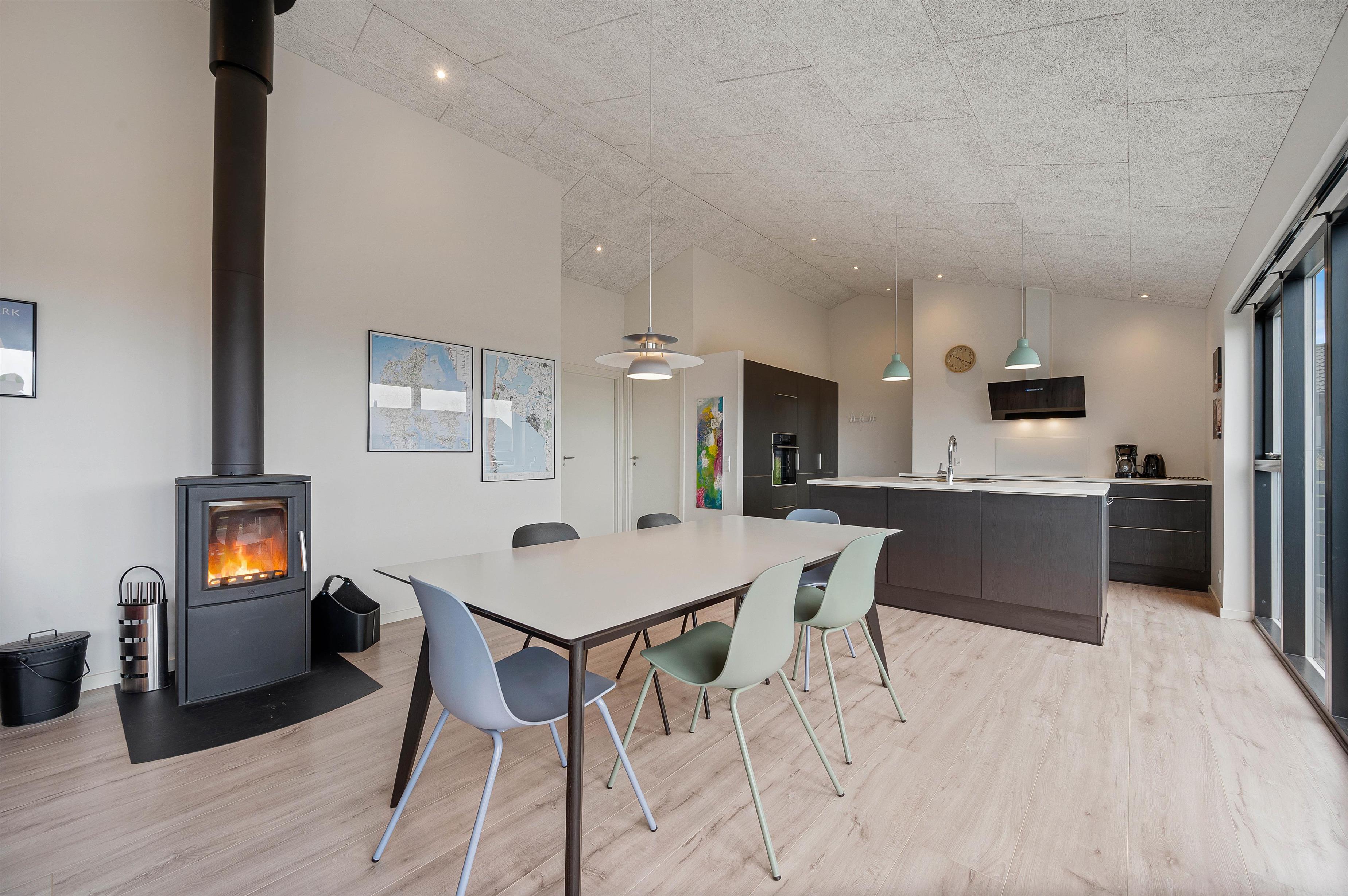Opholdsrummet bliver feriens mødested. Her er stue, spiseafdeling og køkken samlet i ét stort fællesrum med brændeovnen i centrum. Når dagen går på hæld, og mørket sænker sig over jer, sørger de knitrende flammer for den hyggeligste feriestemning.