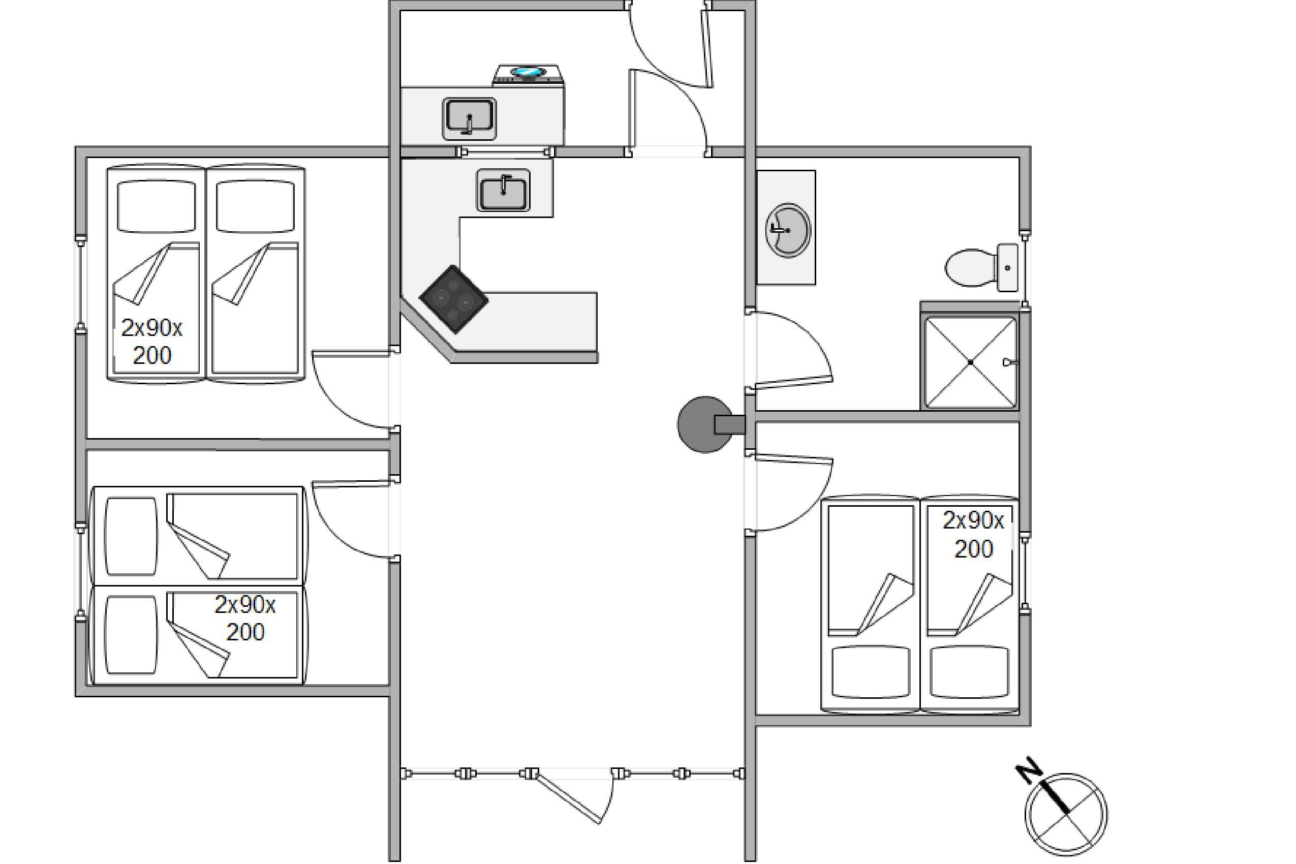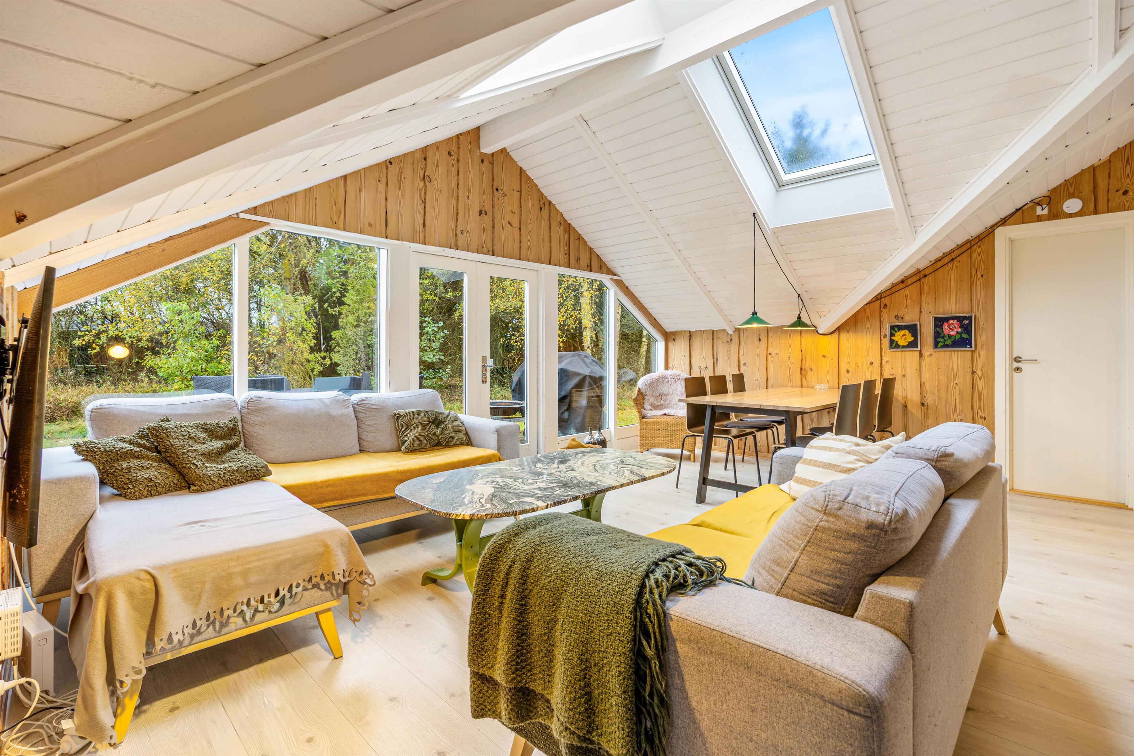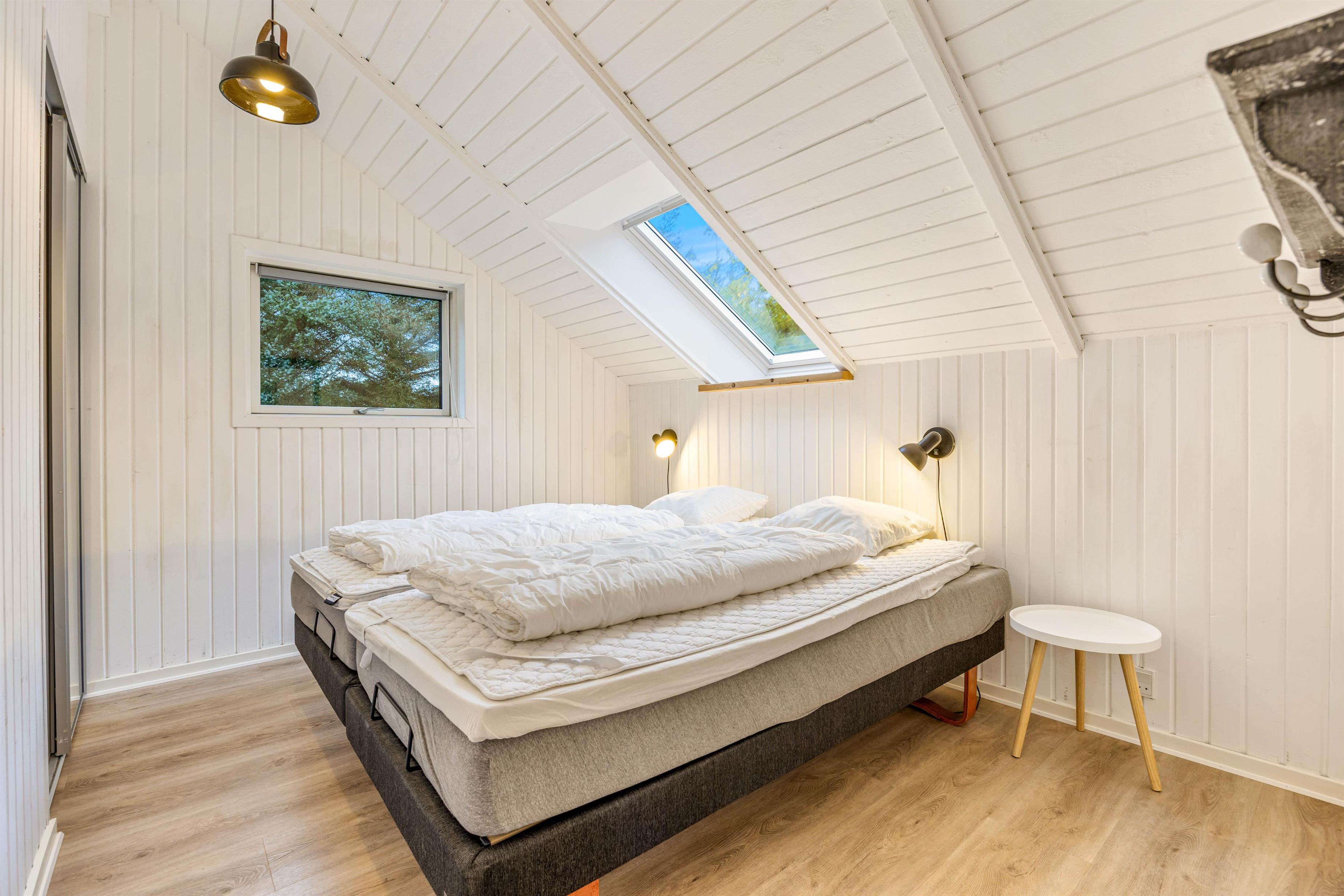Sommerhuset rummer 3 soveværelser med dobbeltsenge og ovenlysvinduer, alle med ovenlysvinduer, så I kan falde i søvn under den klare stjernehimmel. Det giver en unik og rolig overnatningsoplevelse med naturen lige over hovedet.