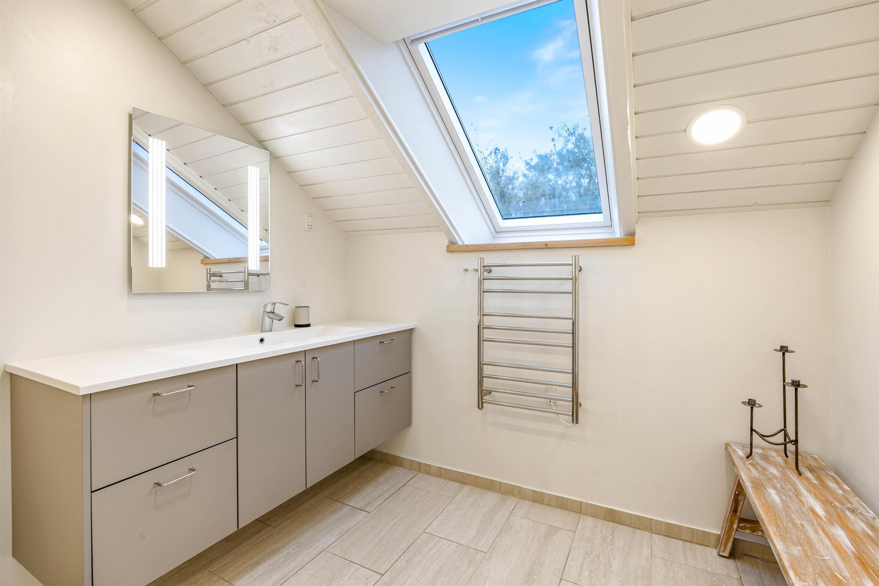 Sommerhuset kombinerer den hyggelige stil med moderne faciliteter som gulvvarme på badeværelset, opvaskemaskine og tørretumbler – for en nem og komfortabel ferie.