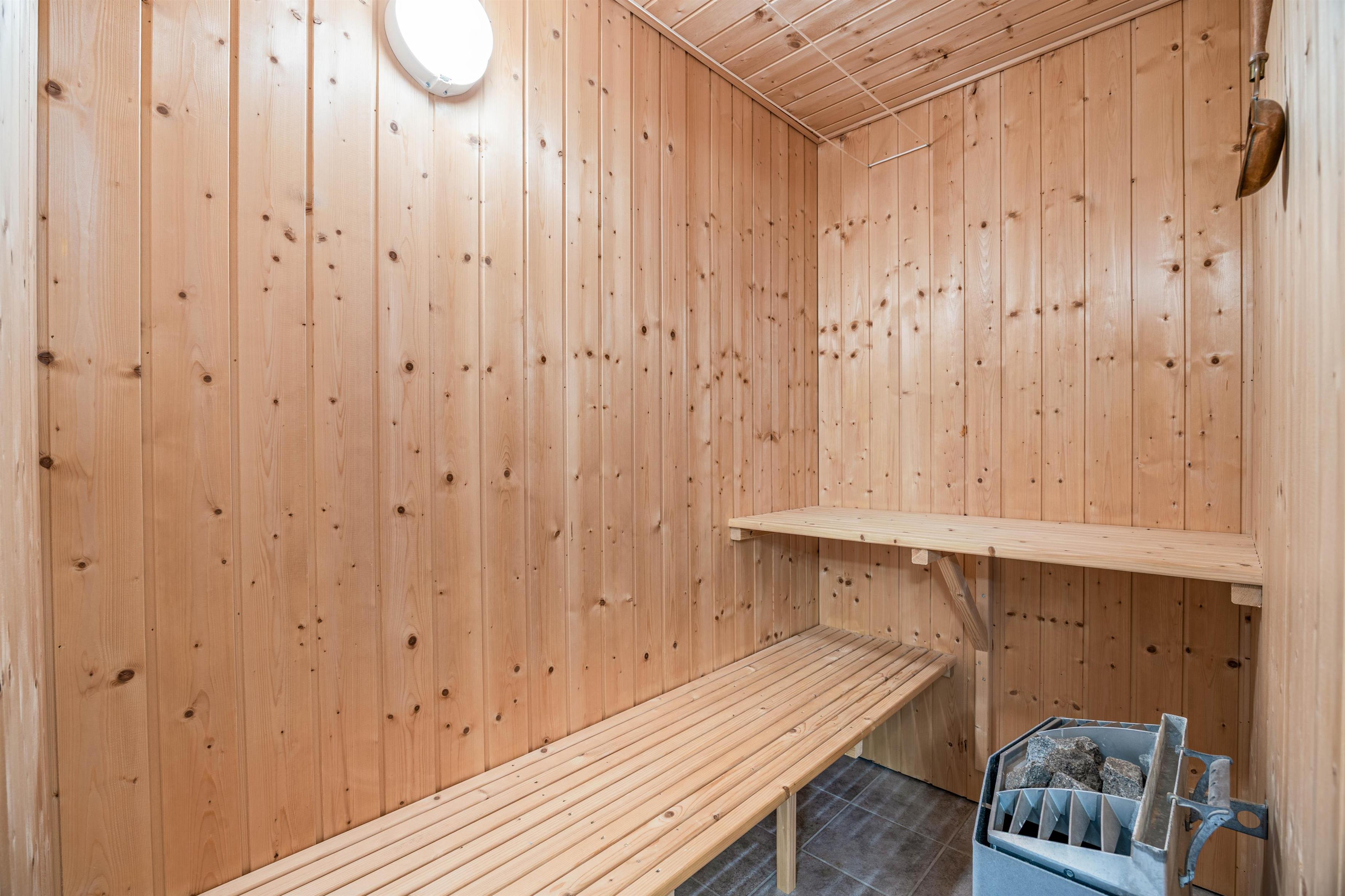 For ekstra afslapning er badeværelset udstyret med en sauna, hvor varmen hjælper med at løsne musklerne og lade sindet falde til ro efter en aktiv dag. Atmosfæren fremmer velvære og luksus og gør opholdet endnu mere behageligt. For ekstra bekvemmelighed er der praktiske hverdagsfaciliteter til rådighed som vaskemaskine og tørretumbler.