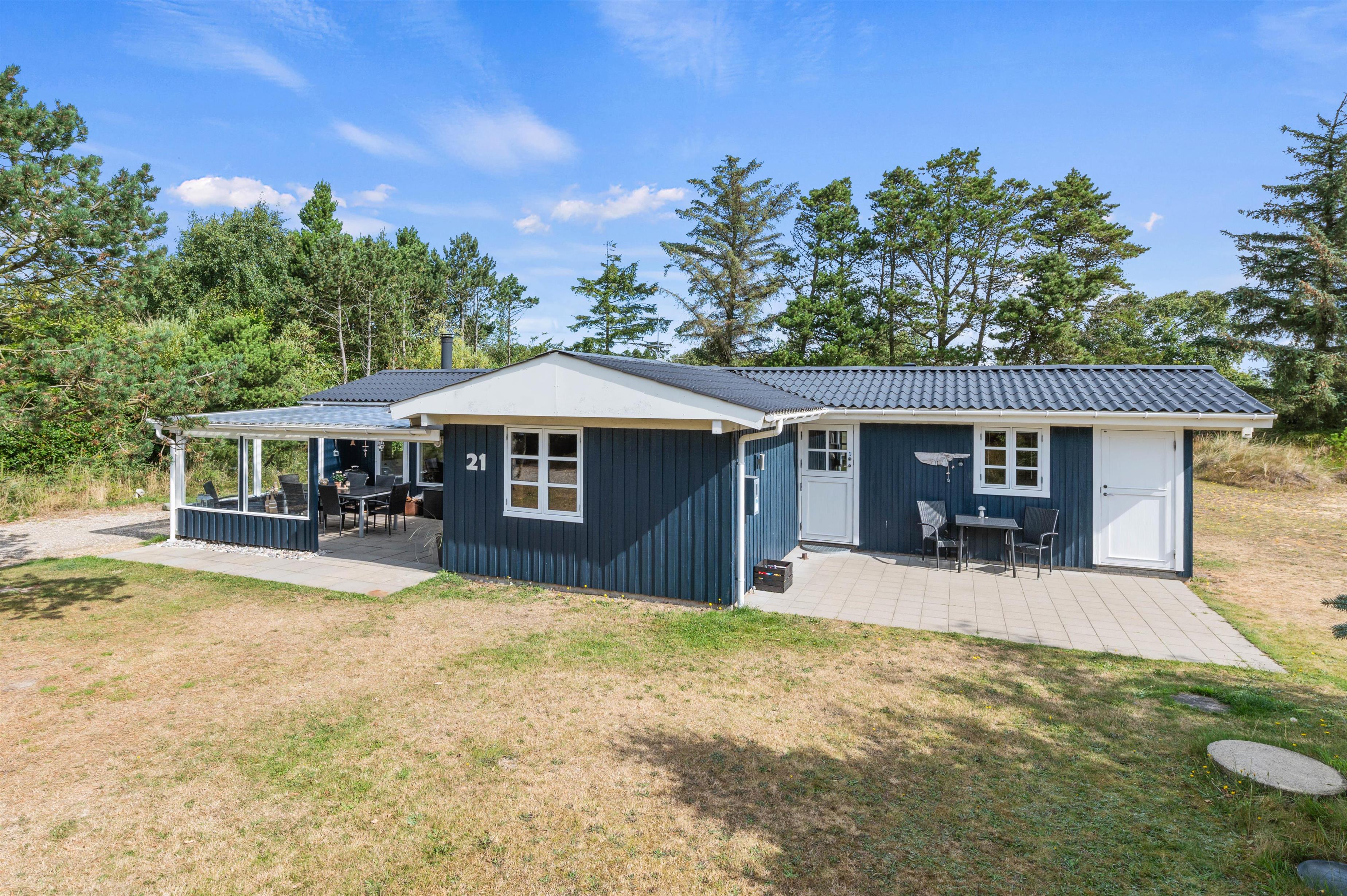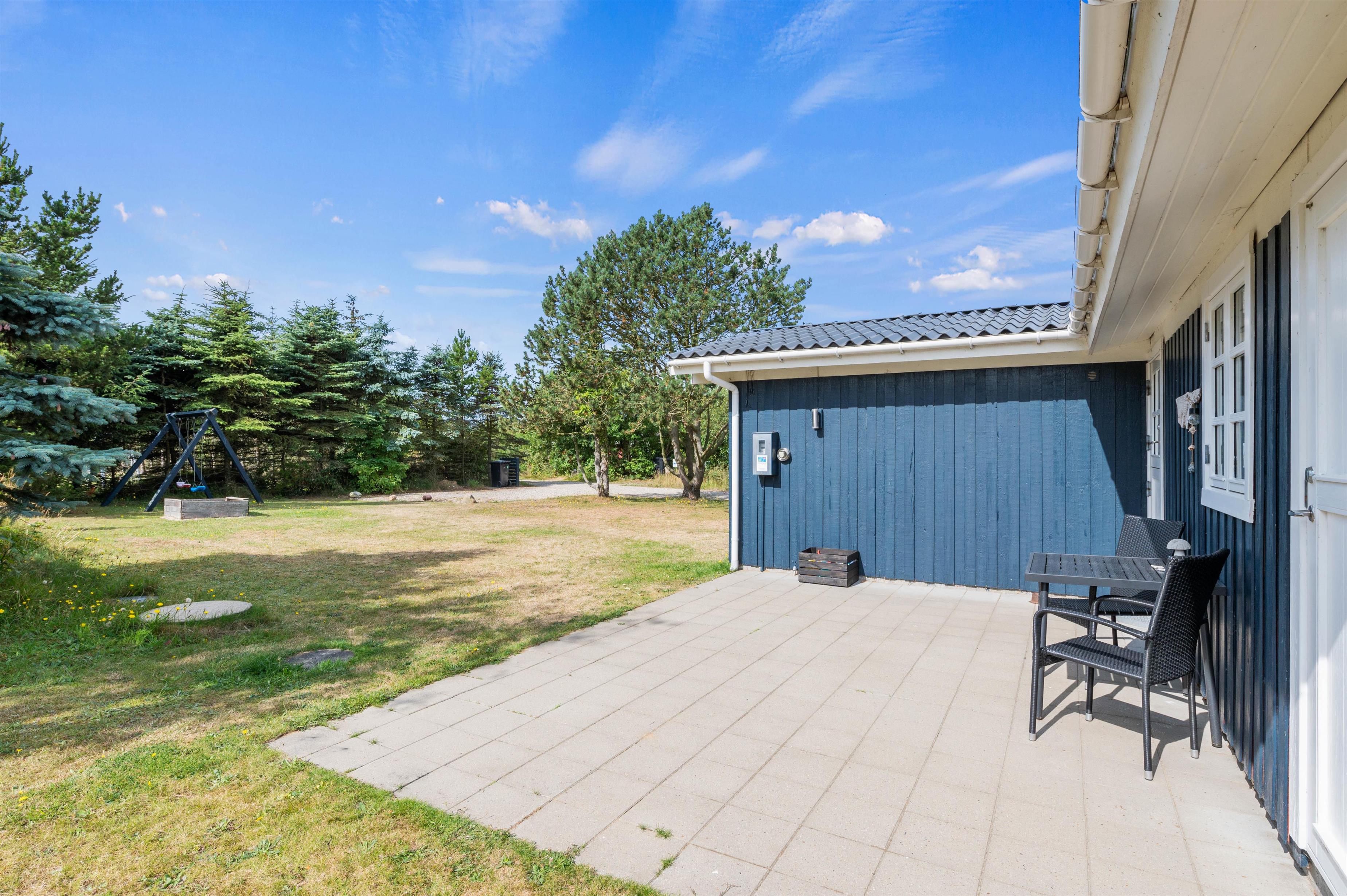 Feriehuset ligger på en stor naturgrund for enden af en rolig stikvej, og rundt om huset finder I 3 skønne terrasser, hvorfra I kan nyde de smukke omgivelser og den friske luft dagen lang. Den overdækkede og afskærmede terrasse fungerer næsten som udestue og giver jer både ly og læ i alle årets måneder. Rundt om havebordet kan I drikke en nybrygget kop kaffe, mens I holder øje med børnene, som leger på den store græsplæne med gyngestativ, sandkasse og fodboldmål.