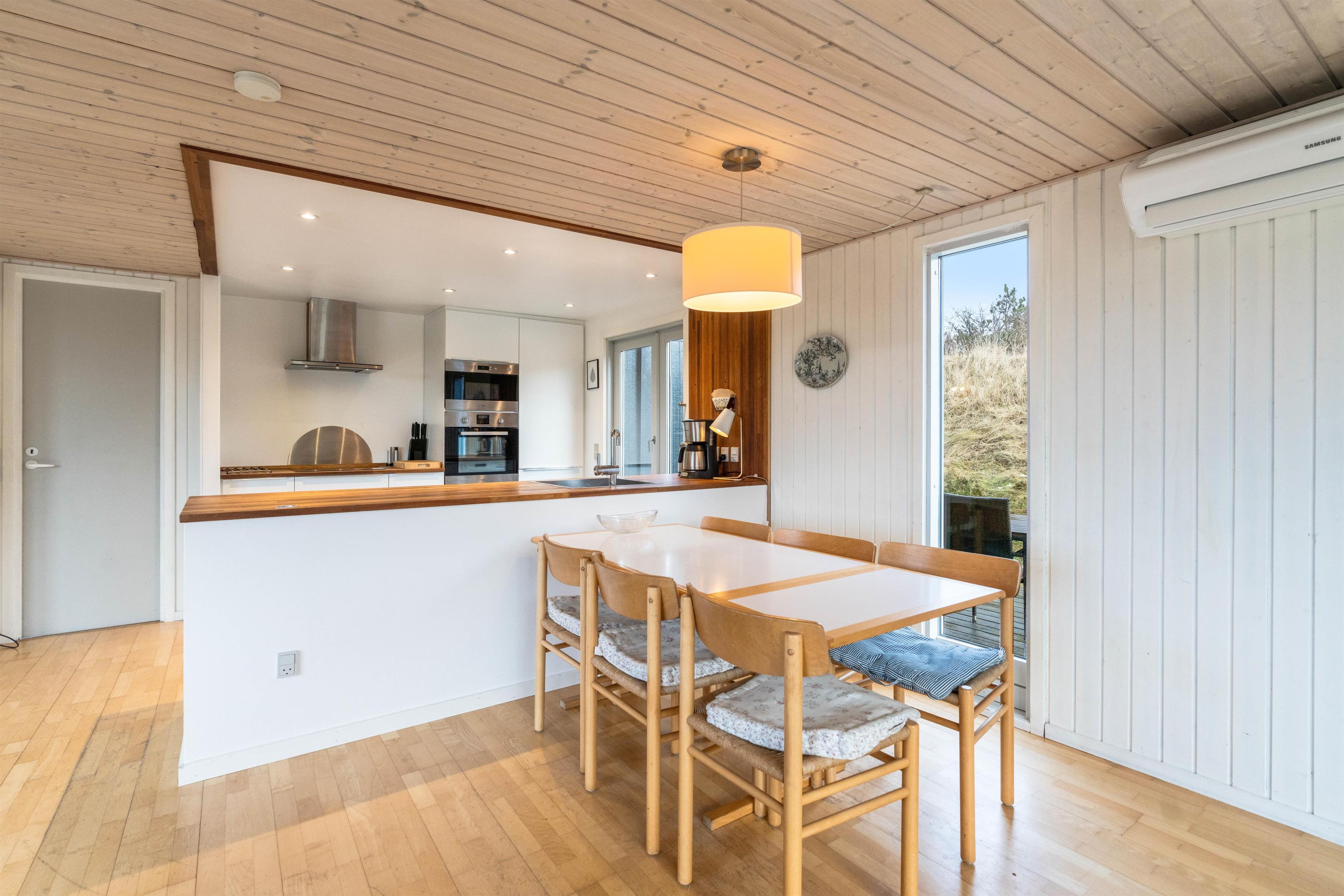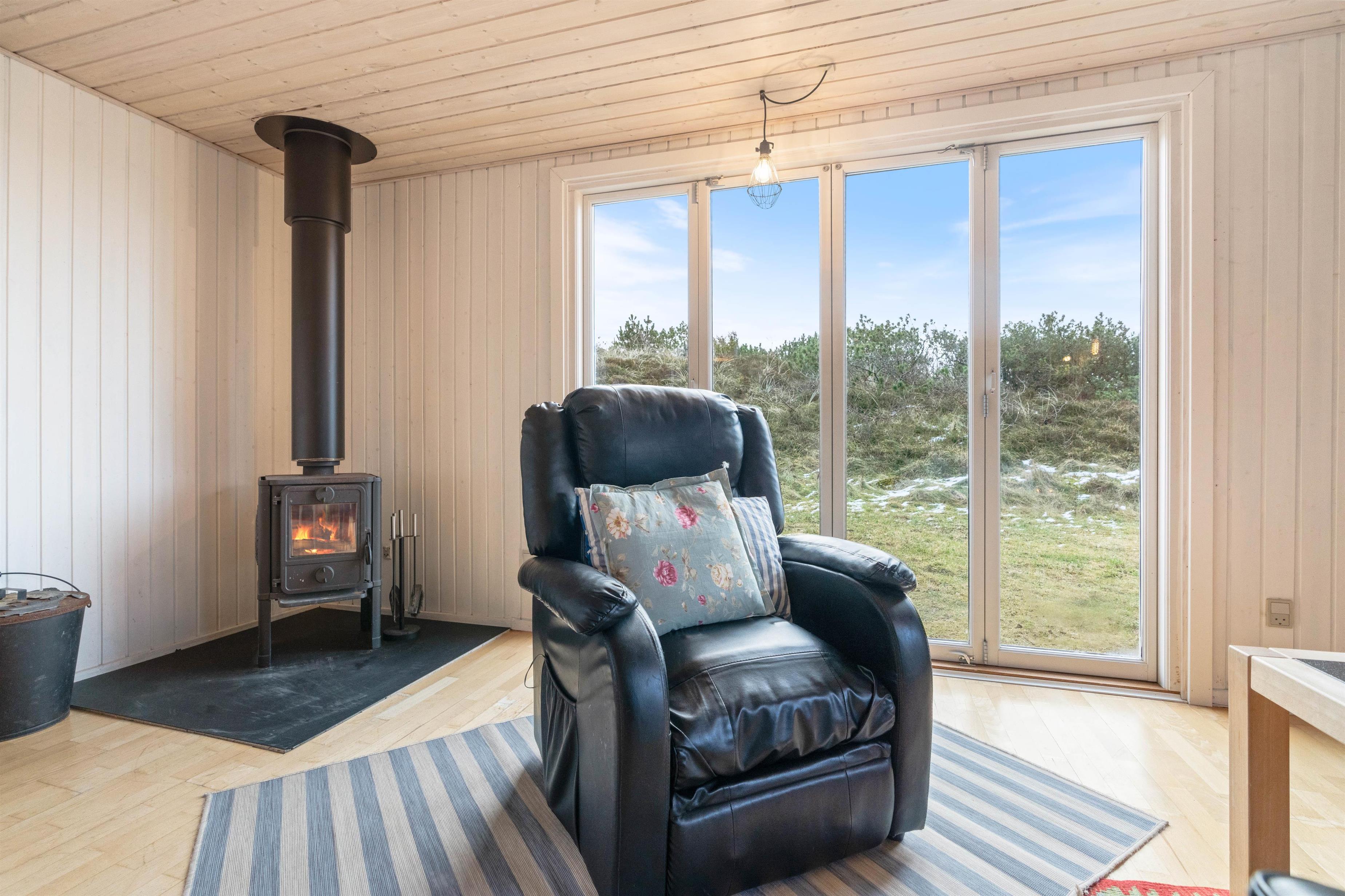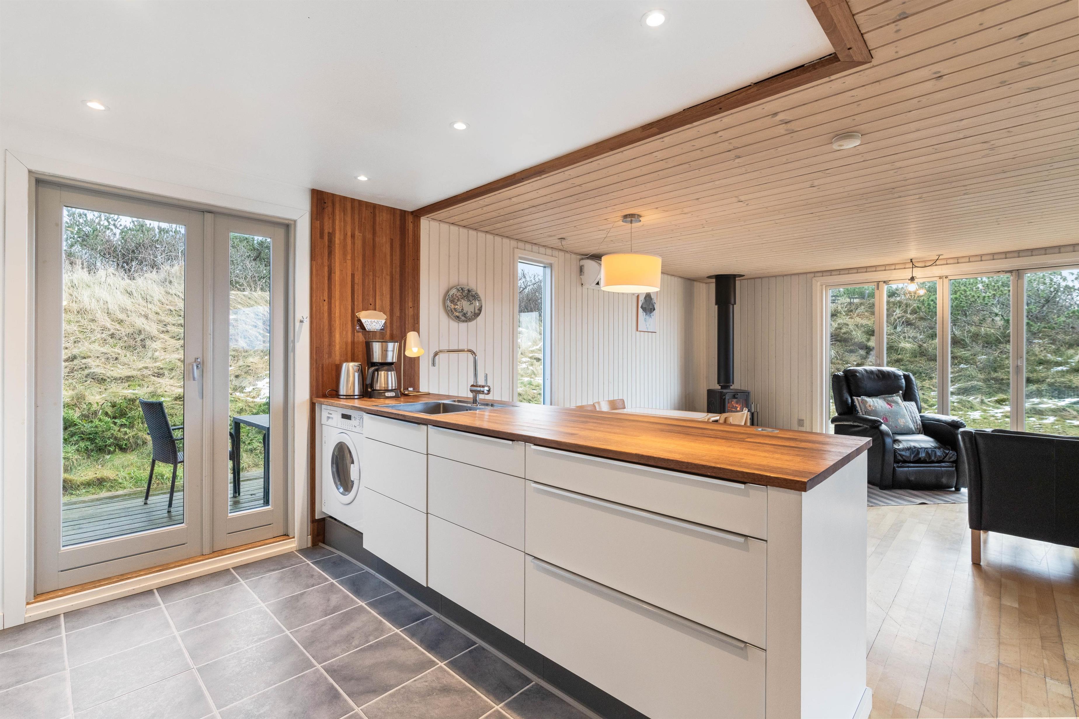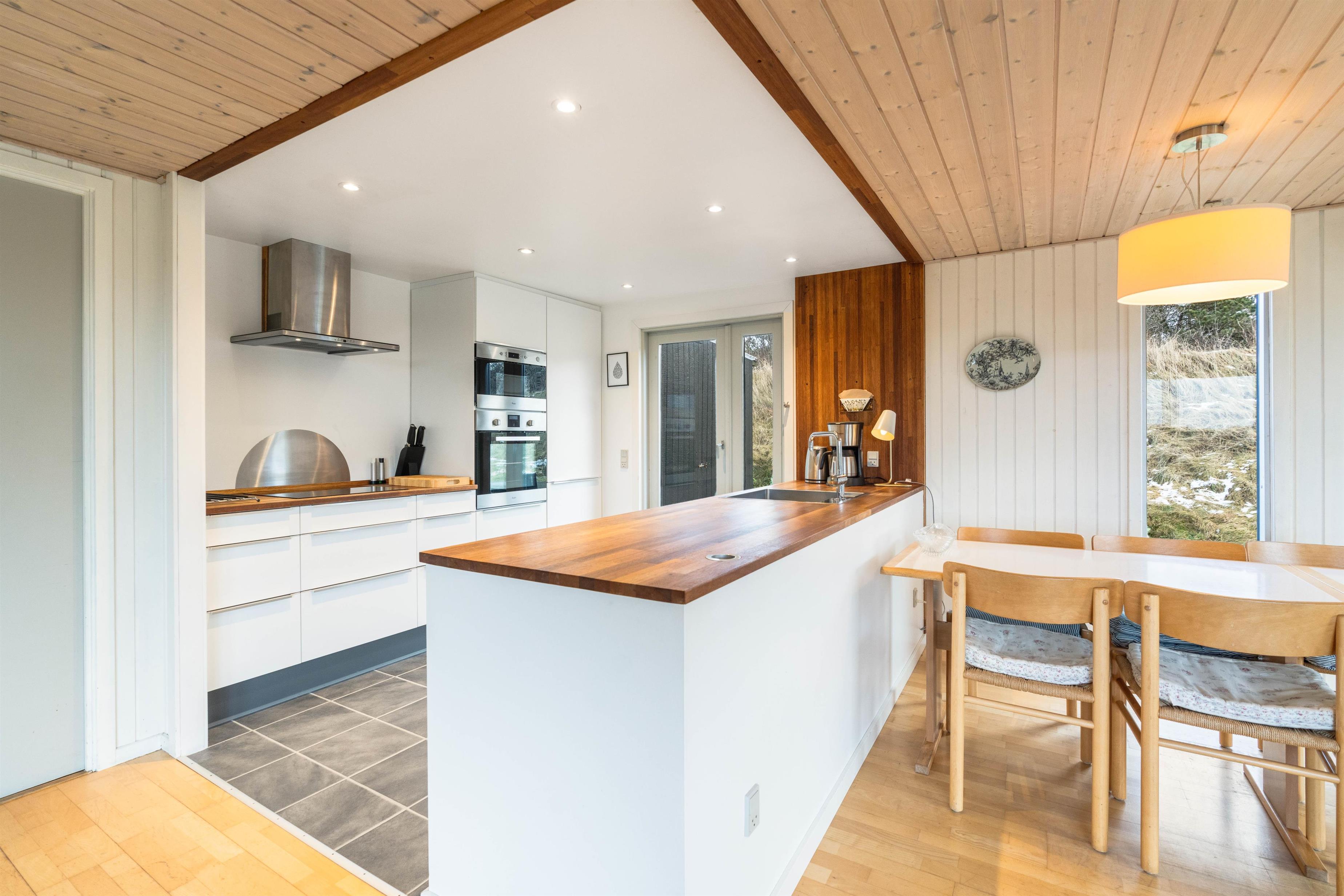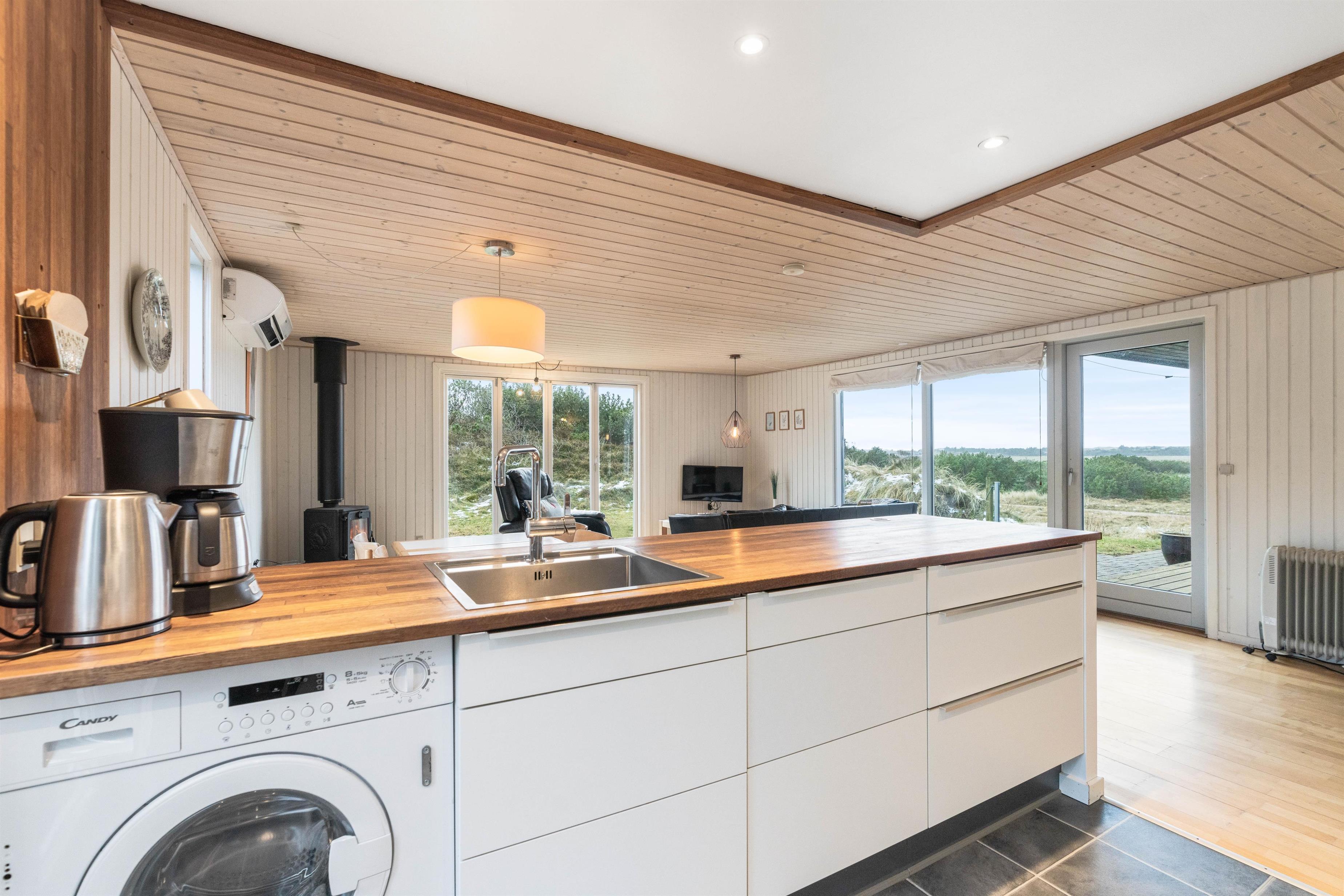 Feriehuset ligger lidt forhøjet så du kan nyde en flot udsigt til klitterne mod vest. Det strækker sig over 90 veludnyttede kvadratmeter, og har 3 fine værelser, hvilket giver jer god plads til at fordele jer i huset. Sommerhusets hjerte må dog siges at være det det hyggelige køkken-alrum, hvor hovedordene er hygge og velvære. Her er der nogle gode vinduespartier, der ikke mindst sørger for et godt lysindfald, men også sikrer at I har mulighed for at nyde den omkringliggende natur. Som et ekstra plus, kan I tænde op for brændeovnen, der ikke skal bruge lang tid på at sprede en masse god varme og en hyggelig atmosfære.