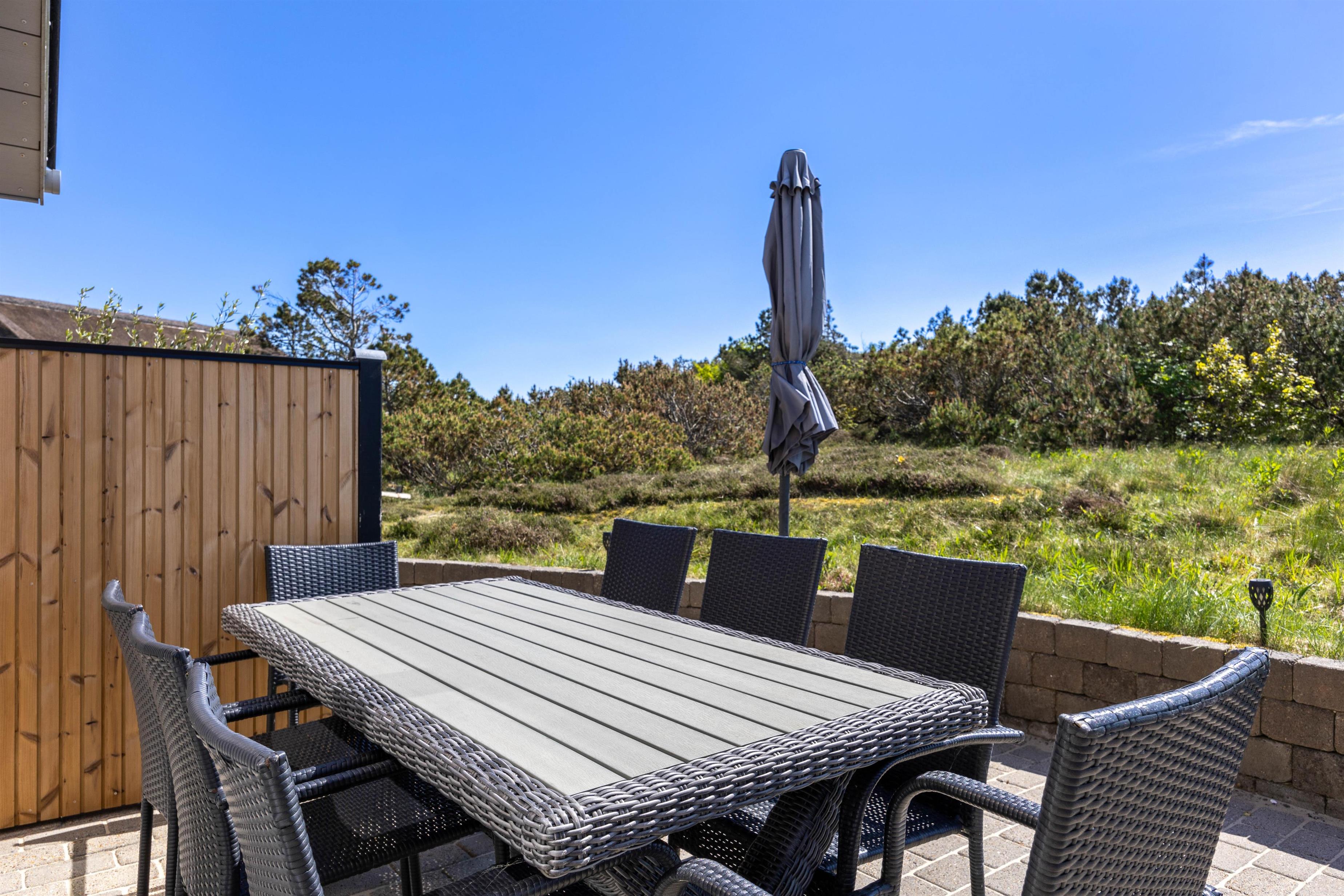 Terrassen går næsten hele vejen rundt om huset, og med både overdækkede og afskærmede sektioner er det nemt at finde en god plads i solen eller læ.