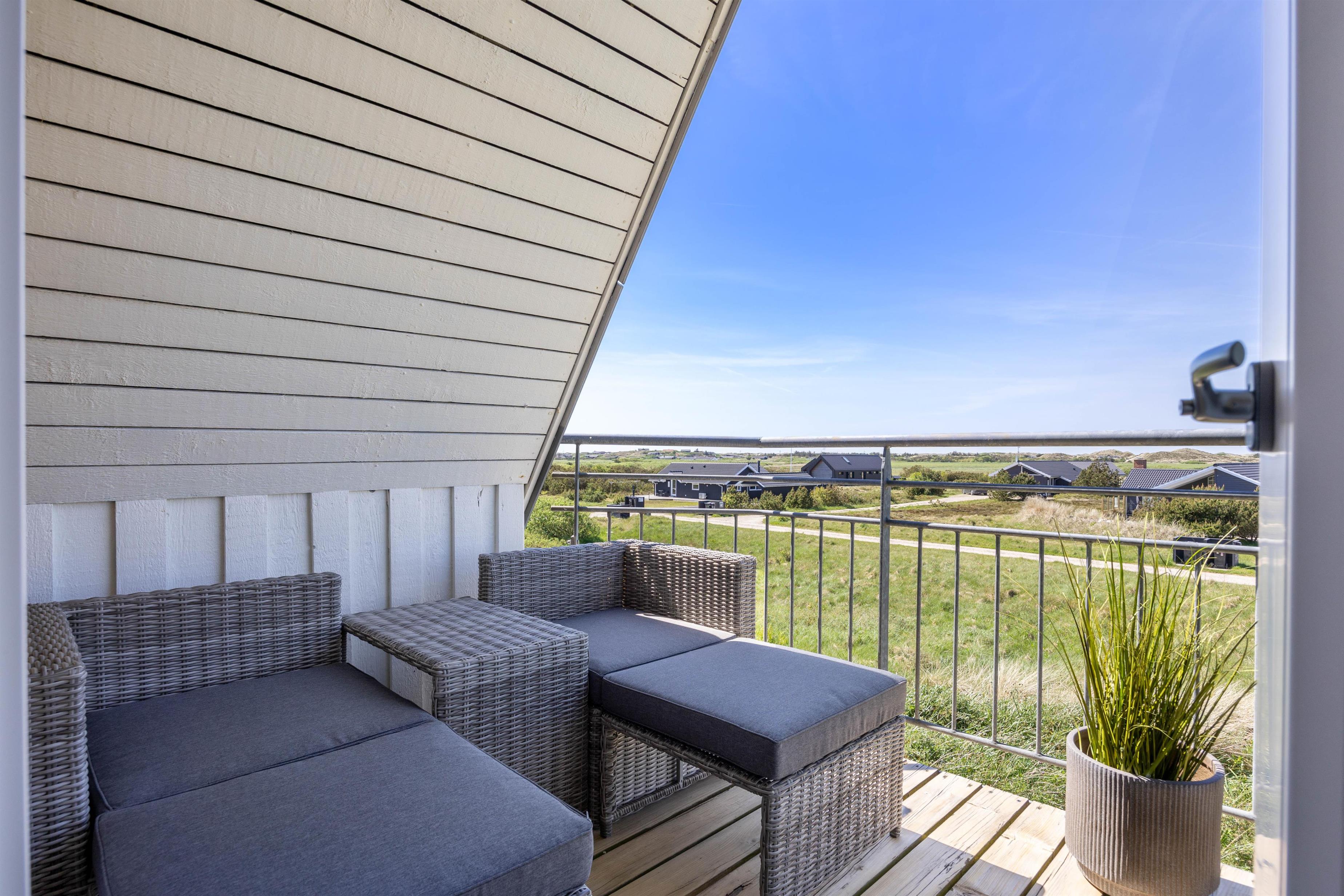 På første sal ligger de to resterende dobbeltsoveværelser. Soveværelset mod vest byder på et ekstra feriehighlight; herfra er der udgang til en altan, med en fantastisk udsigt over ferieområdet og helt til klitterne, hvor det brusende Vesterhav venter på den anden side.