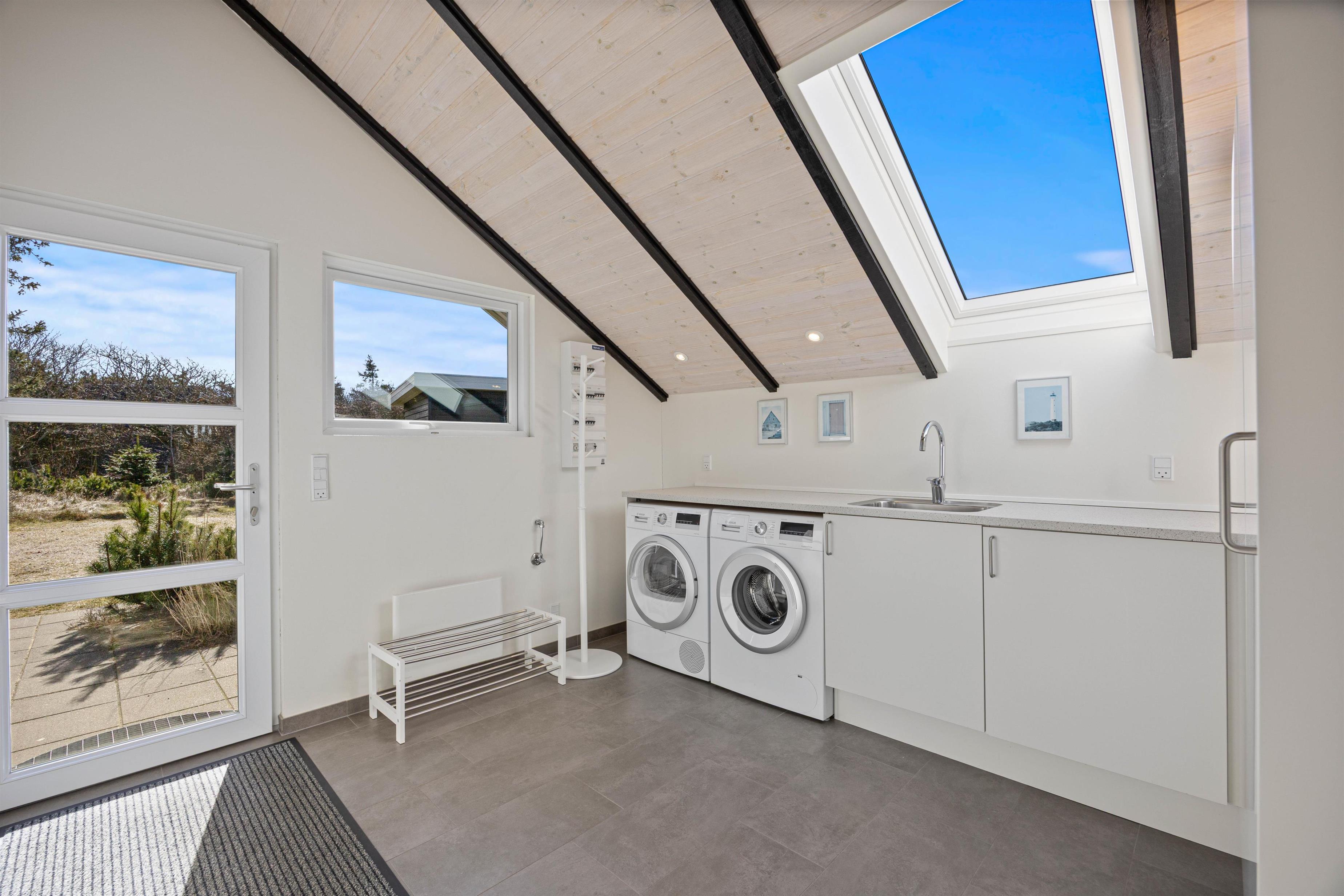 De flotte, lyse trælofter med markerede bjælker og ovenlysvinduer skaber en helt særlig stemning i sommerhuset på Klevevej 13: Den moderne indretning er gennemført, men værner samtidig om følelsen af ferie. Gennem det store vinduesparti i opholdsområdet kommer der masser af lys ind i feroehuset, og synet af den blå himmel kan nydes, imens I samles til morgenmad ved det lange spisebord.