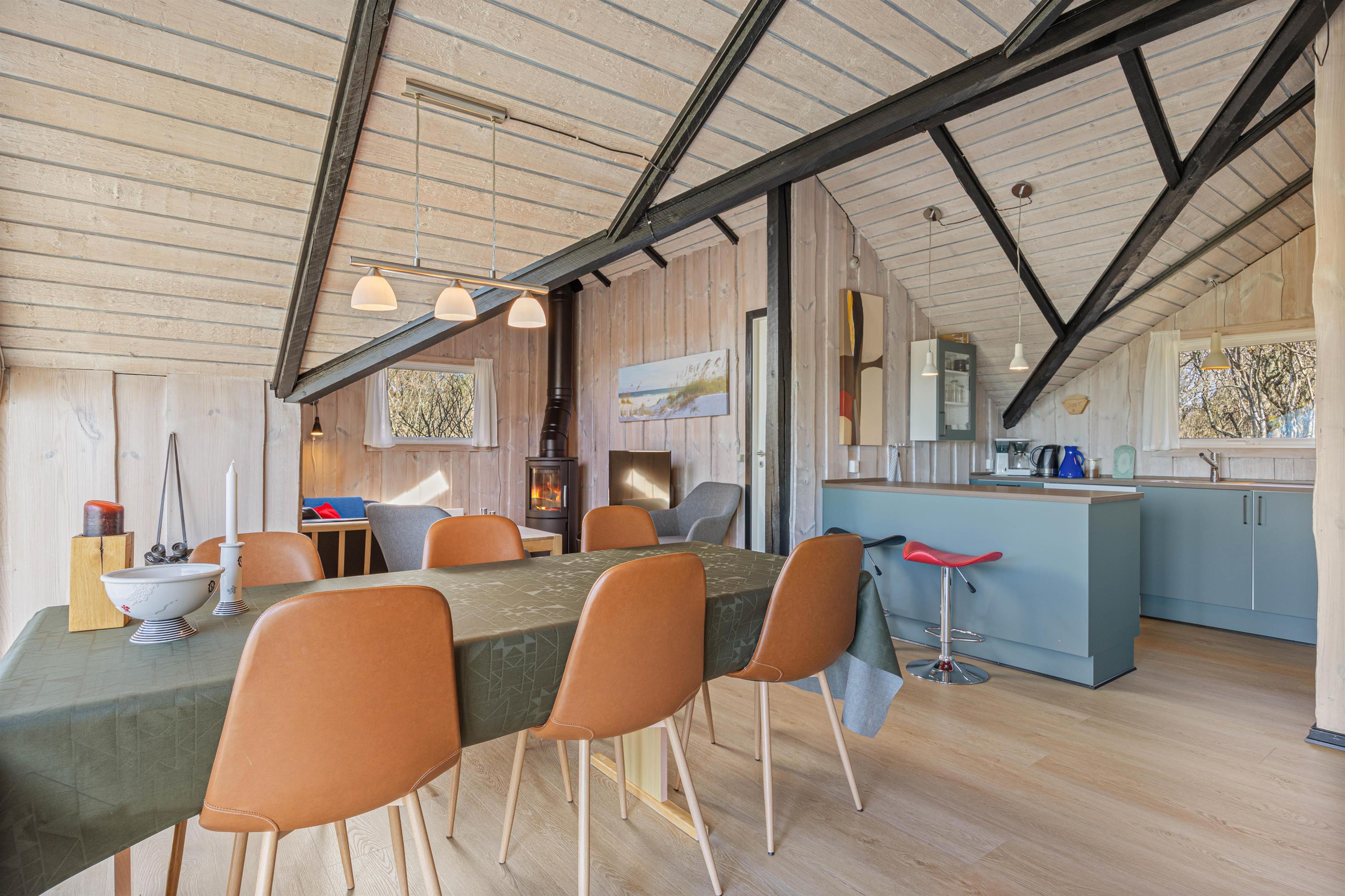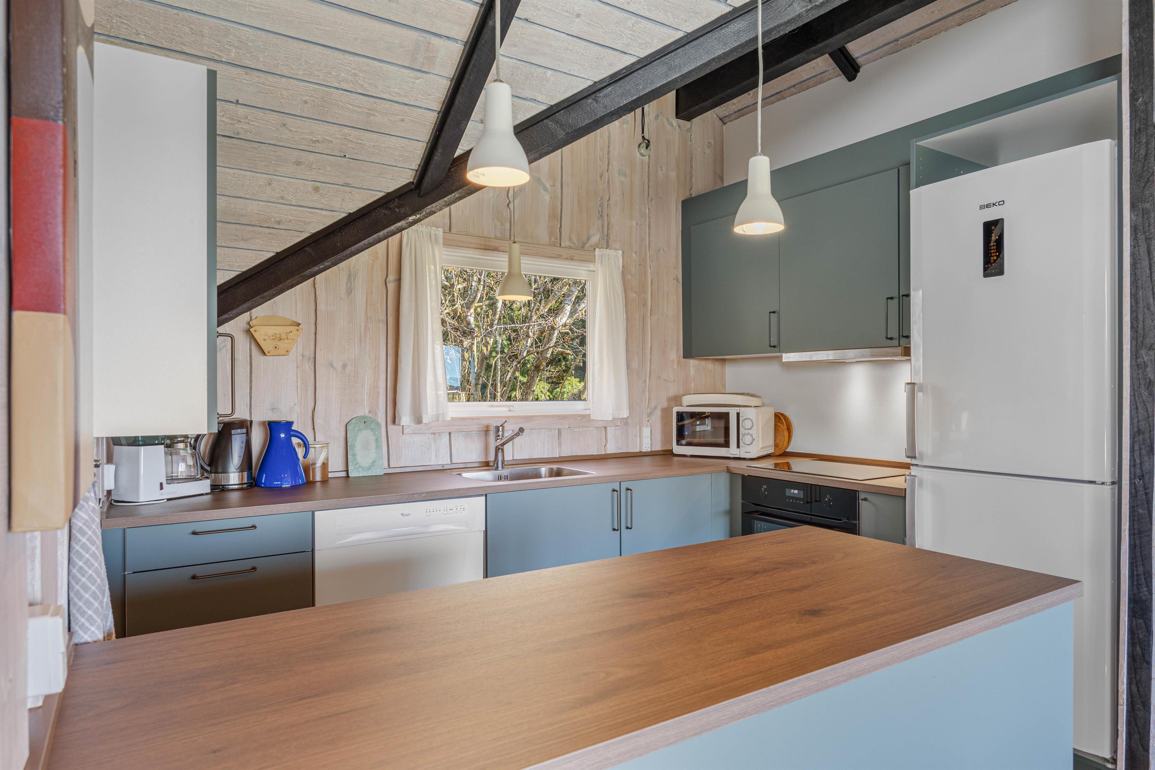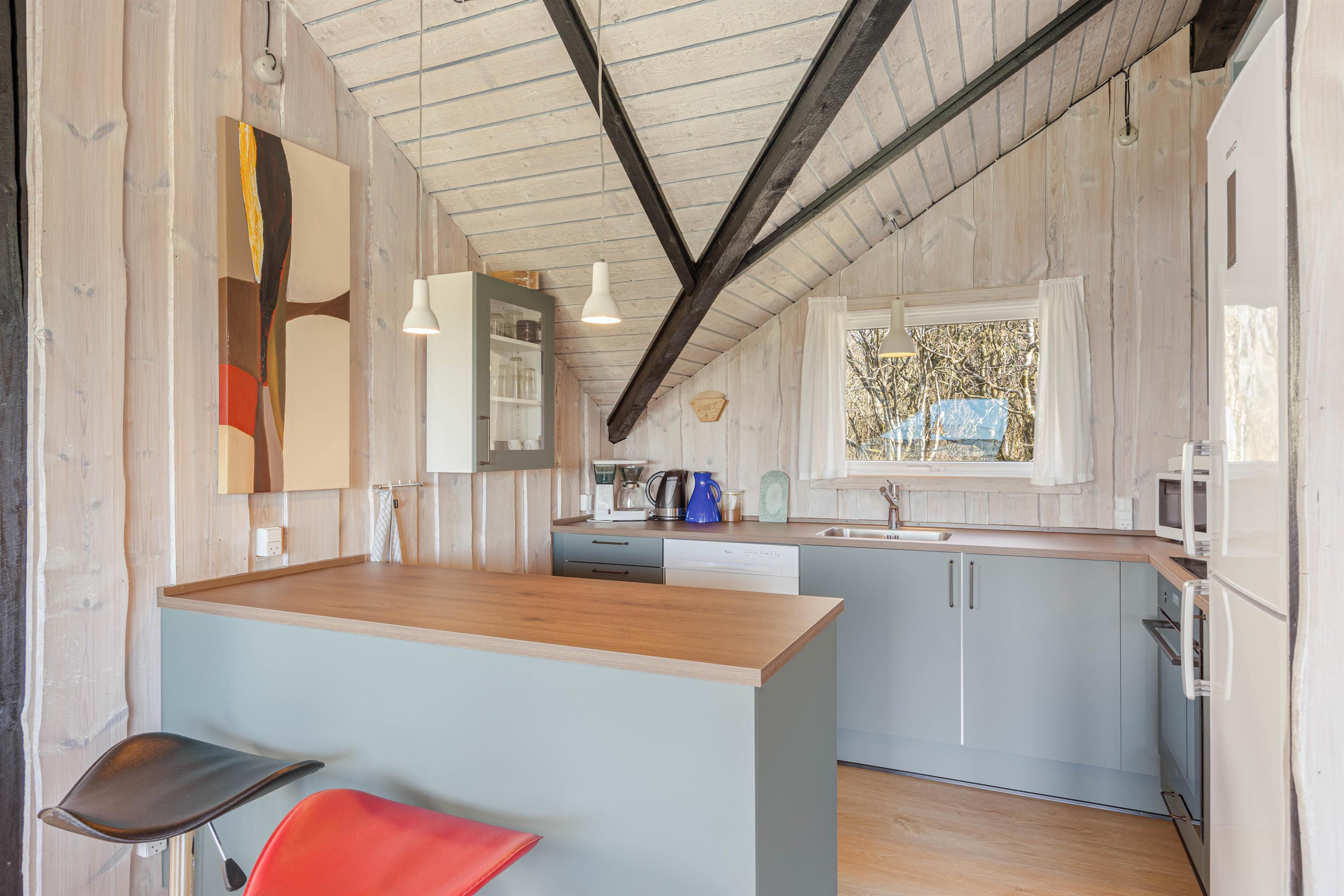I det hyggelige og nyrenoveret køkken kan store og små lave mad sammen om køkkenøen, og oprydningen klares nemt med hjælp fra opvaskemaskinen. De forskellige siddekroge i huset giver alle feriegæster mulighed for at trække sig lidt tilbage eller at starte et fælles brætspil ved et af bordene. For ekstra hygge kan I tænde op for brændeovnen, og mærke varmen brede sig i hele sommerhuset.