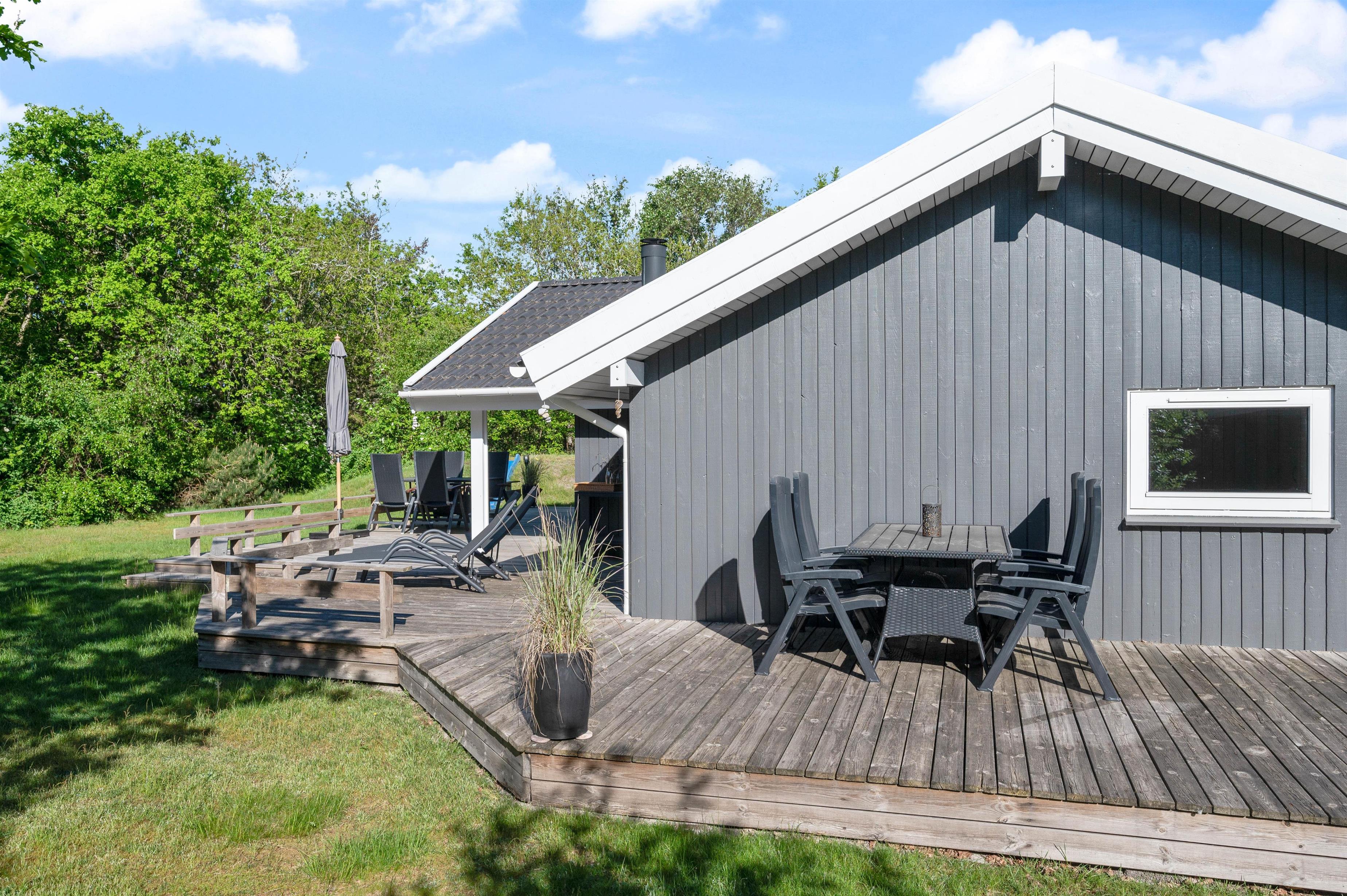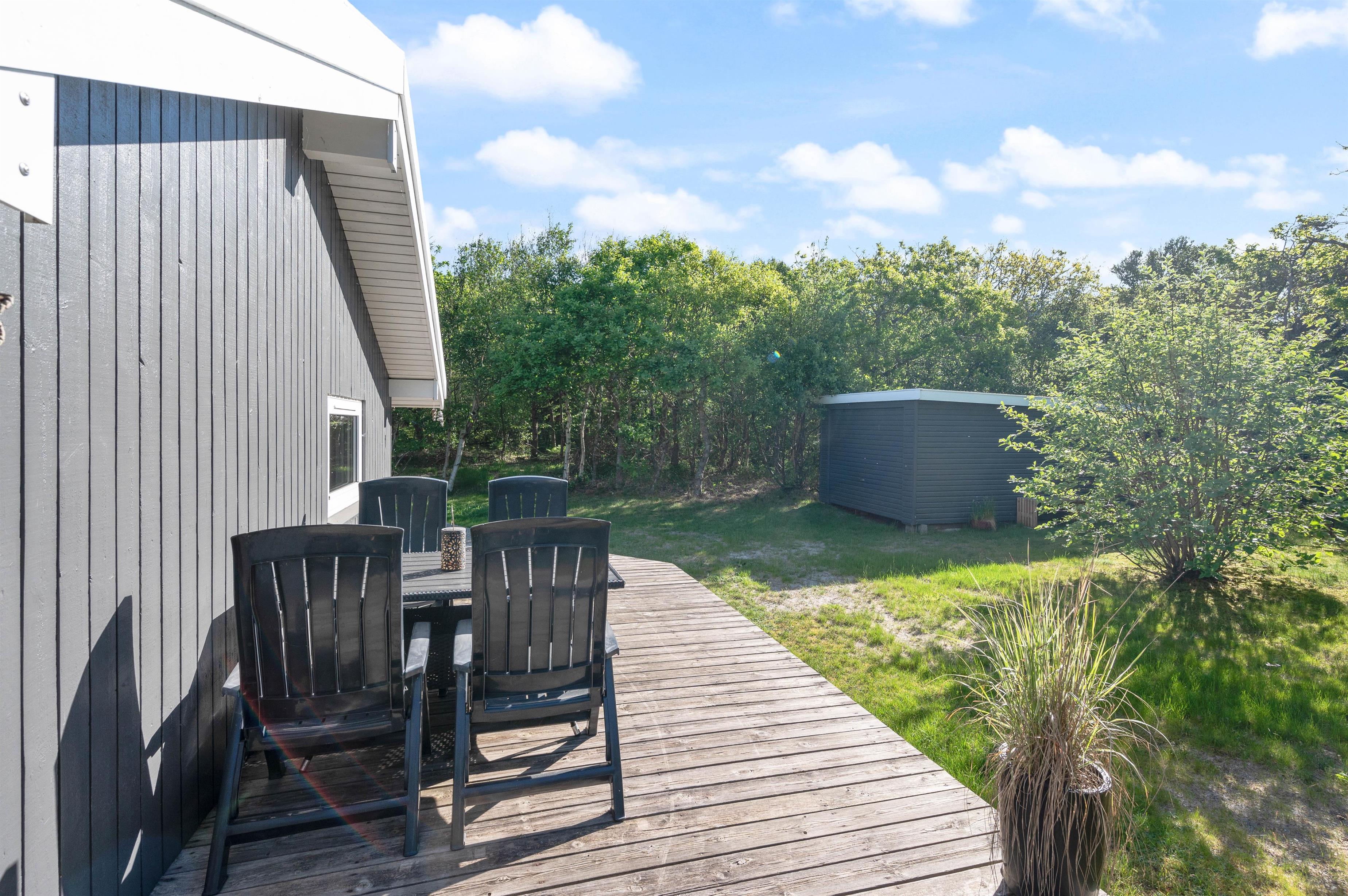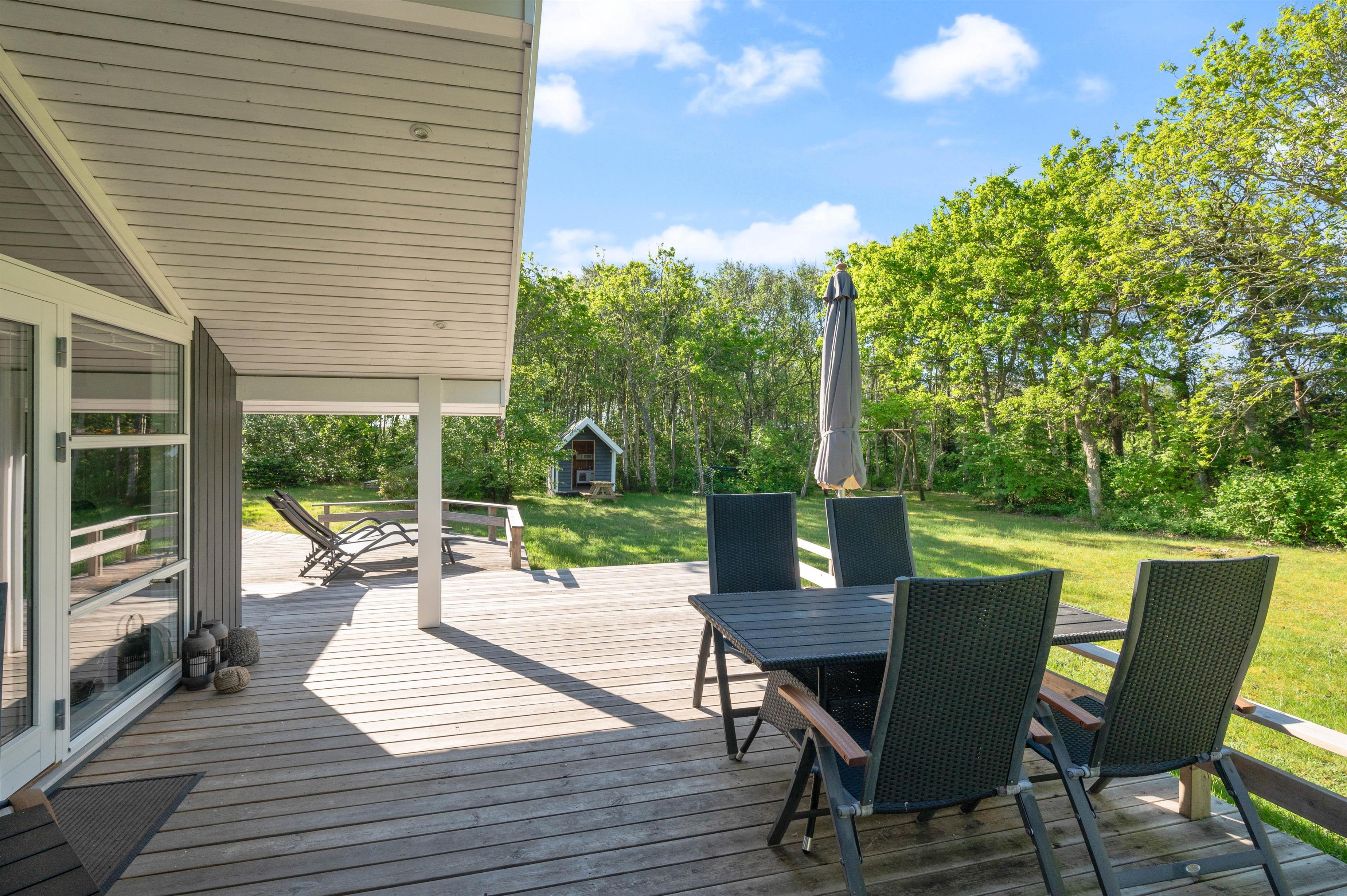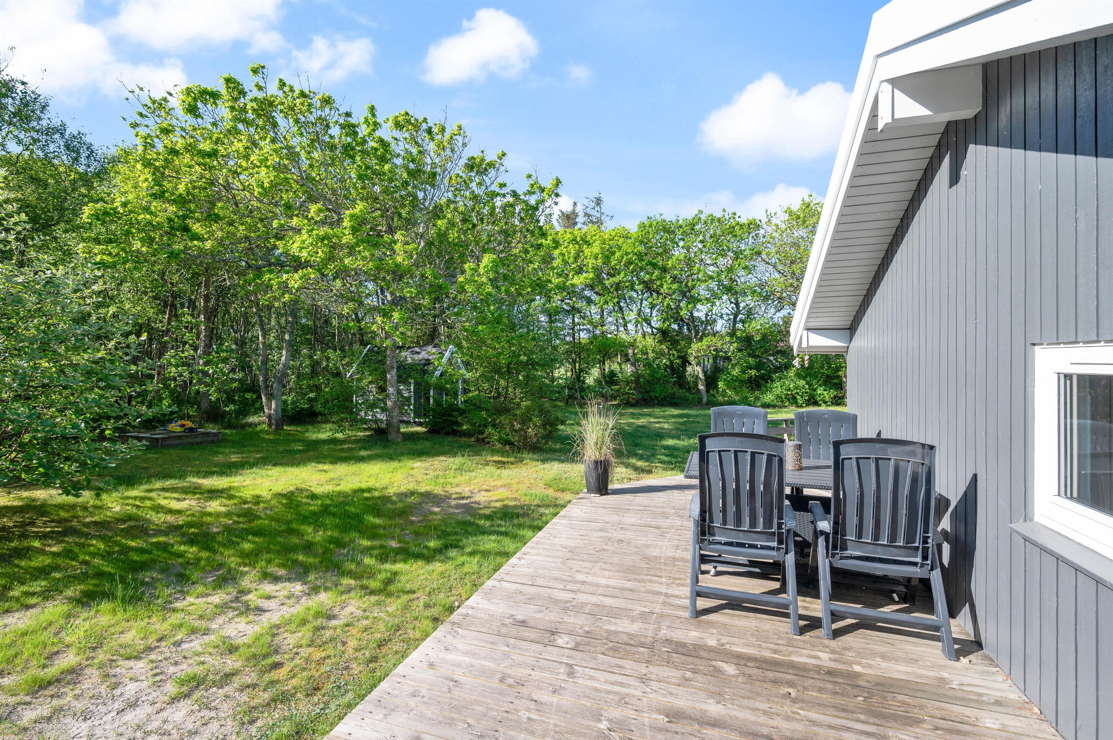 Fra sommerhusets terrasse har I et godt udsyn til legeområdet, således I kan holde børnene under opsyn, mens I selv opholder jer på terrassen. Terrassen består af flere små kroge, er delvist overdækket og bugter sig langs sommerhuset, så I kan flytte jer rundt i løbet af dagen, i takt med at solens placering ændrer sig. I kan med fordel benytte jer af udebruseren, hvis I trænger til at blive kølet lidt ned. Udebruseren kan tages i brug fra april til november måned. På terrassen er der gode havemøbler og behagelige liggestole til rådighed, og det er derfor oplagt at slå benene op og nyde solens stråler eller læse en god bog i disse skønne omgivelser. Når aftenen så småt går på hæld, kan I tilberede jeres aftensmad på grillen og nyde hinandens gode samvær.