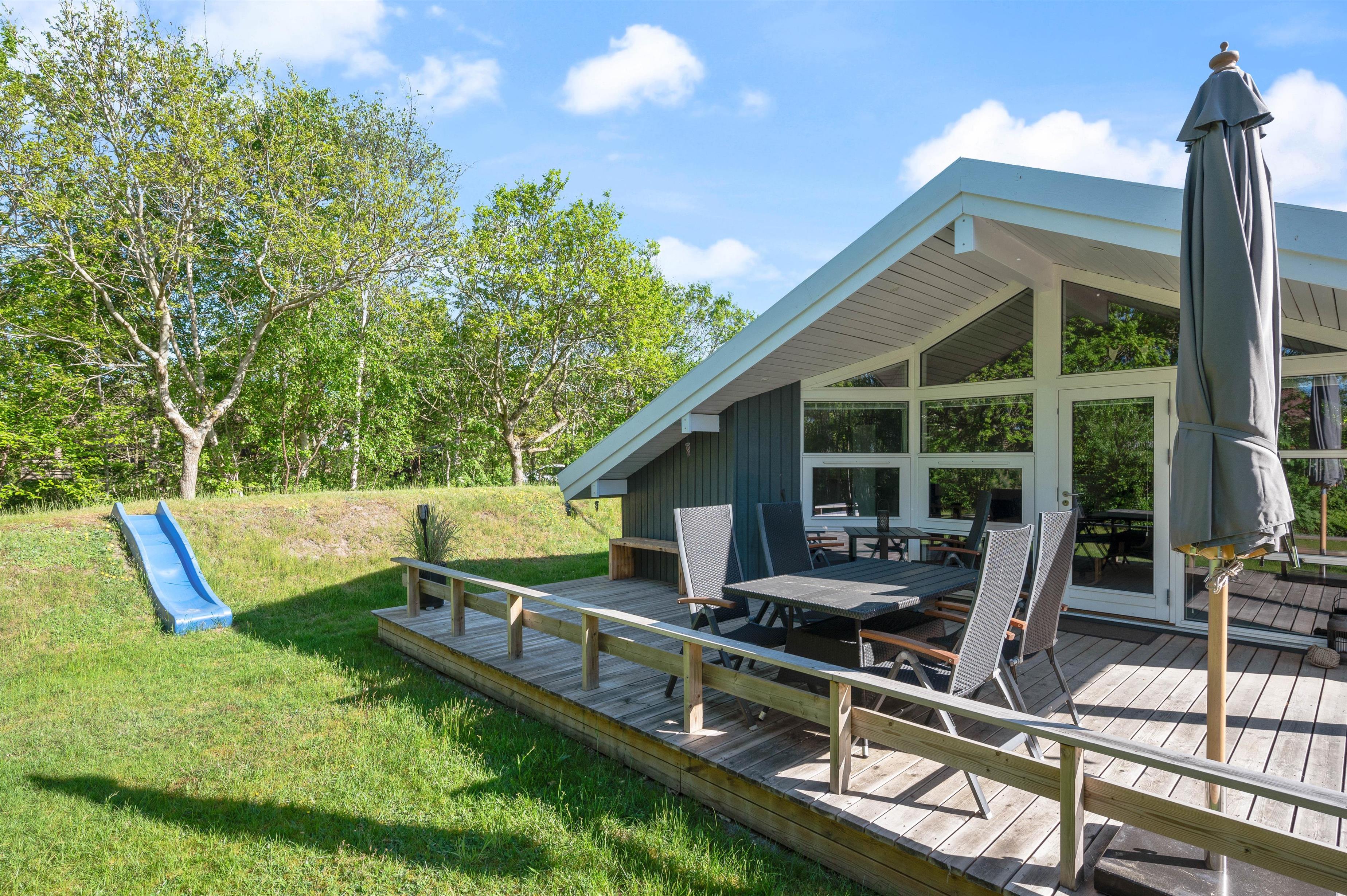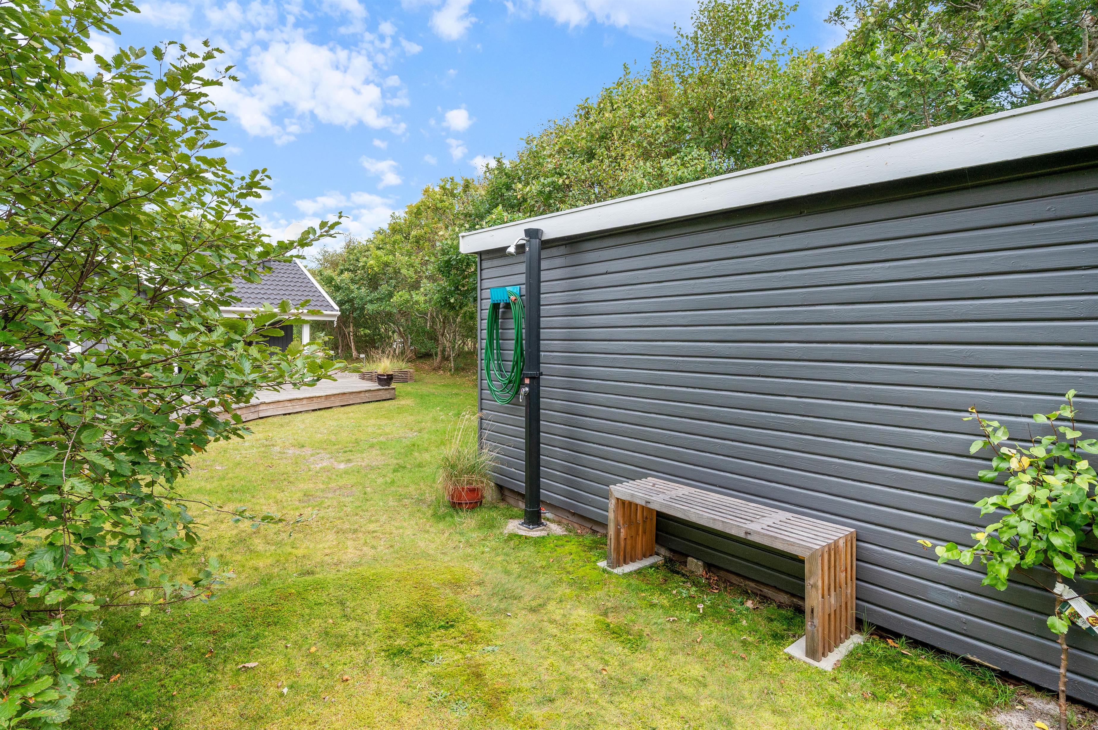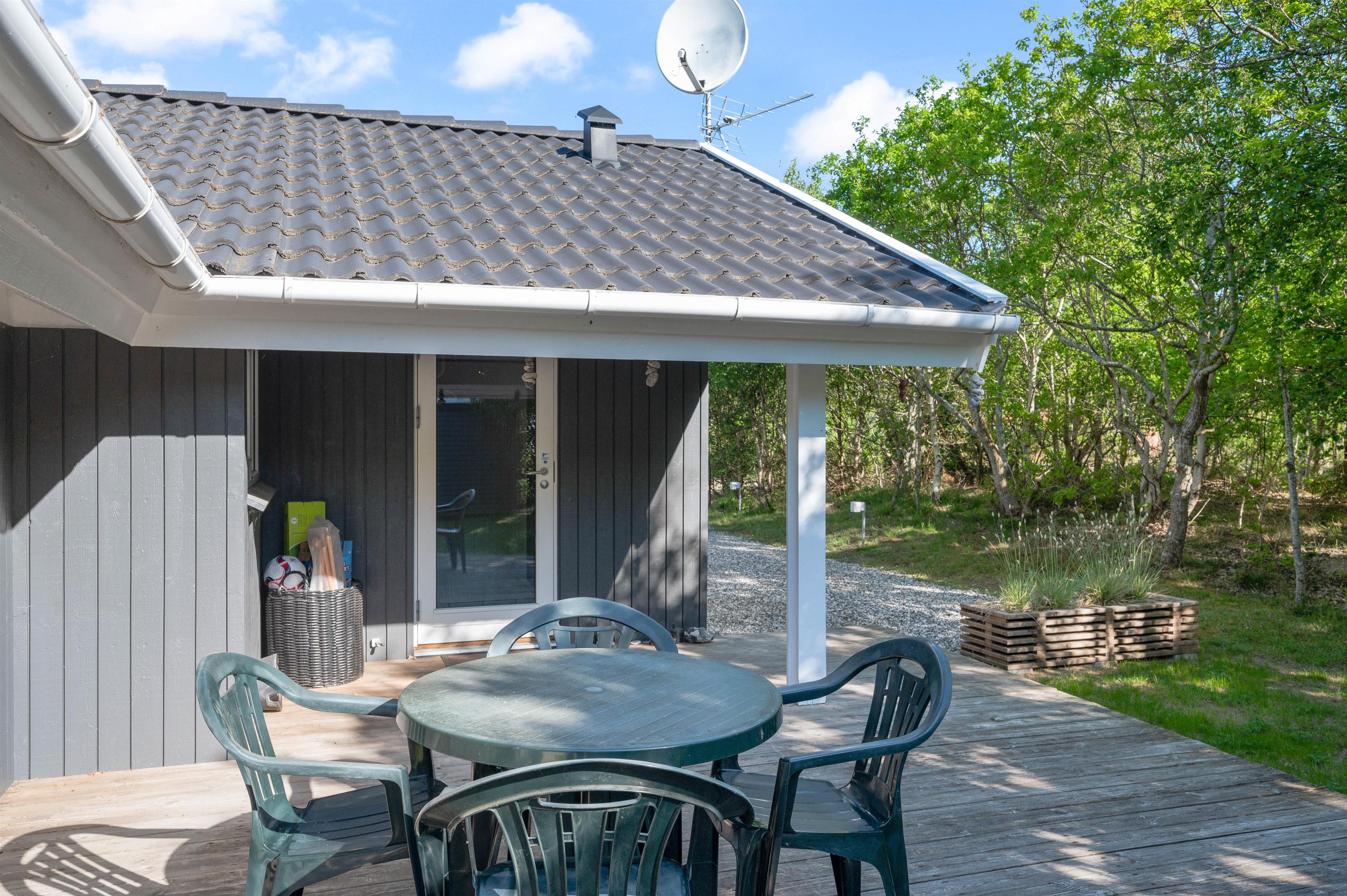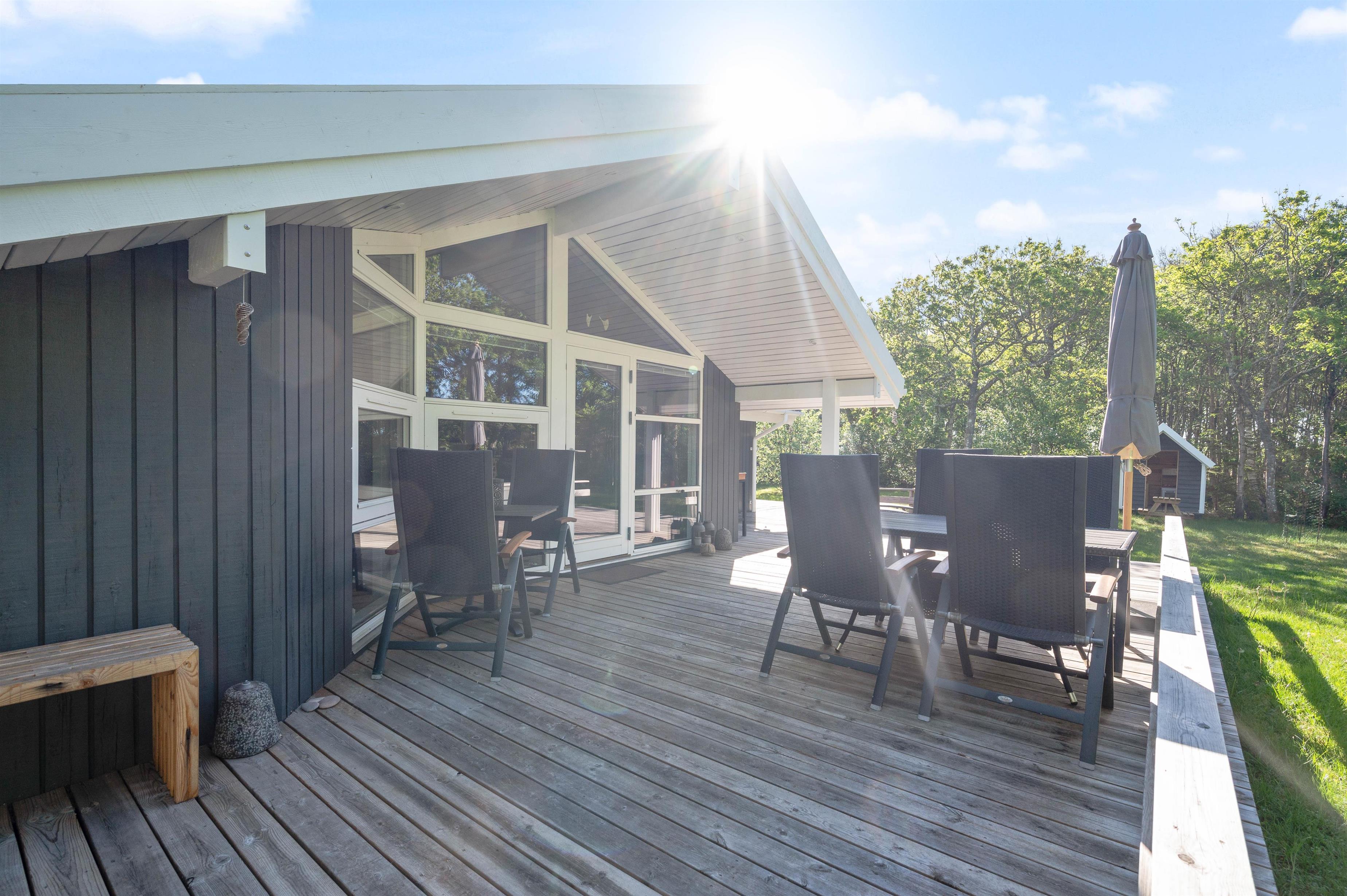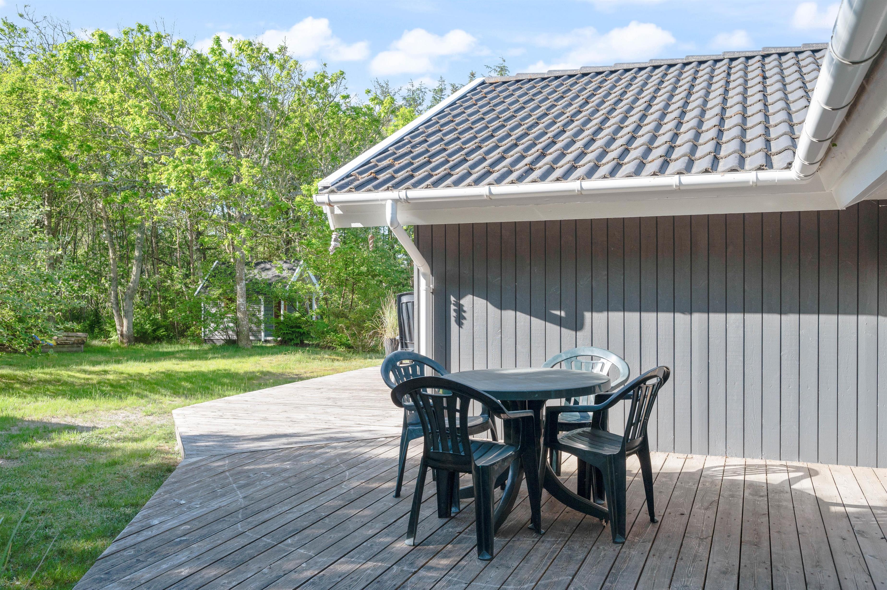 Fra sommerhusets terrasse har I et godt udsyn til legeområdet, således I kan holde børnene under opsyn, mens I selv opholder jer på terrassen. Terrassen består af flere små kroge, er delvist overdækket og bugter sig langs sommerhuset, så I kan flytte jer rundt i løbet af dagen, i takt med at solens placering ændrer sig. I kan med fordel benytte jer af udebruseren, hvis I trænger til at blive kølet lidt ned. Udebruseren kan tages i brug fra april til november måned. På terrassen er der gode havemøbler og behagelige liggestole til rådighed, og det er derfor oplagt at slå benene op og nyde solens stråler eller læse en god bog i disse skønne omgivelser. Når aftenen så småt går på hæld, kan I tilberede jeres aftensmad på grillen og nyde hinandens gode samvær.