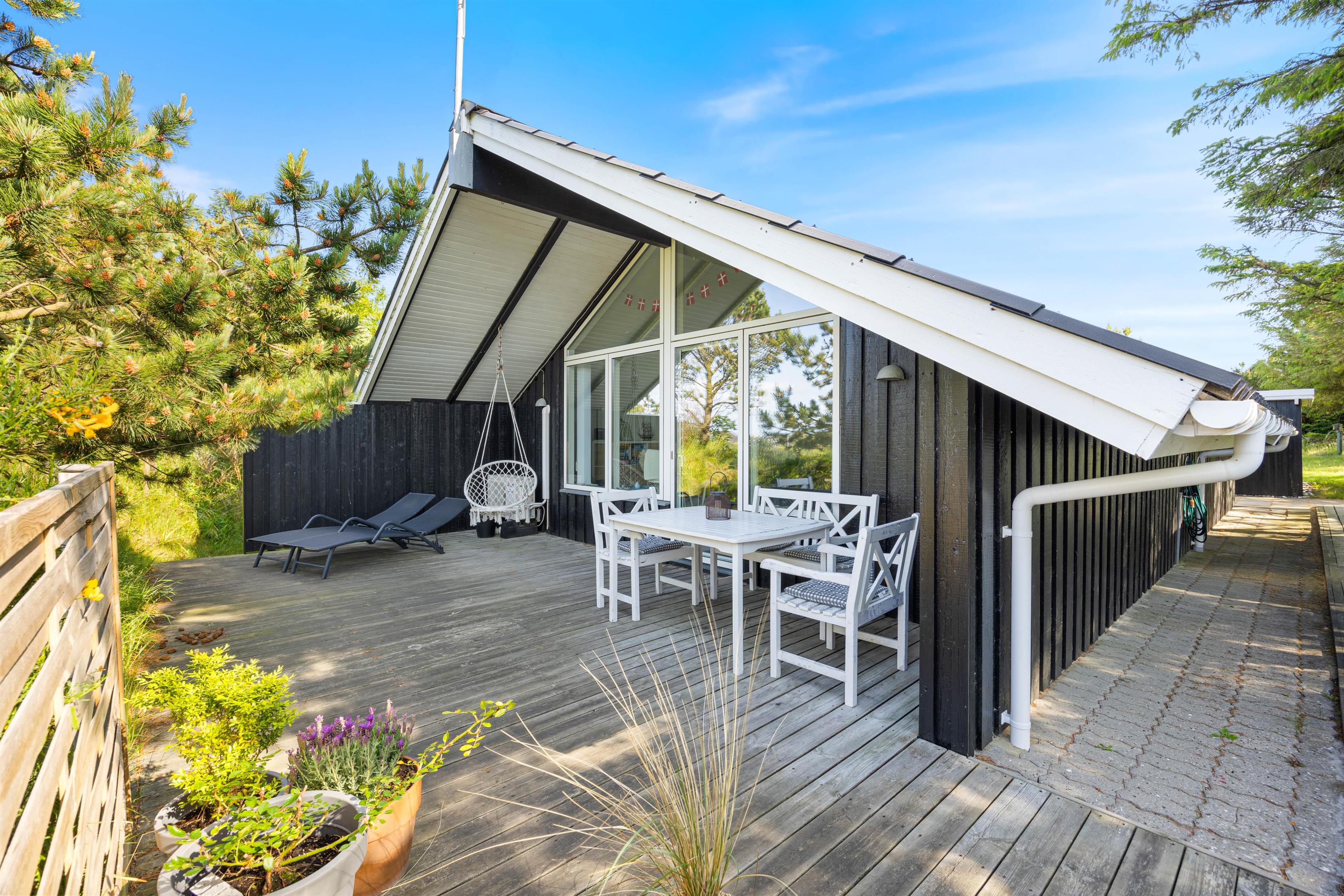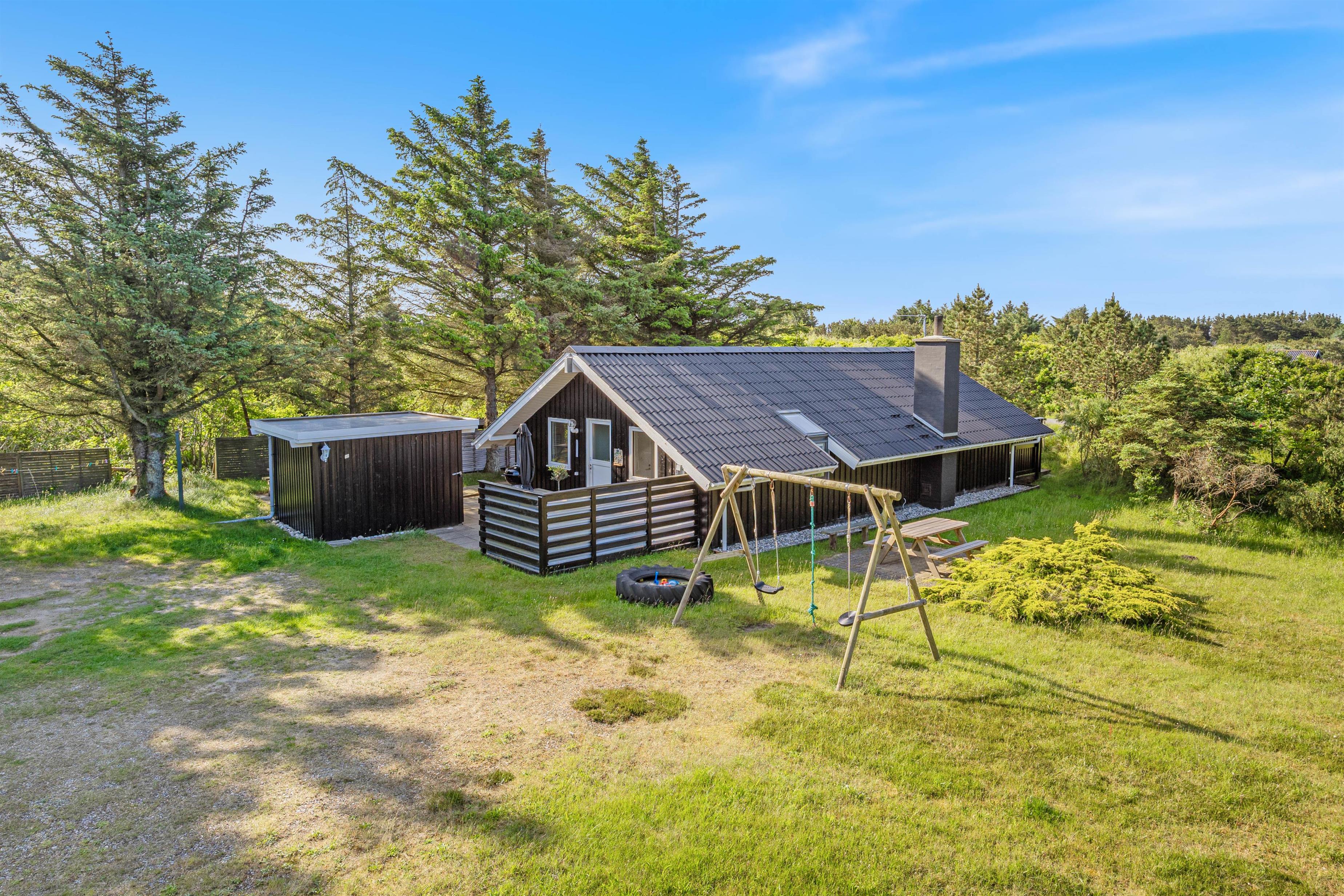 Sommerhuset på Lodbjerg Hede er beliggende på en dejlig stor naturgrund med god plads til hele familien. På begge sider af huset er der dejlig læ og plads til morgenkaffen og grillaftener. Til de små er både gyngestativ og sandkasse, som de med sikkerhed ville kunne få mange timers sjov med. Der er også flere forskellige havemøbler, så I altid kan nyde nogle af solen stråler. Hvis I dog foretrækker at sidde i skygge, kan I gøre dette under den overdækket del af terrassen.