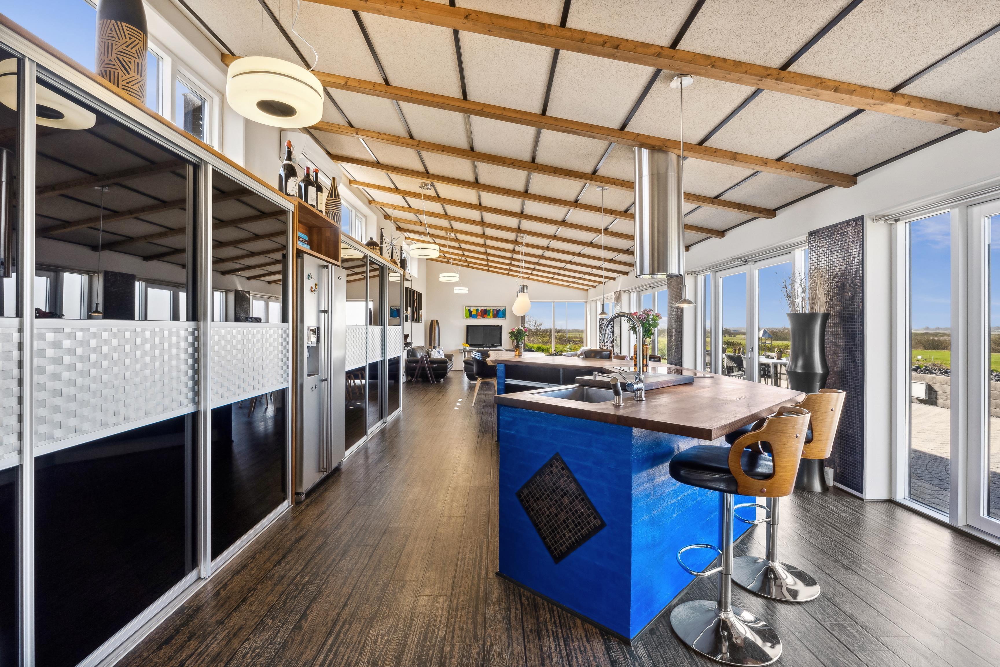 Det store åbne køkken-alrum er hjertet i hjemmet og det perfekte sted at samles til hyggelige måltider og sjove stunder. Køkkenet er fuldt udstyret med moderne faciliteter, herunder 4 keramiske kogeplader, ovn, køleskab, 60 liters fryser, opvaskemaskine og mikrobølgeovn.
