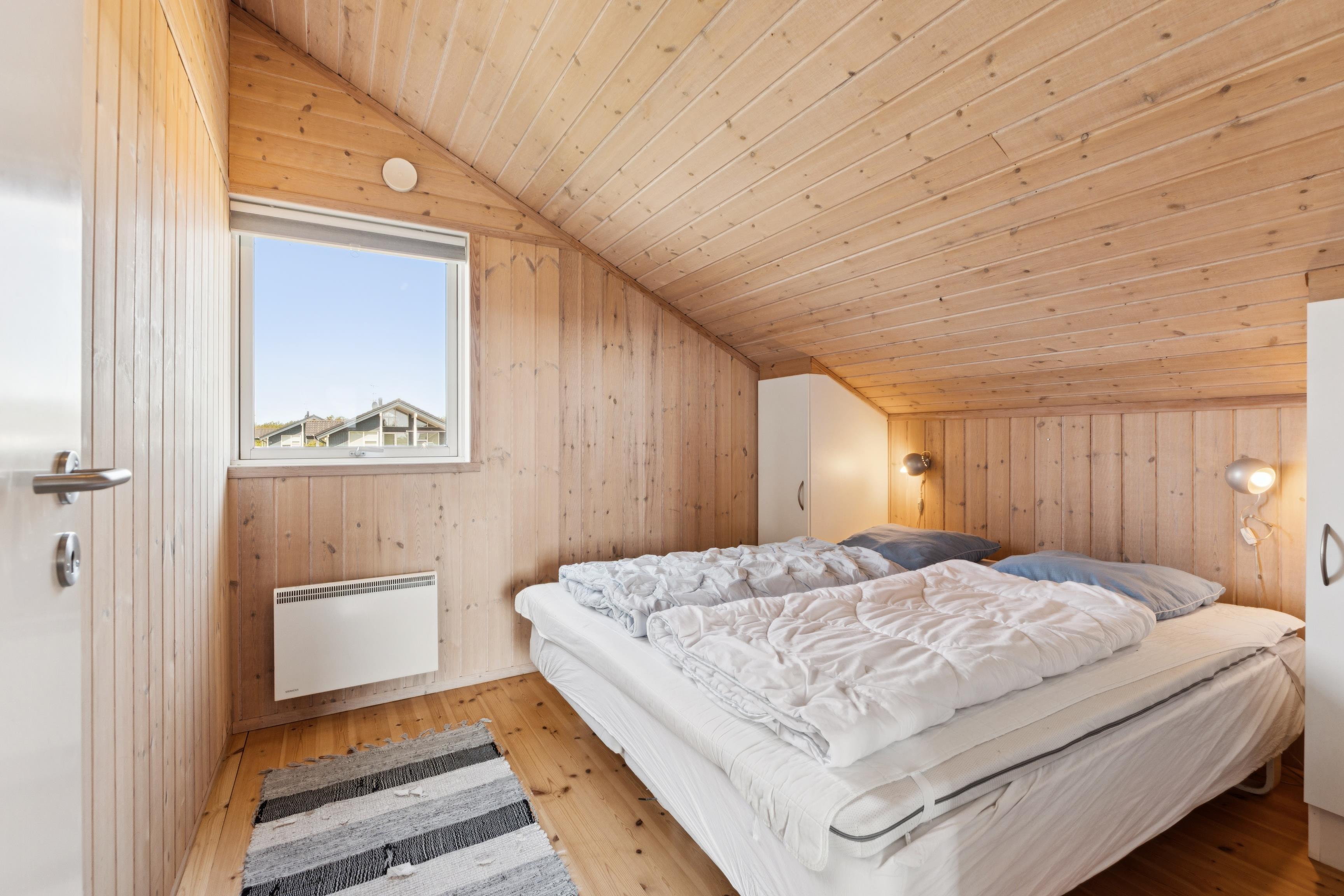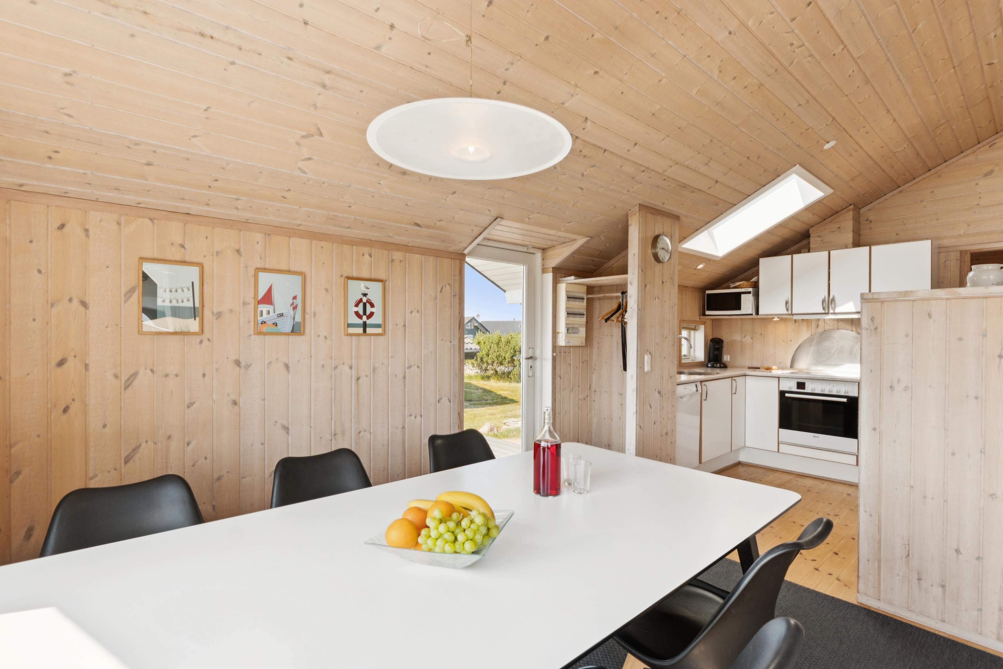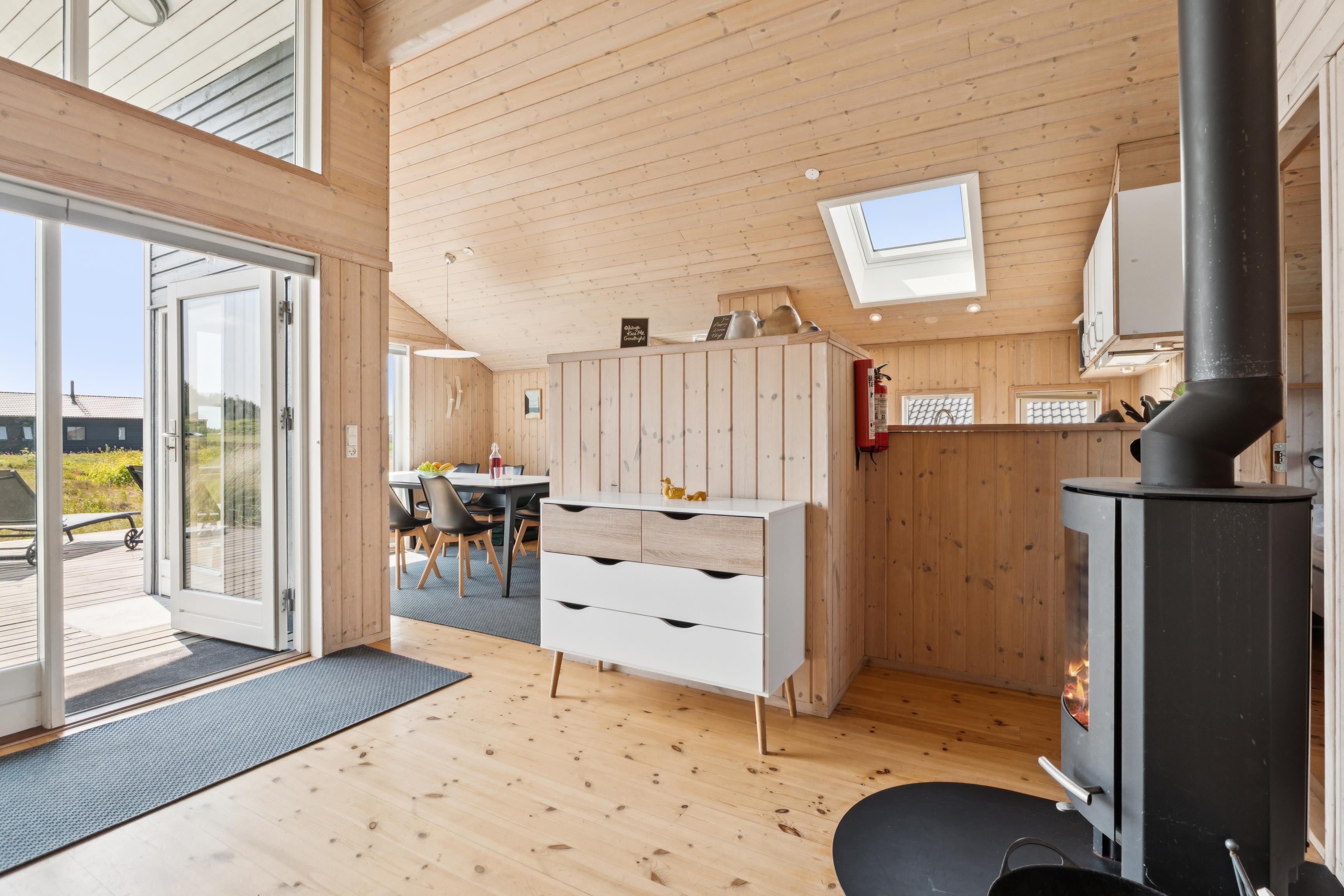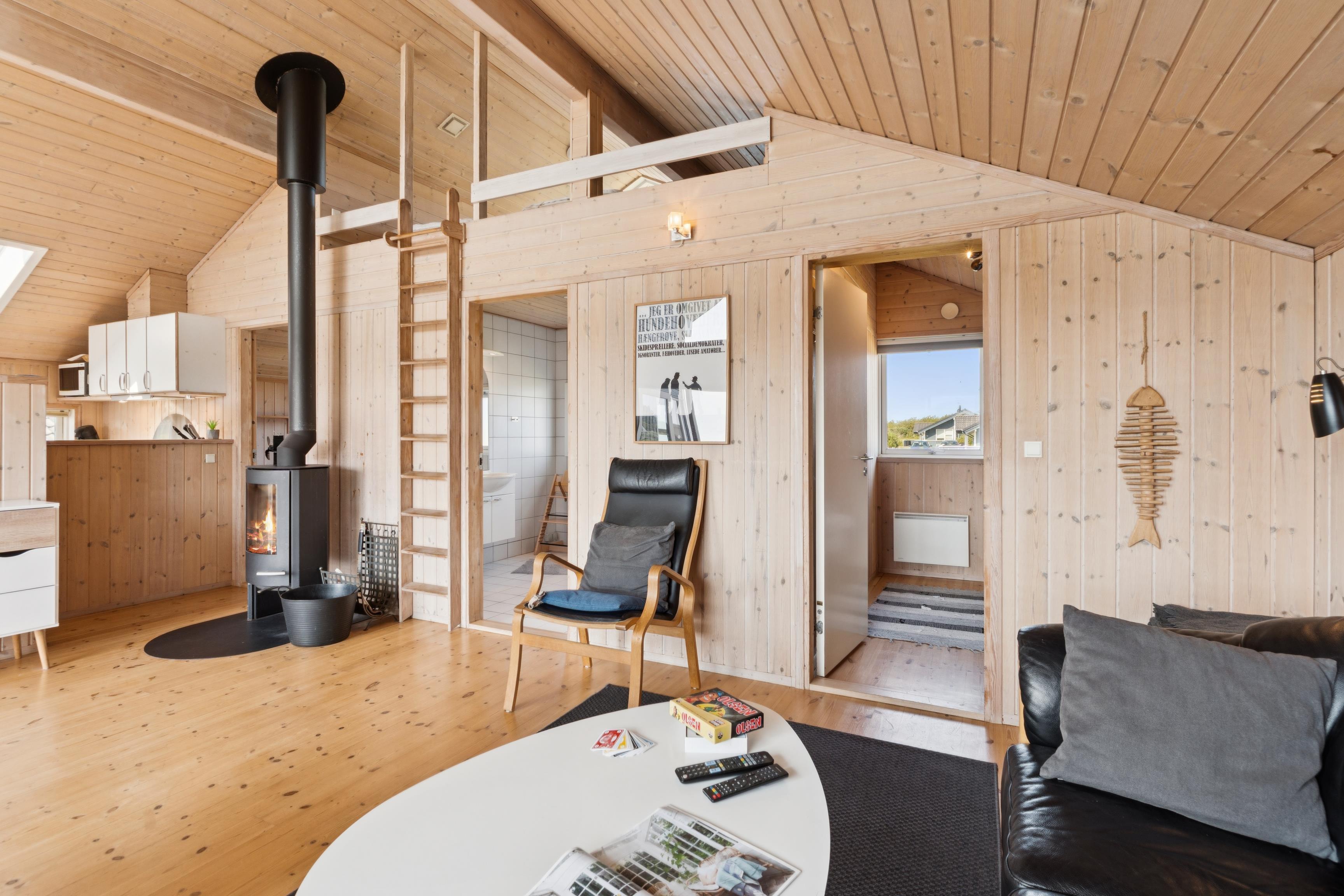 Den åbne stue/spiseplads med brændeovn indbyder til hygge og hyggelige aftener og går direkte over i det moderne køkken. Dette er udstyret med keramisk kogeplade, opvaskemaskine, mikroovn, kaffepadmaskine og et stort køleskab med fryser. Det er nemt at tilberede jeres måltider her. Feriehuset har to komfortable soveværelser, der hver er udstyret med en dobbeltseng og skabe med masser af opbevaringsplads. På loftet, som man kommer op til via en stige, er der yderligere 2 sovepladser.