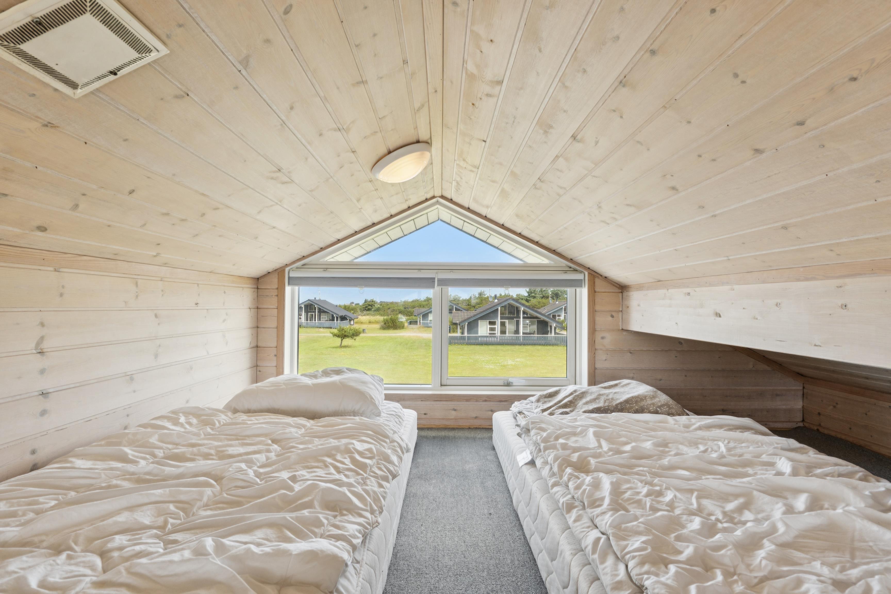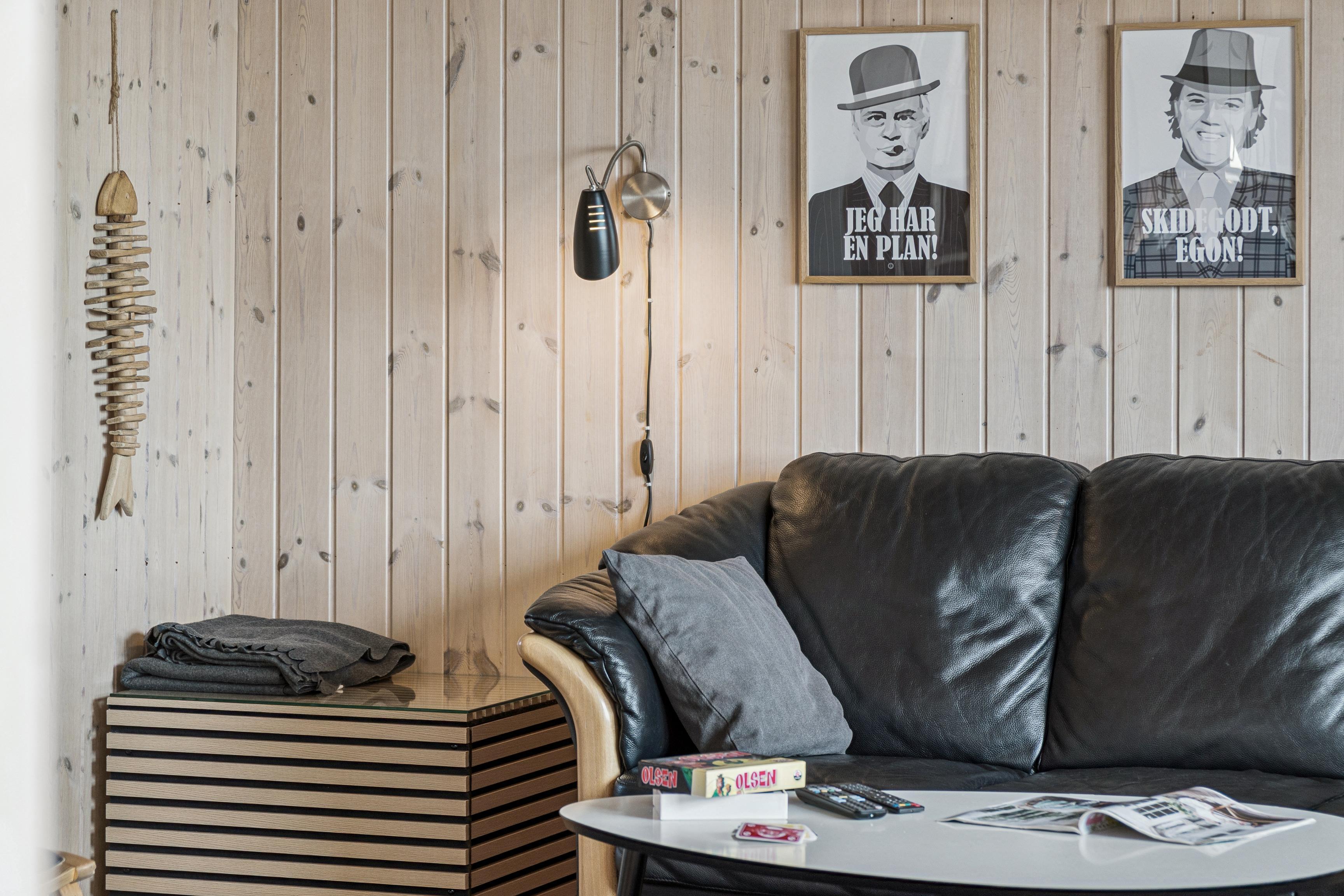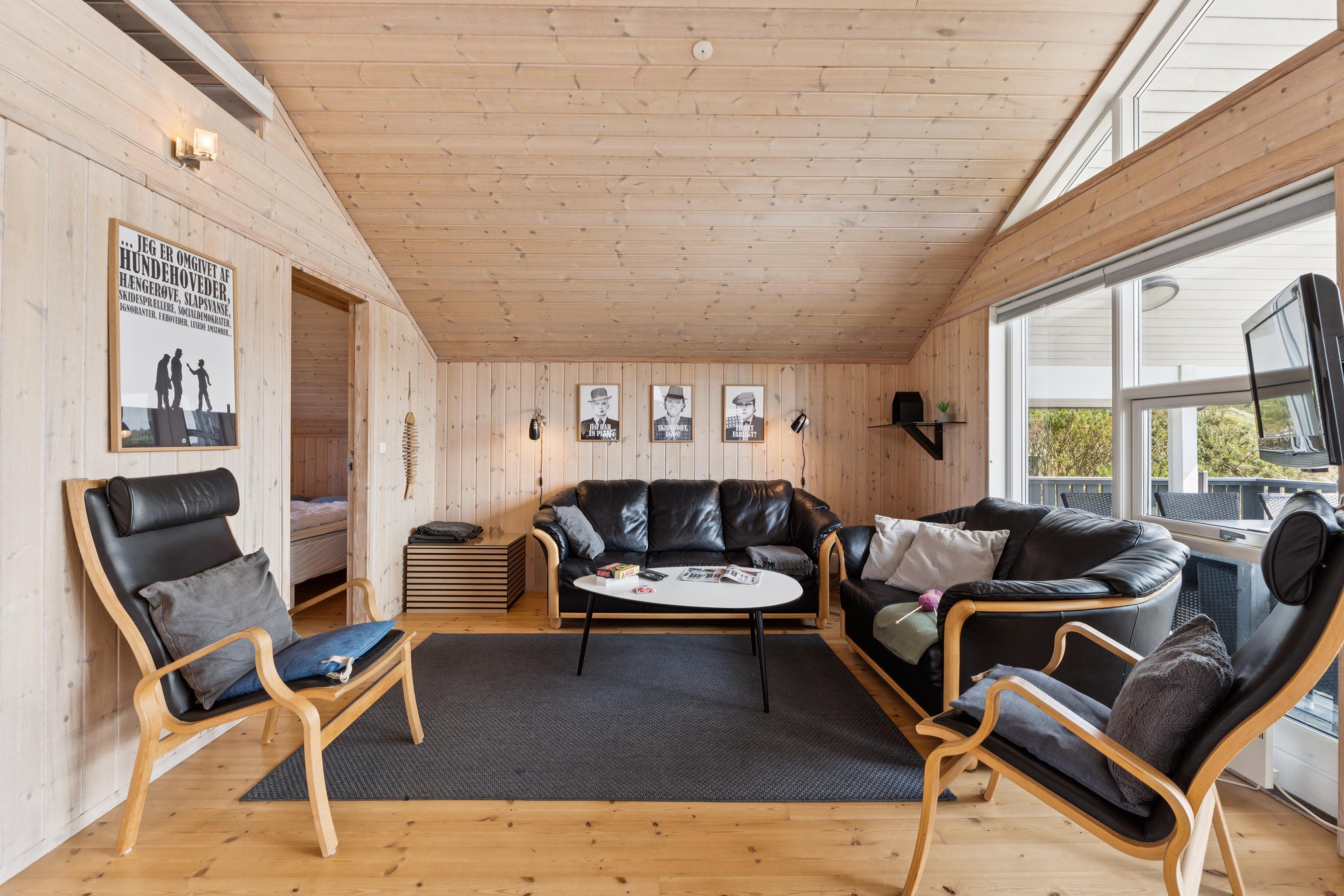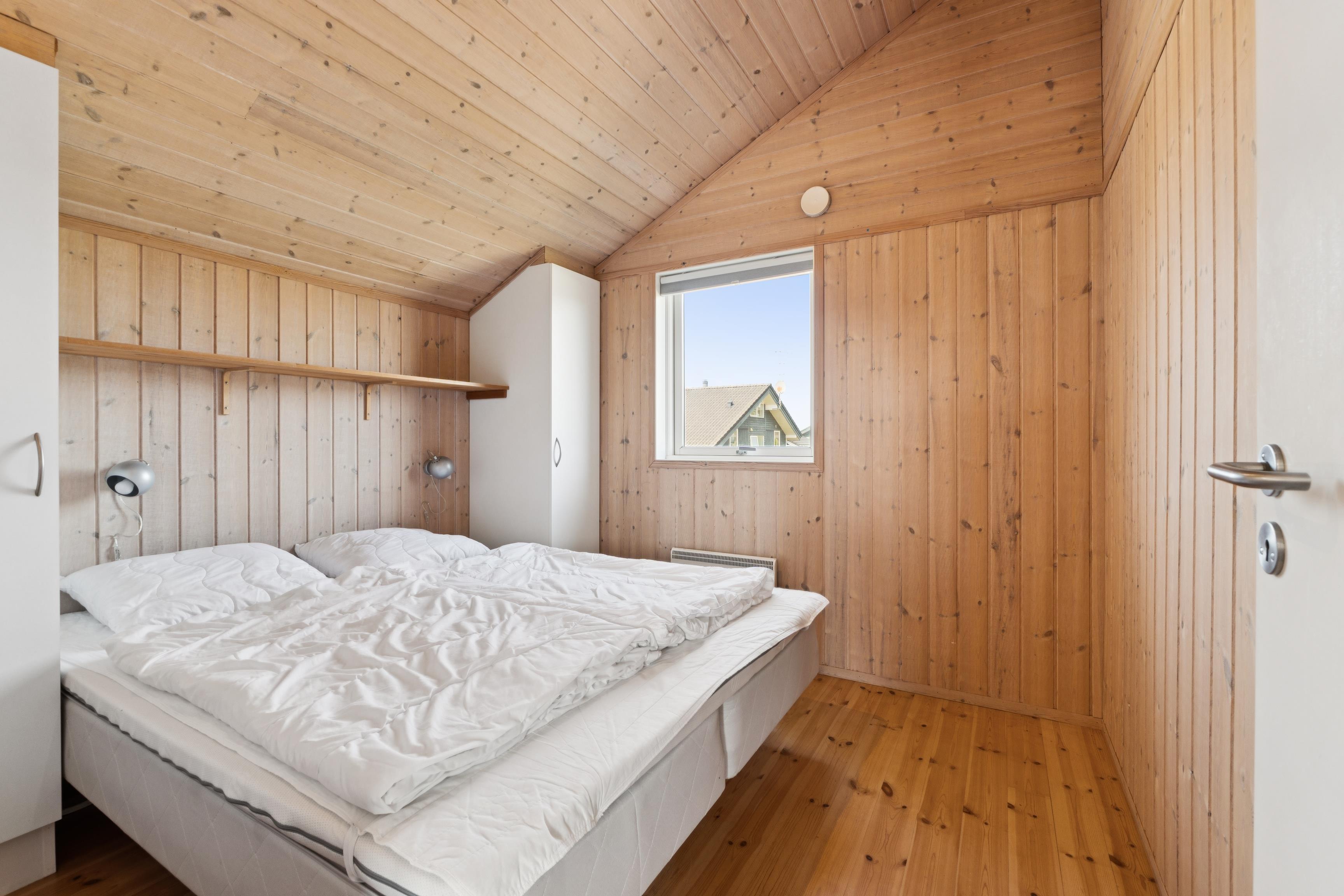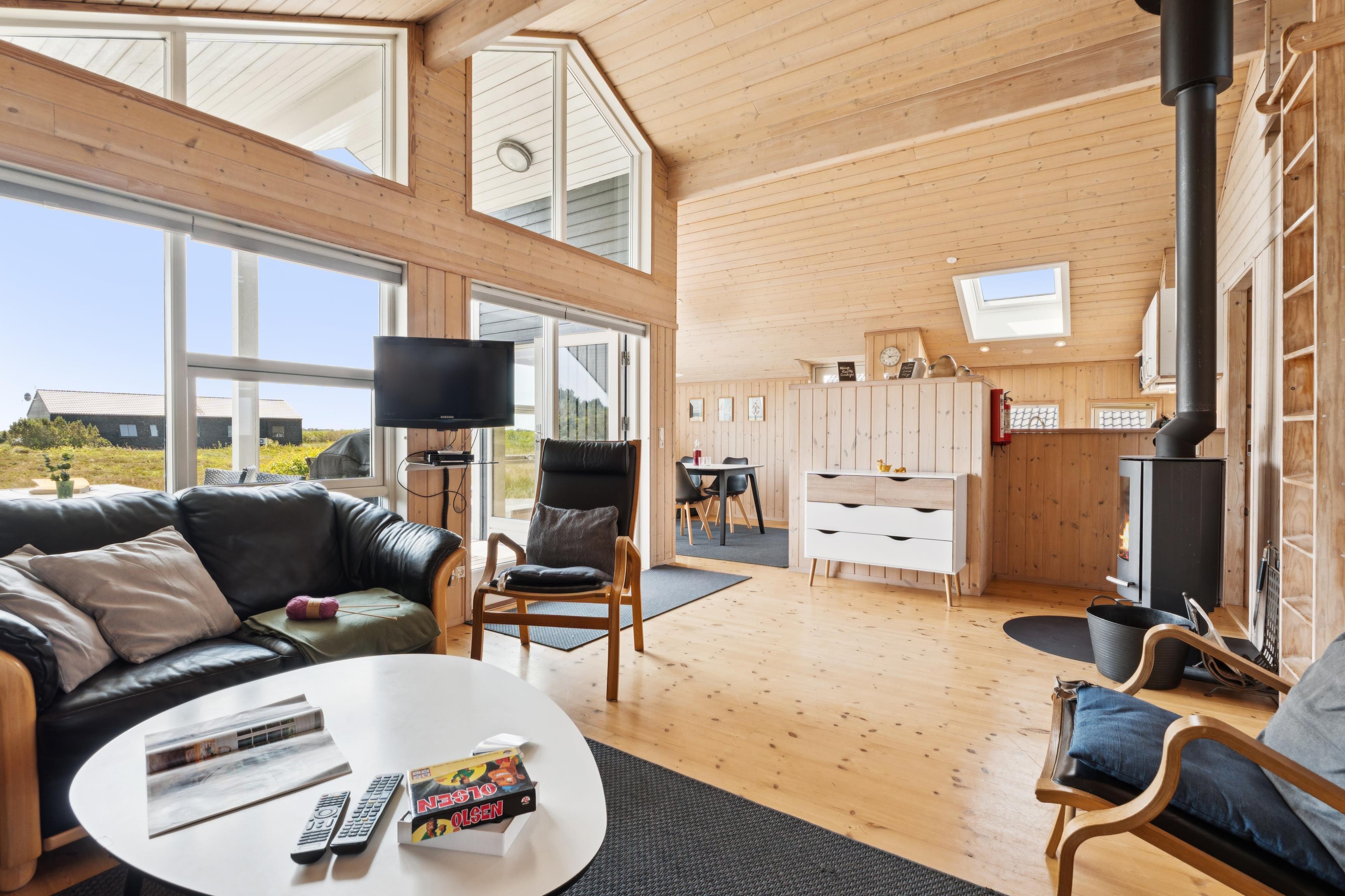 Den åbne stue/spiseplads med brændeovn indbyder til hygge og hyggelige aftener og går direkte over i det moderne køkken. Dette er udstyret med keramisk kogeplade, opvaskemaskine, mikroovn, kaffepadmaskine og et stort køleskab med fryser. Det er nemt at tilberede jeres måltider her. Feriehuset har to komfortable soveværelser, der hver er udstyret med en dobbeltseng og skabe med masser af opbevaringsplads. På loftet, som man kommer op til via en stige, er der yderligere 2 sovepladser.
