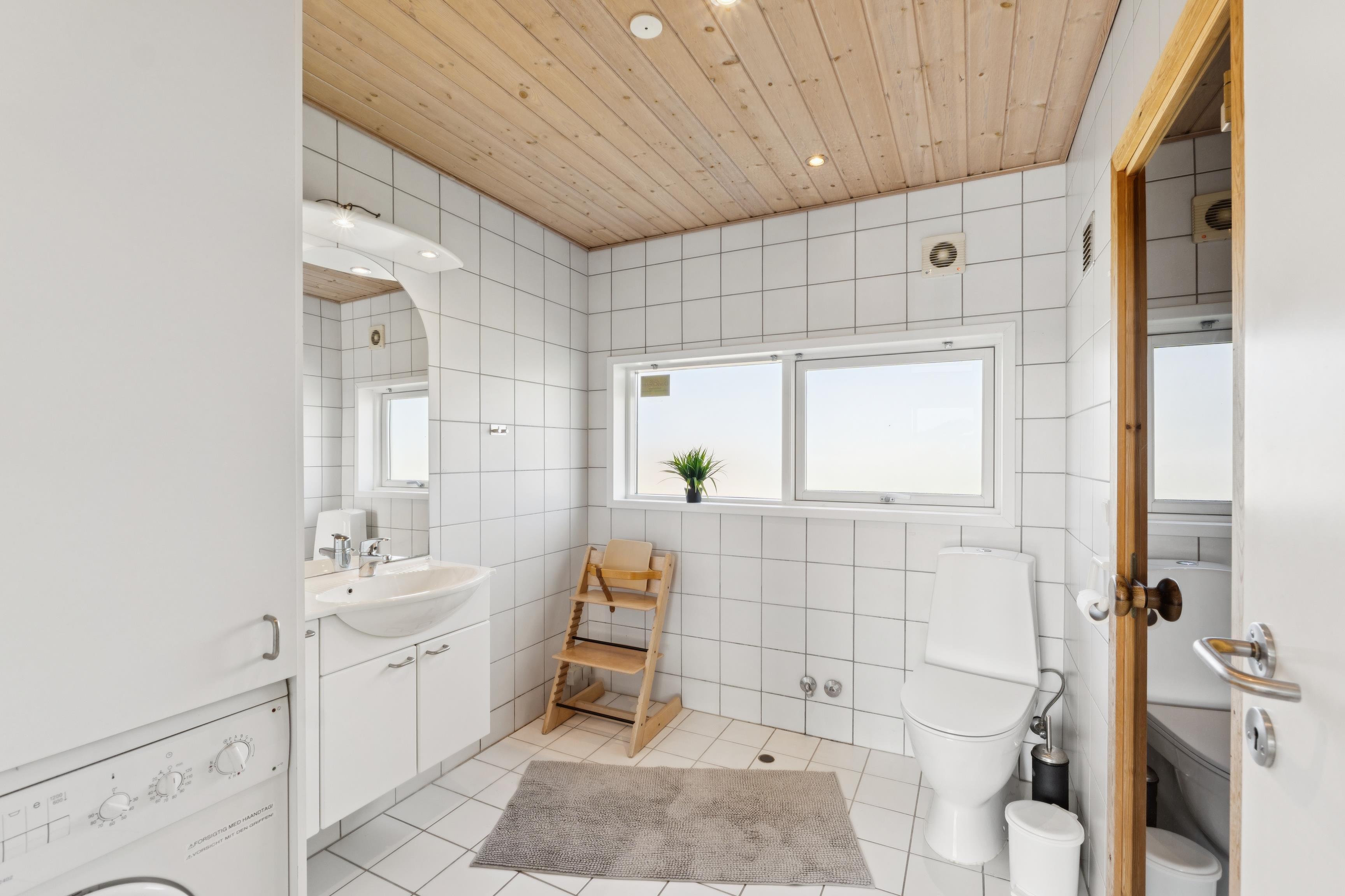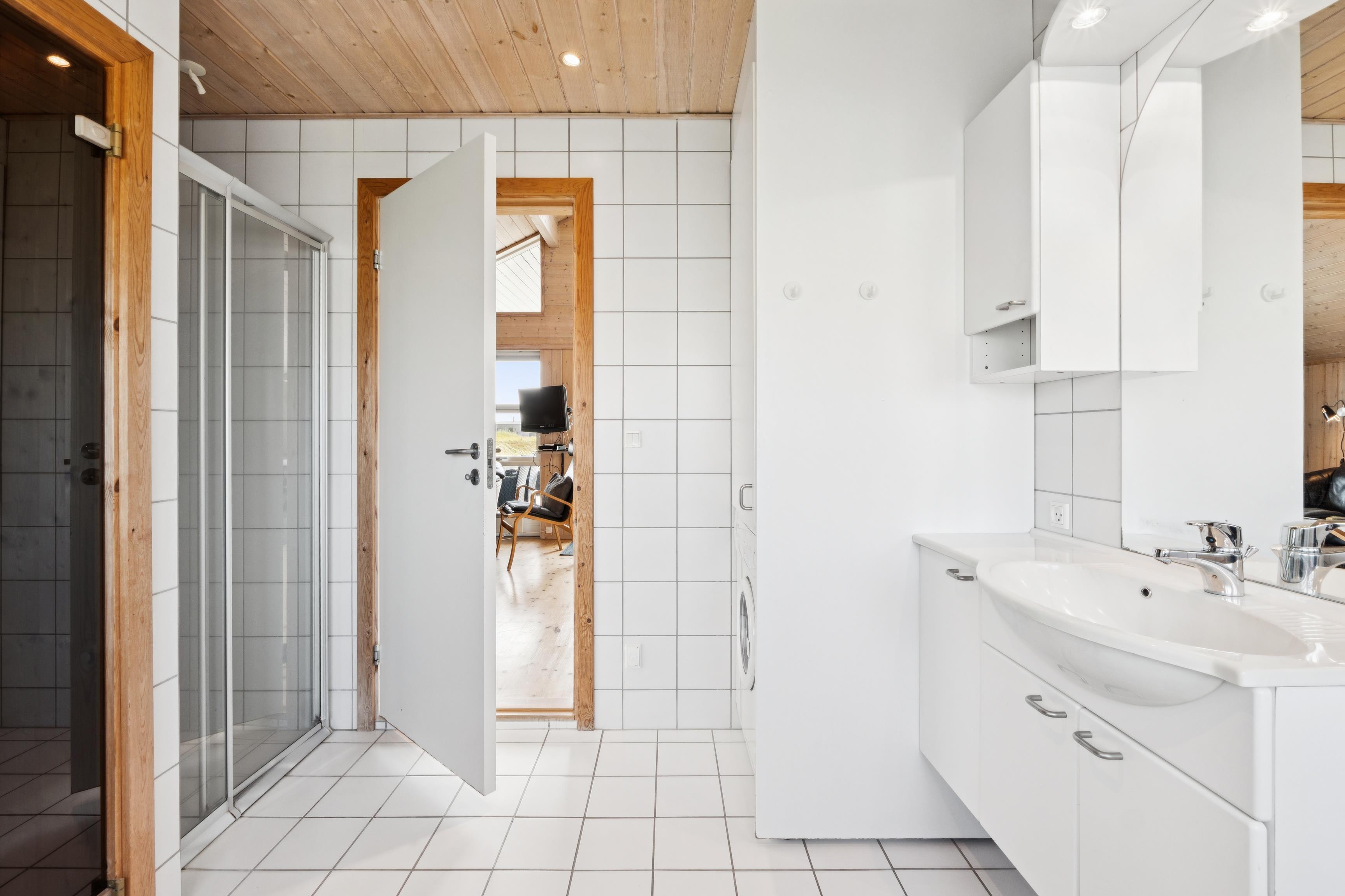 Badeværelset er udstyret med gulvvarme og spabad (endnu ikke installeret på billederne) samt sauna – ideelt til afslapning efter en aktiv dag ved fiskesøen 200 m væk eller golfbanen 800 m væk. Slap af efter en tur i saunaen på liggestolene, der står klar på den store sydvendte terrasse, eller grill jeres selvfangede fisk og nyd aftenen med et godt glas vin og venner. Her kan I både beundre solopgangen om morgenen og solnedgangen om aftenen.