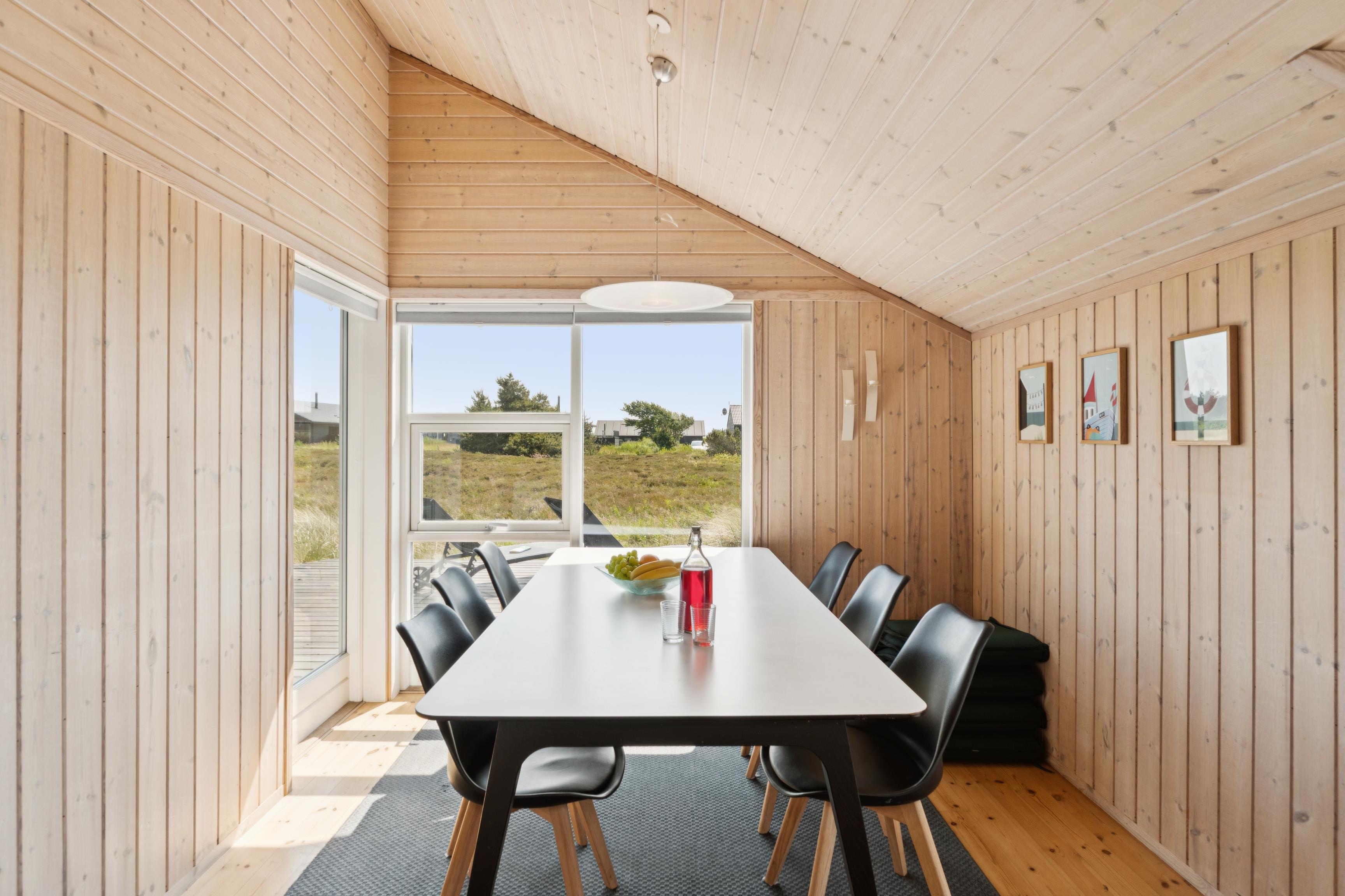Dette hyggelige 70 m² store feriehus med spabad og sauna ligger i det naturskønne Lodbjerg-Hede – kun et stenkast fra fiskesøen Lodbjerg Hede Ørredsø og en golfbane. Store vinduer, der lukker masser af dagslys ind, skaber en lys og indbydende atmosfære. Huset er indvendigt helt beklædt med naturtræ, og fra spisepladsen har du en fantastisk udsigt over det vestjyske landskab.
