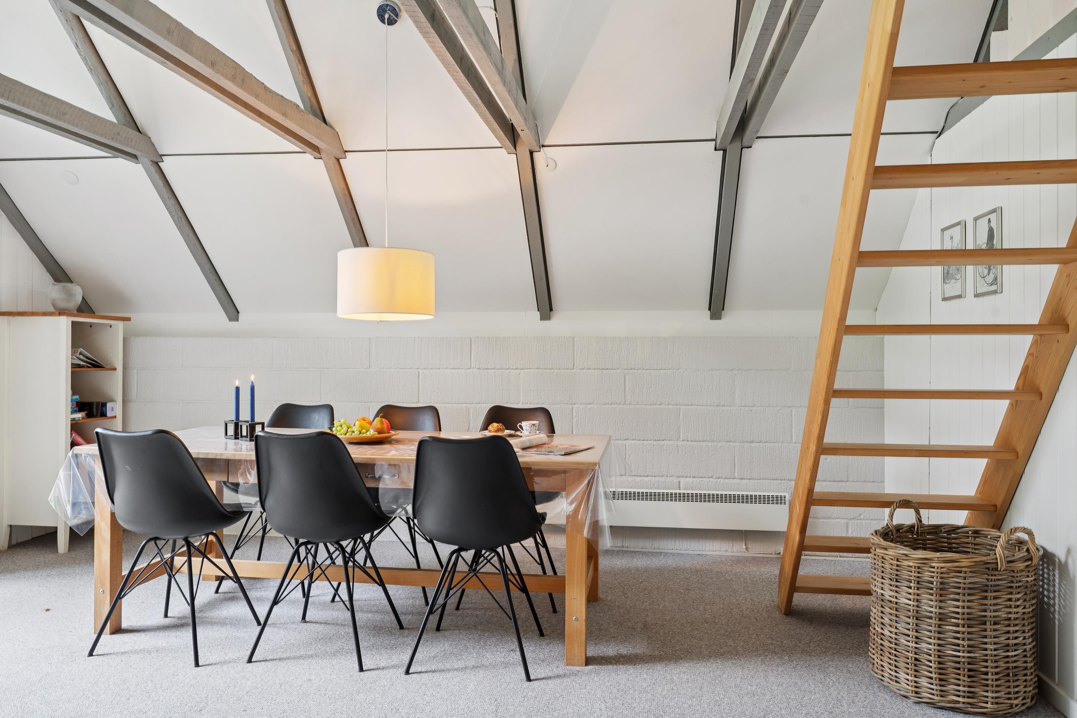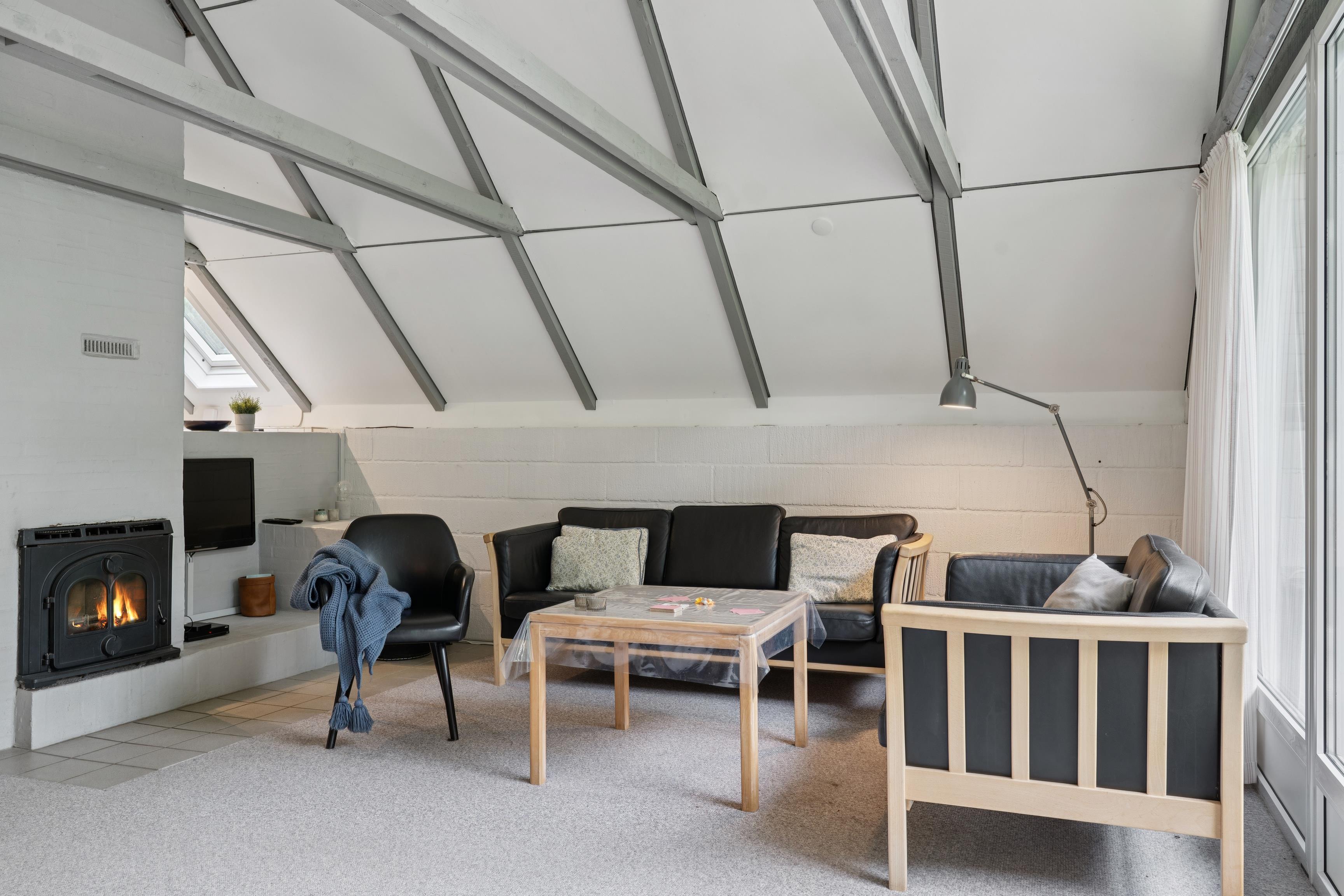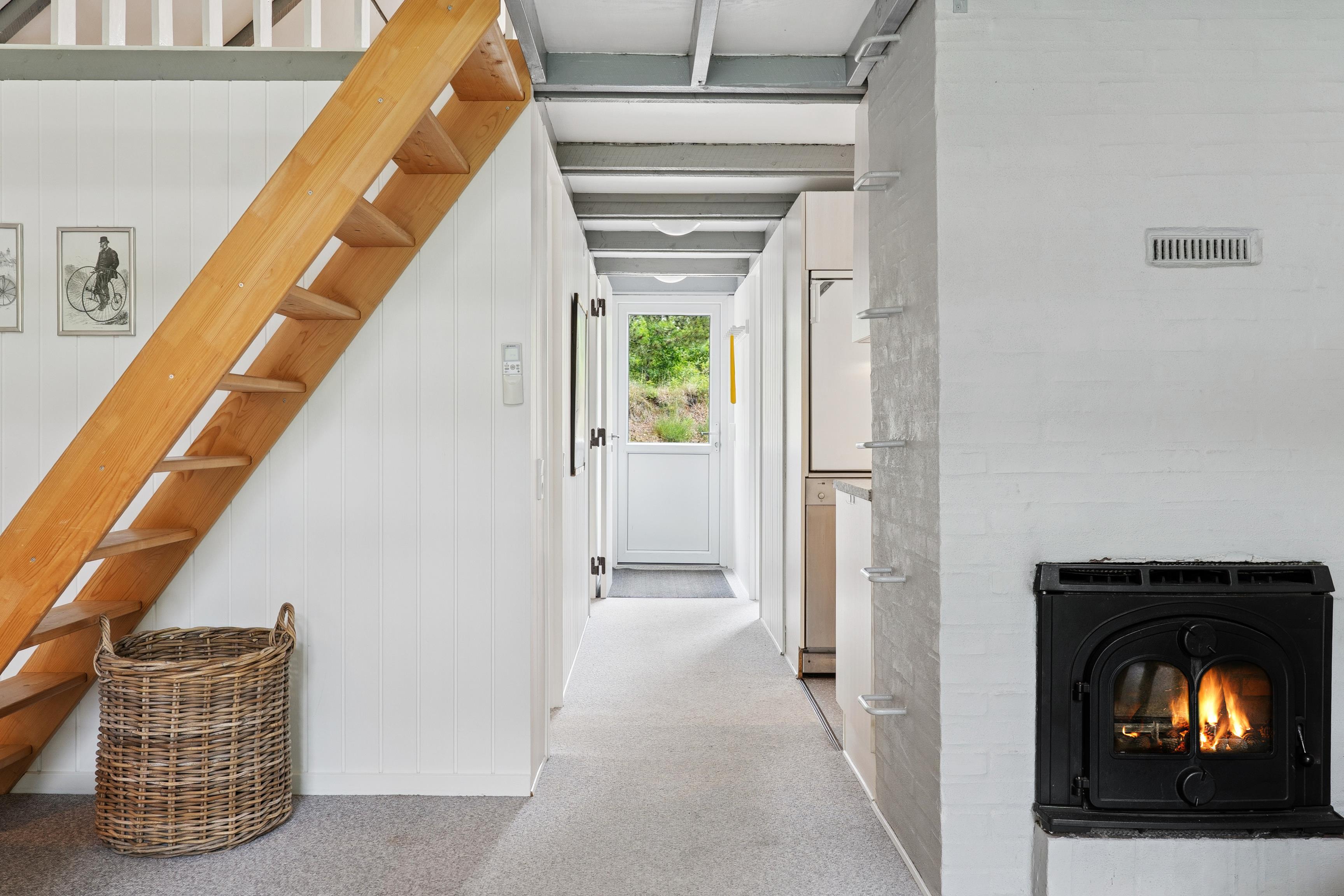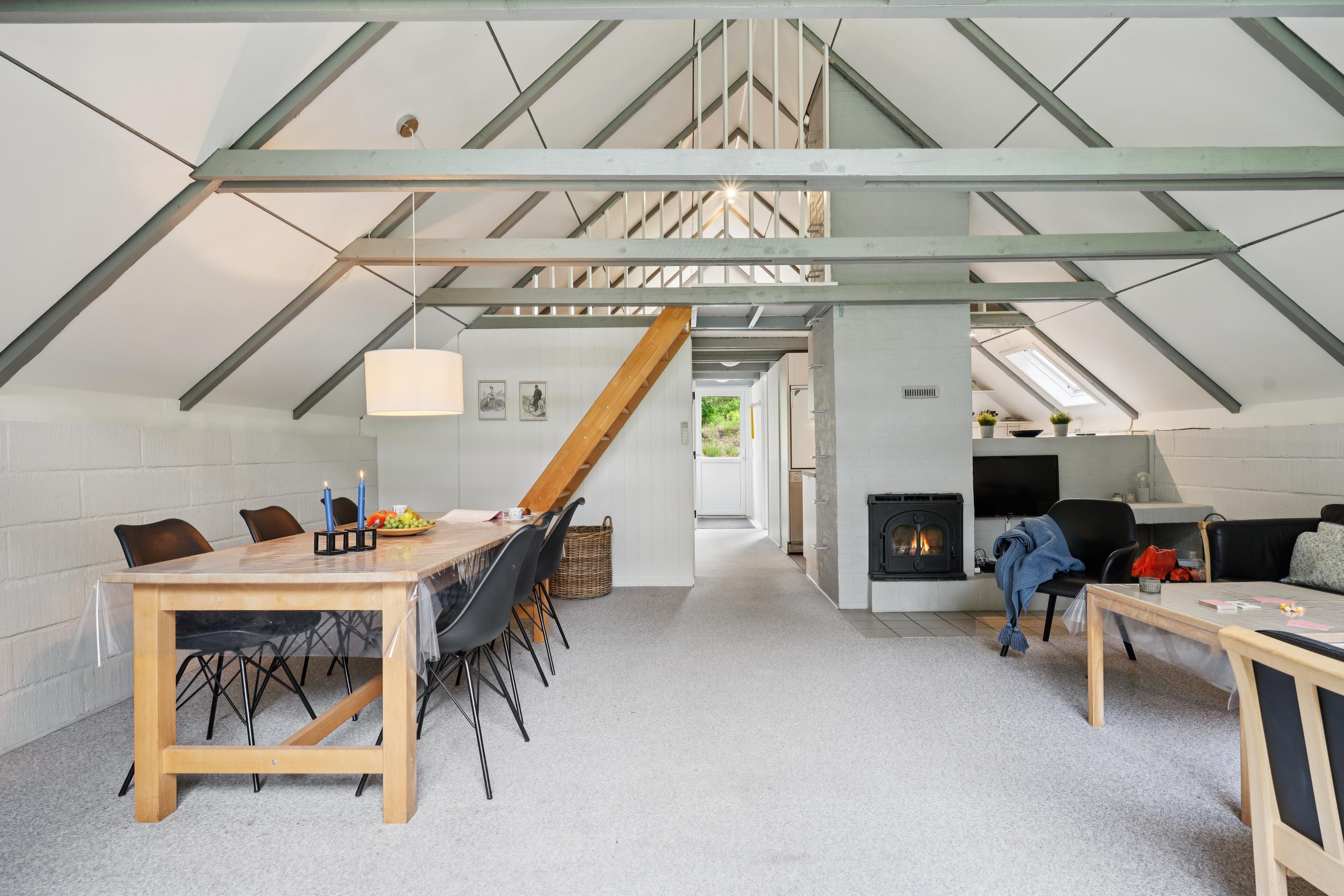 Opholdsstuen er i åben forbindelse med køkkenet, hvilket giver et naturligt samlingspunkt – uanset årstid. Her kan I nyde måltiderne sammen eller slappe af foran brændeovnen, som spreder både varme og stemning. Køkkenet er praktisk indrettet med bl.a. opvaskemaskine, mikroovn og køle-/fryseskab.