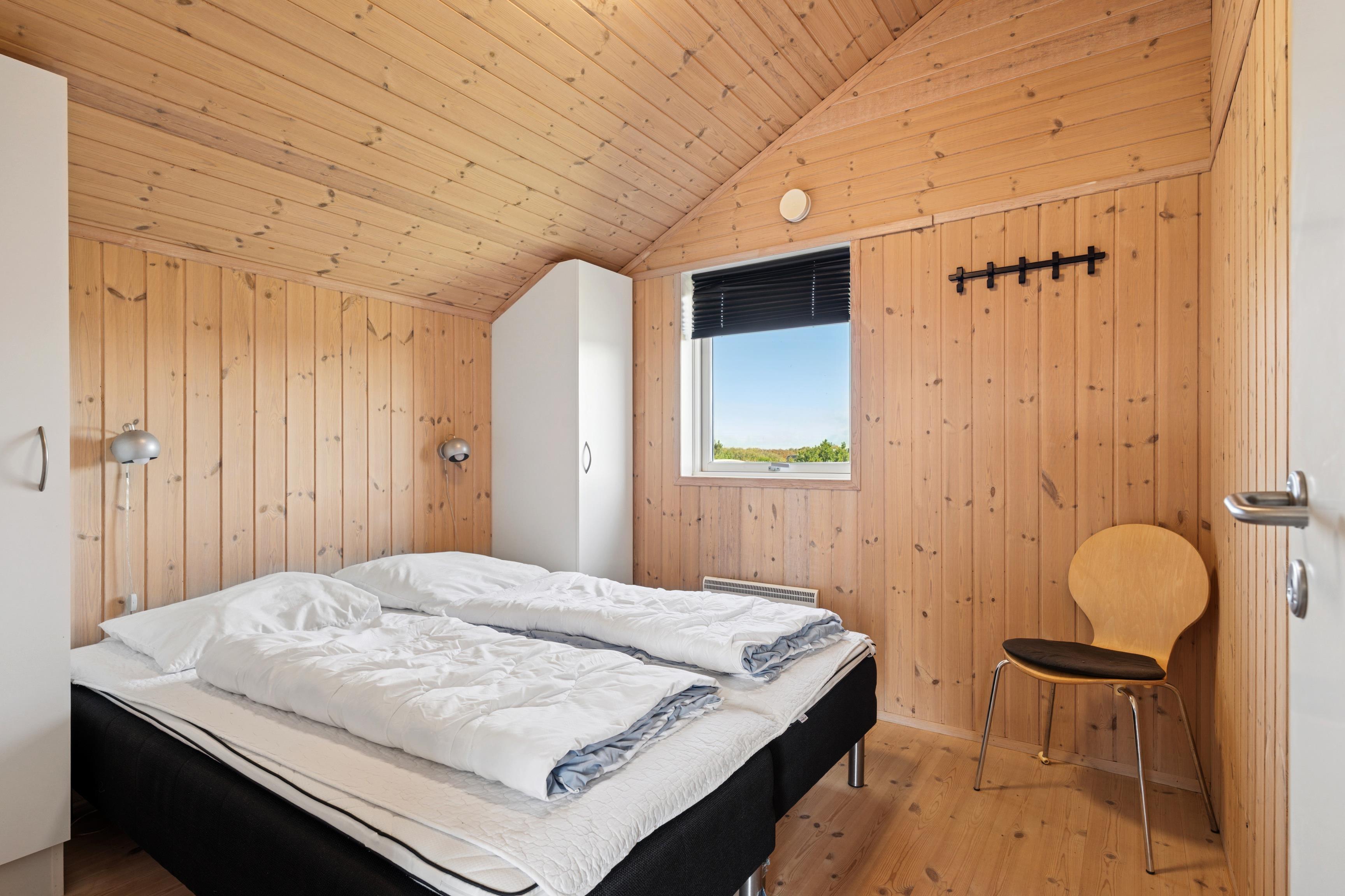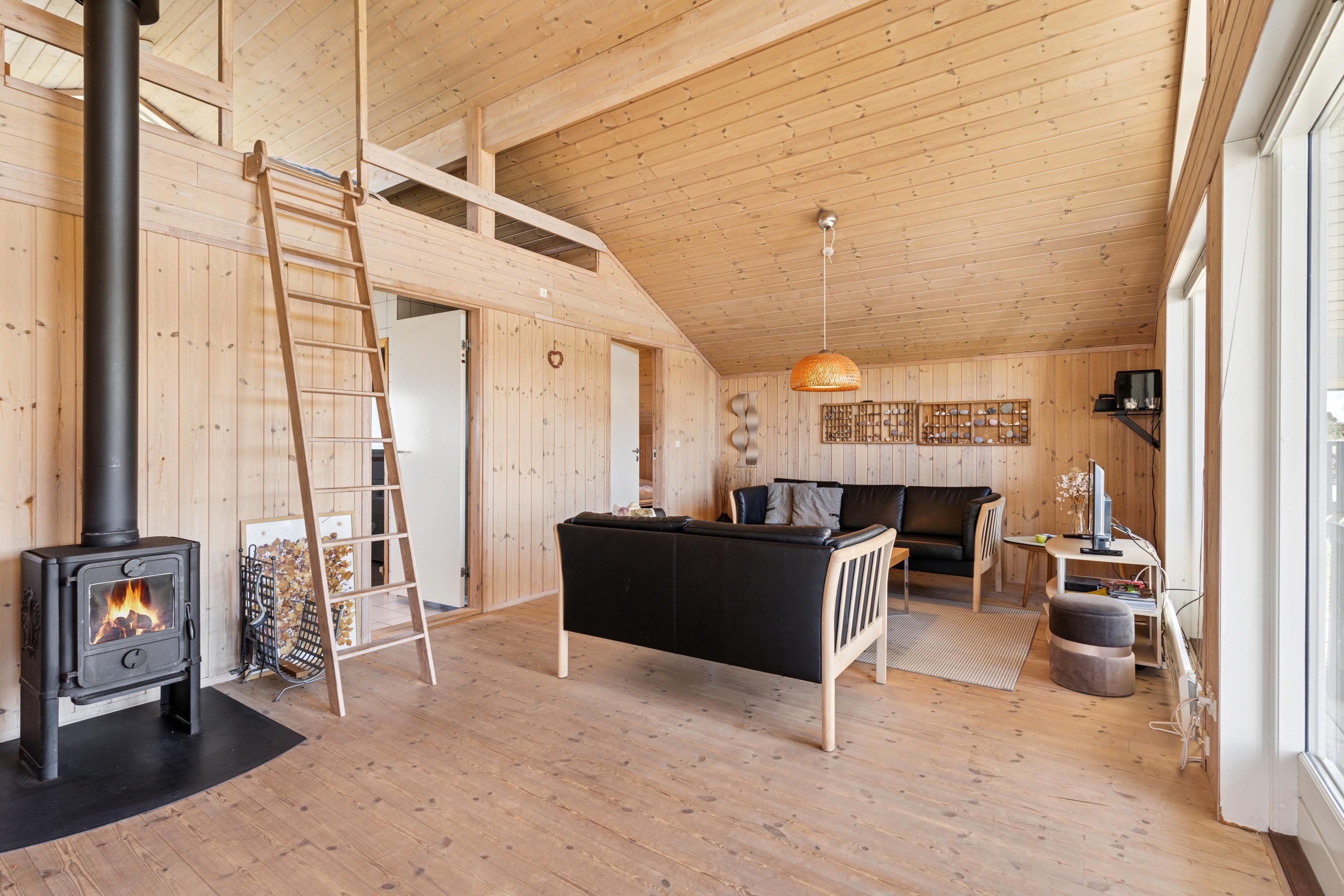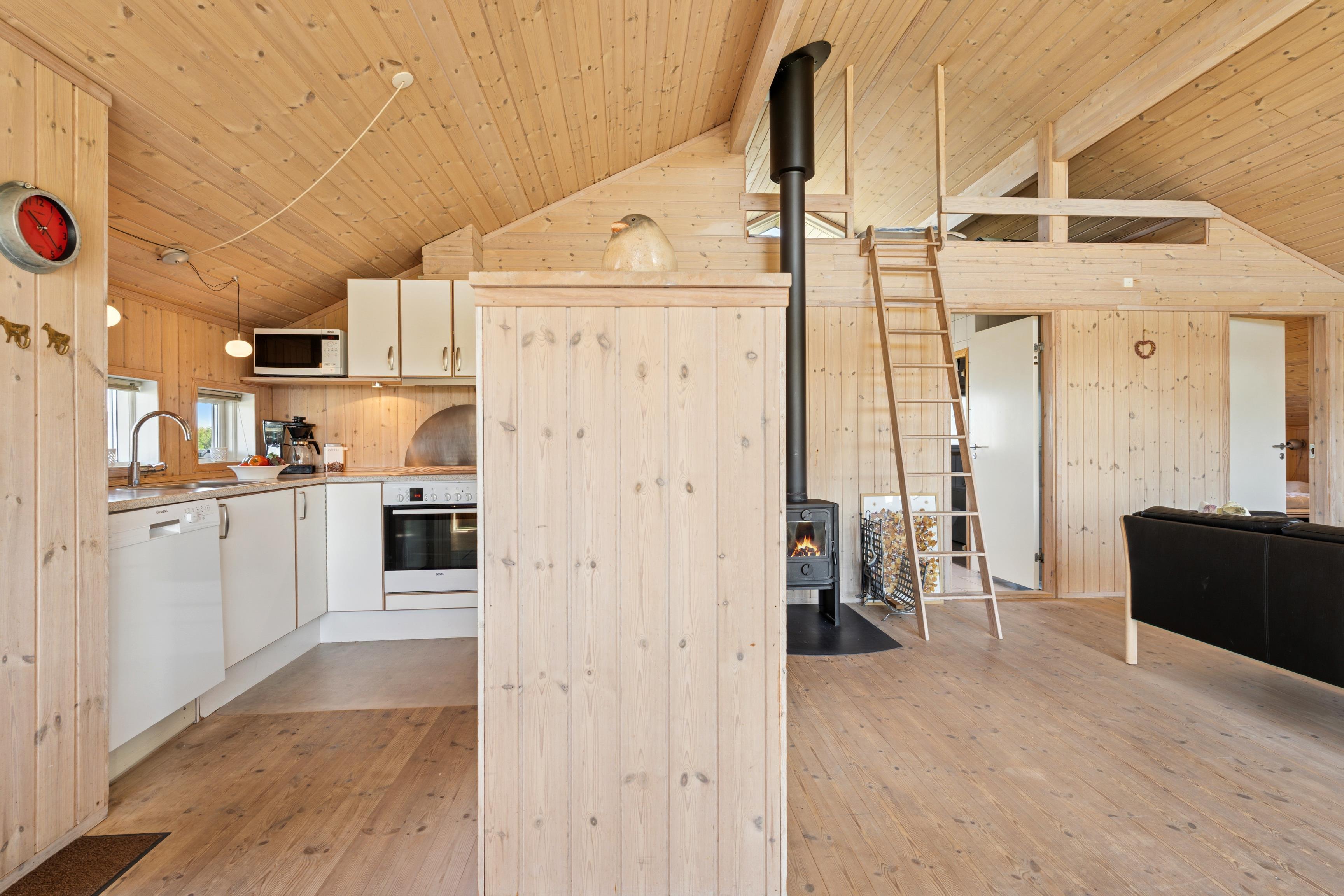 Huset er indrettet med 2 værelser med dobbeltseng samt 2 soverpladser på hems. Stue, køkken og spiseplads er åbent, så i kan hygge jer sammen om madlavningen, et spil kort eller læse en god bog. Der kan tændes op i brændeovnen på de kølige dage, hvor roen kan sænke sig efter en aktiv dag. Badeværelset byder på både spa og sauna.