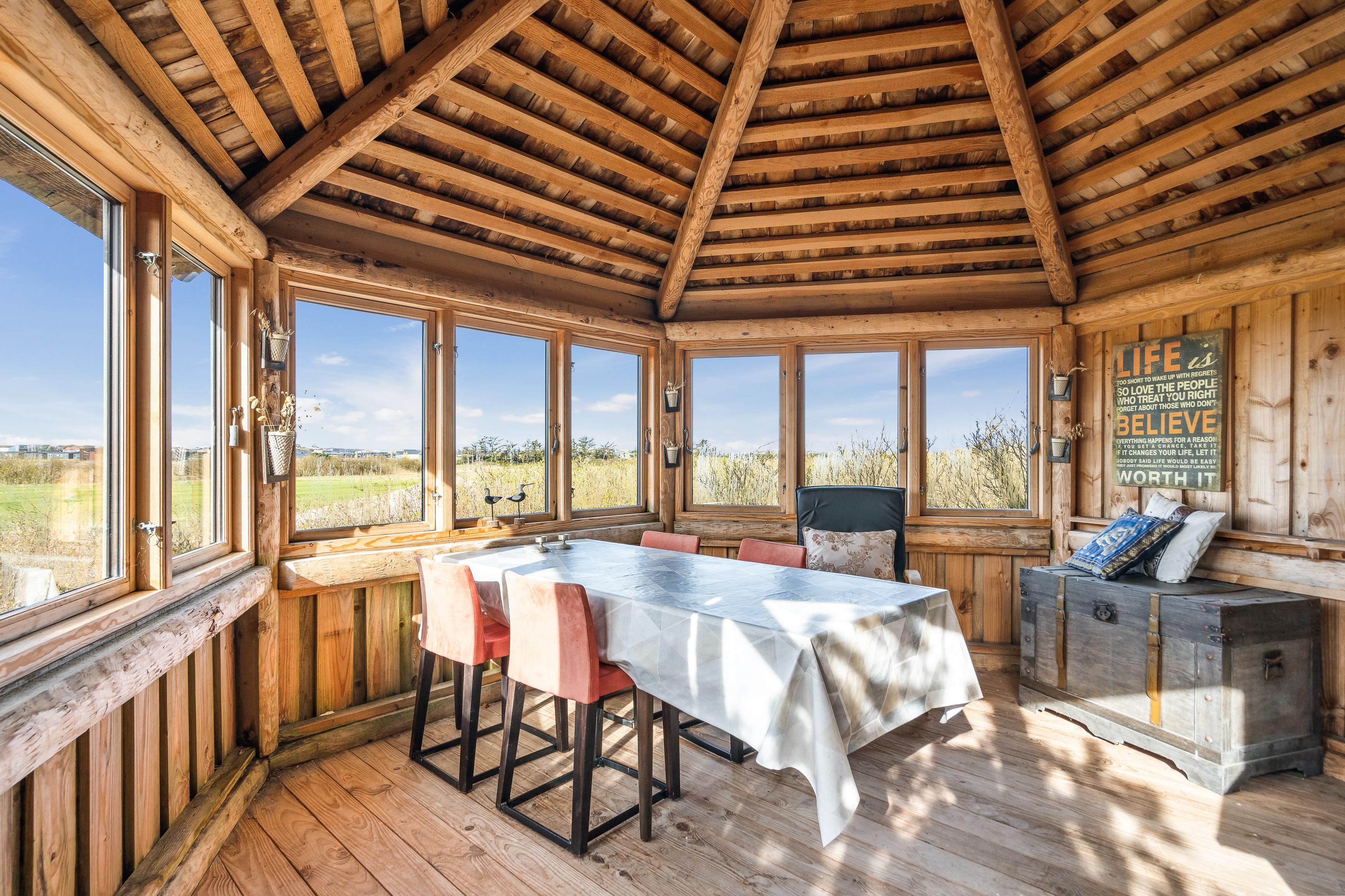 Udendørs kan I tilbringe lange, solrige dage i lysthuset – gemt væk bag ejendommen – med en fantastisk udsigt over golfbanen. Det er det perfekte sted at nyde morgenkaffen eller slappe af med et glas vin, mens I ser solnedgangen over det smukke landskab.