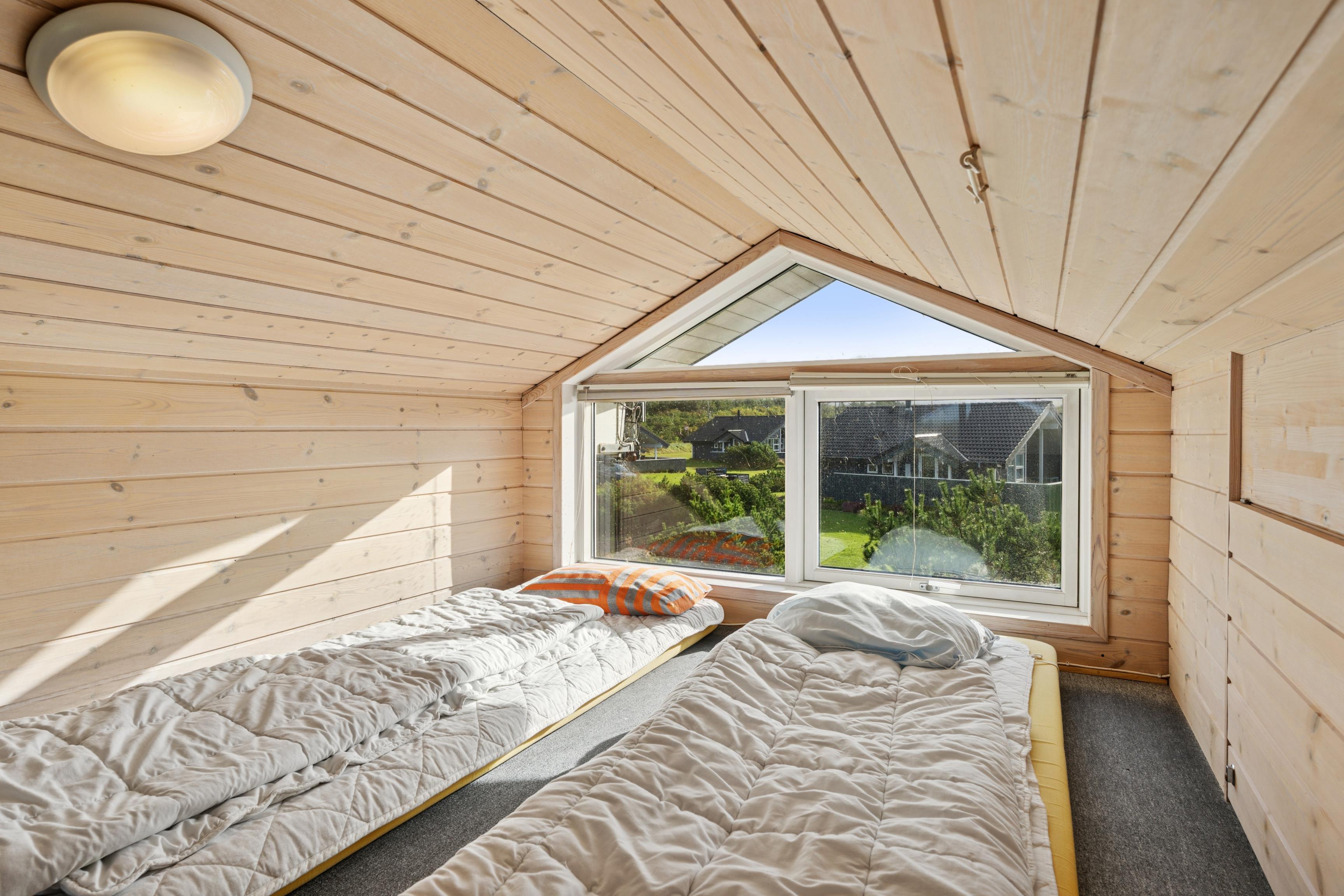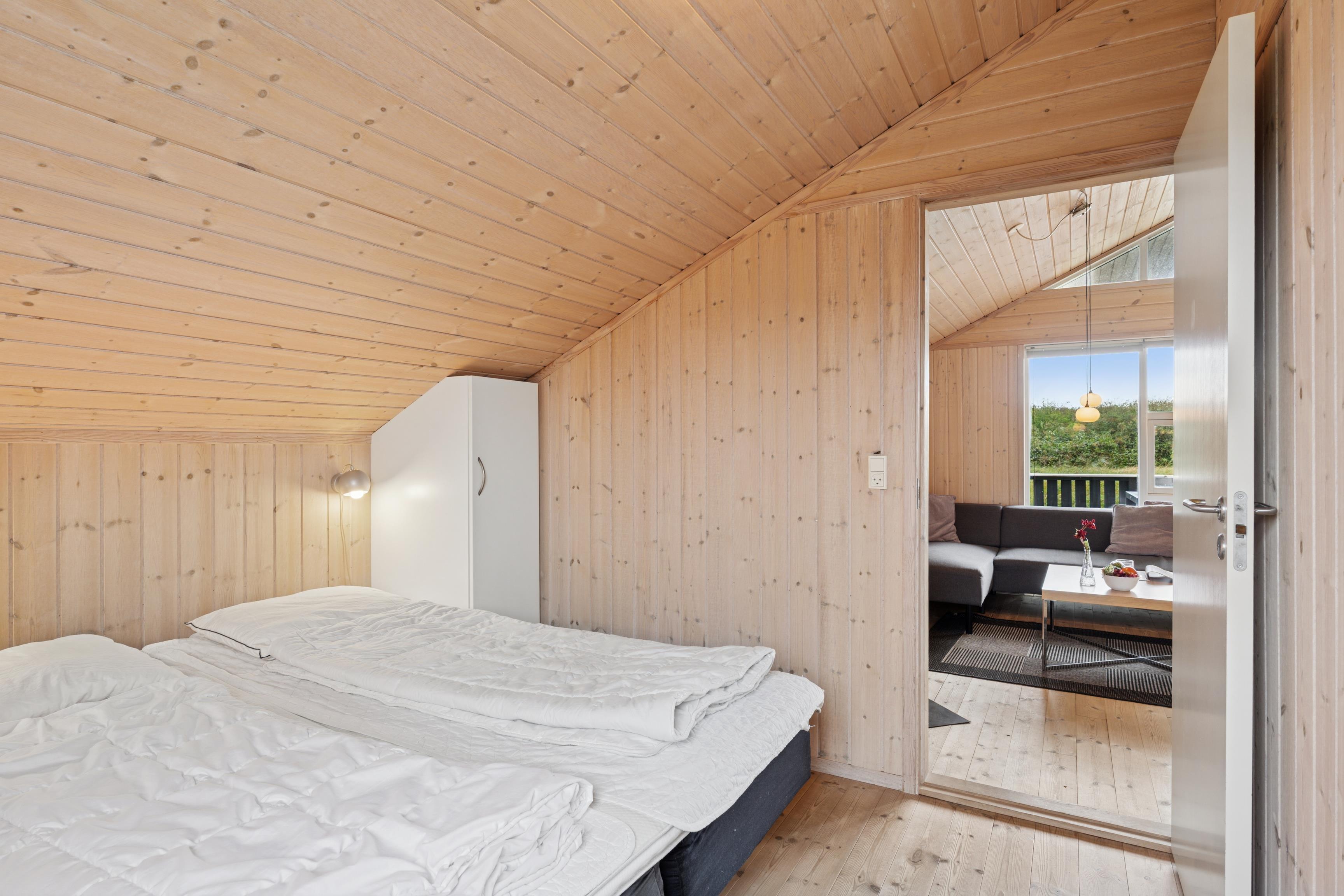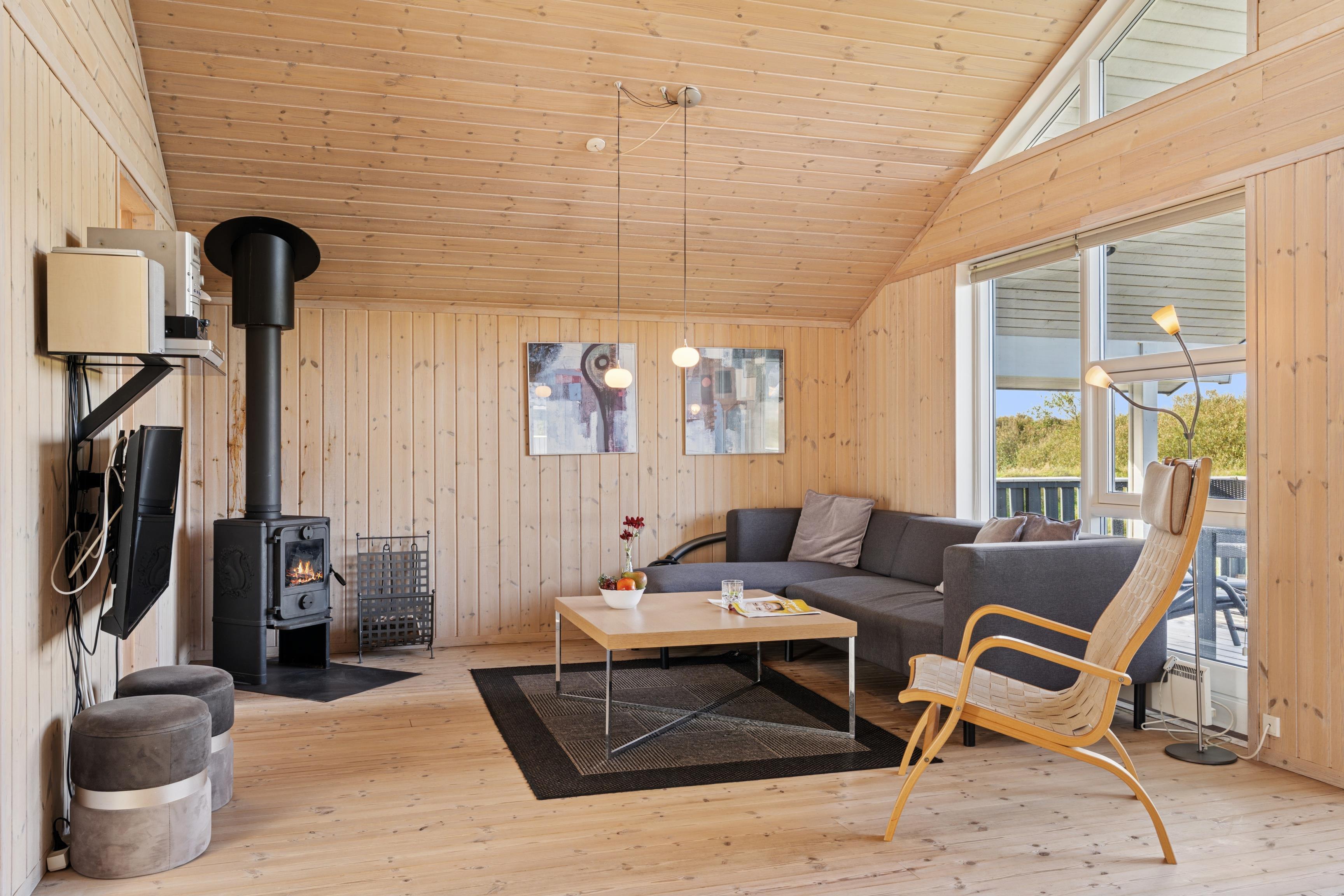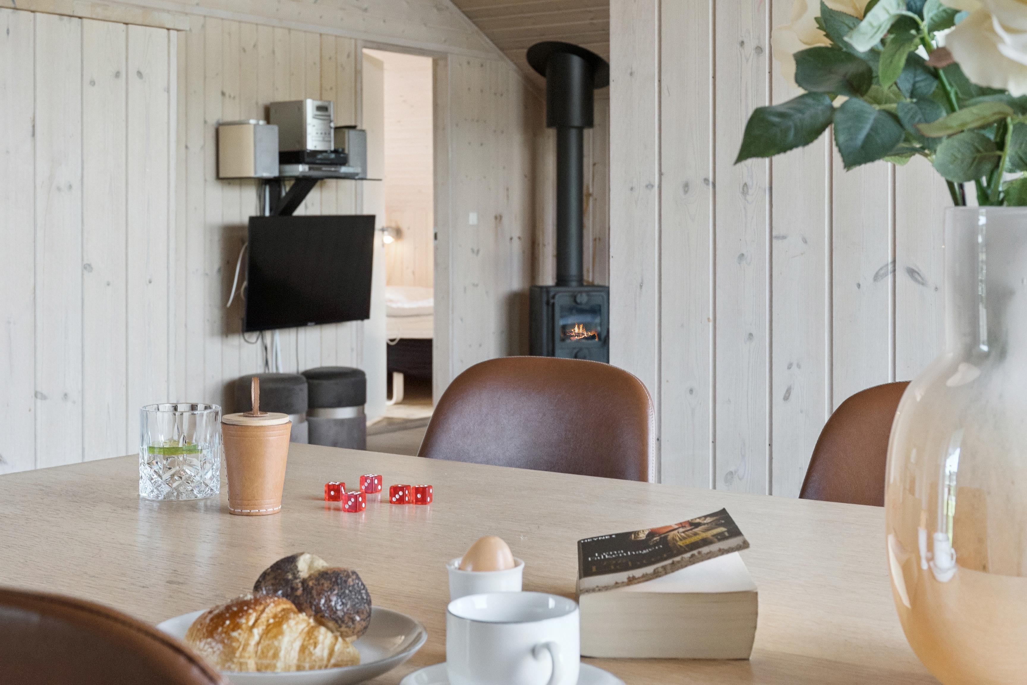Huset er indrettet med 2 værelser med dobbeltseng samt 2 soverpladser på hems. Stue, køkken og spiseplads er åbent, så i kan hygge jer sammen om madlavningen, et spil kort eller læse en god bog. Der kan tændes op i brændeovnen på de kølige dage, hvor roen kan sænke sig efter en aktiv dag. Badeværelset byder på både spa og sauna.