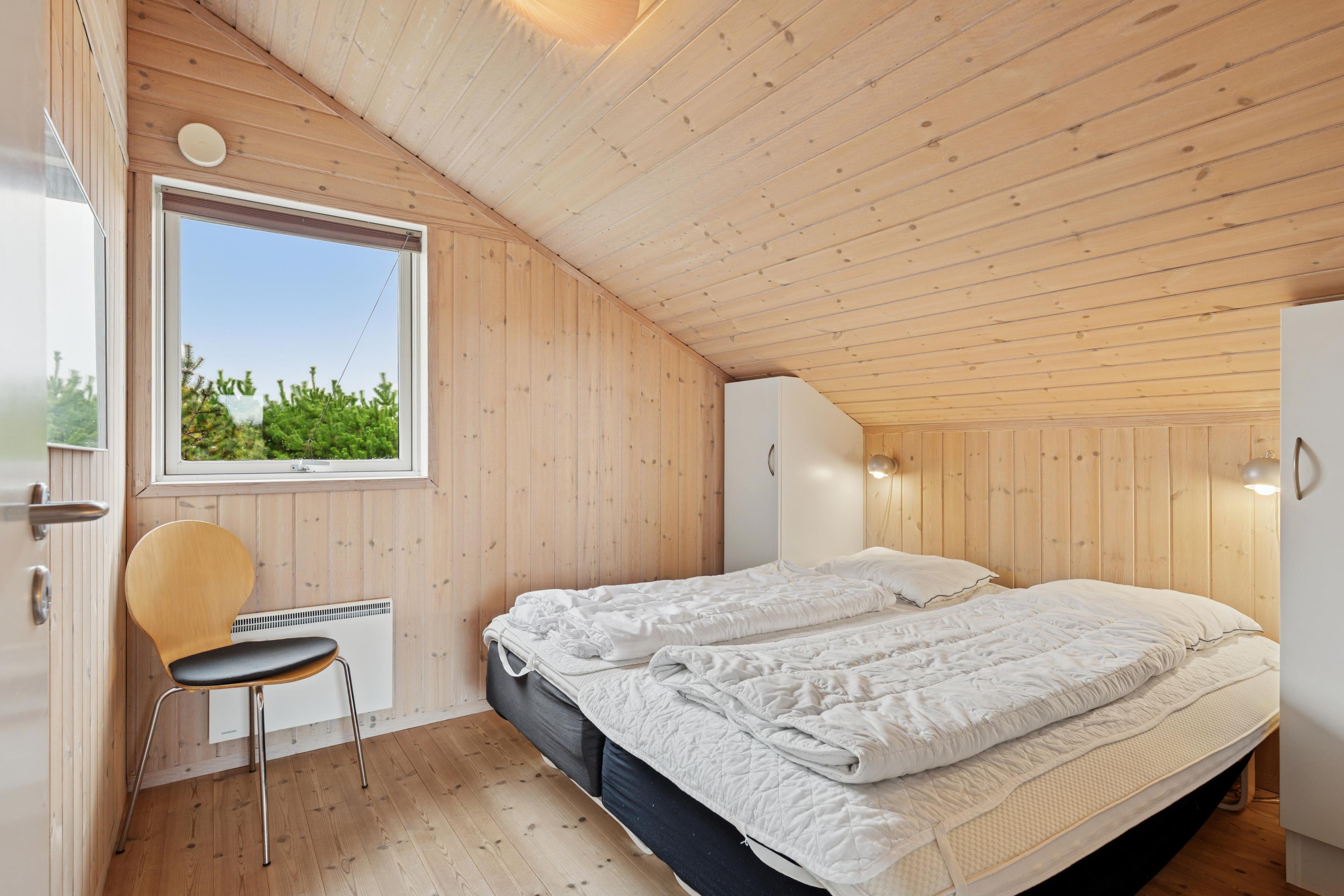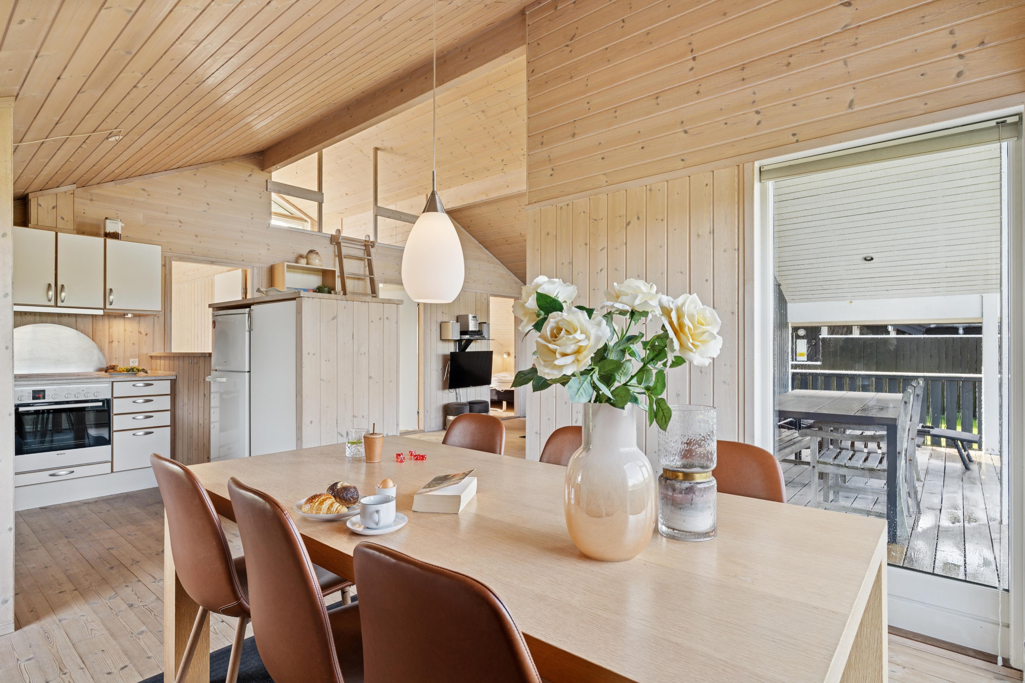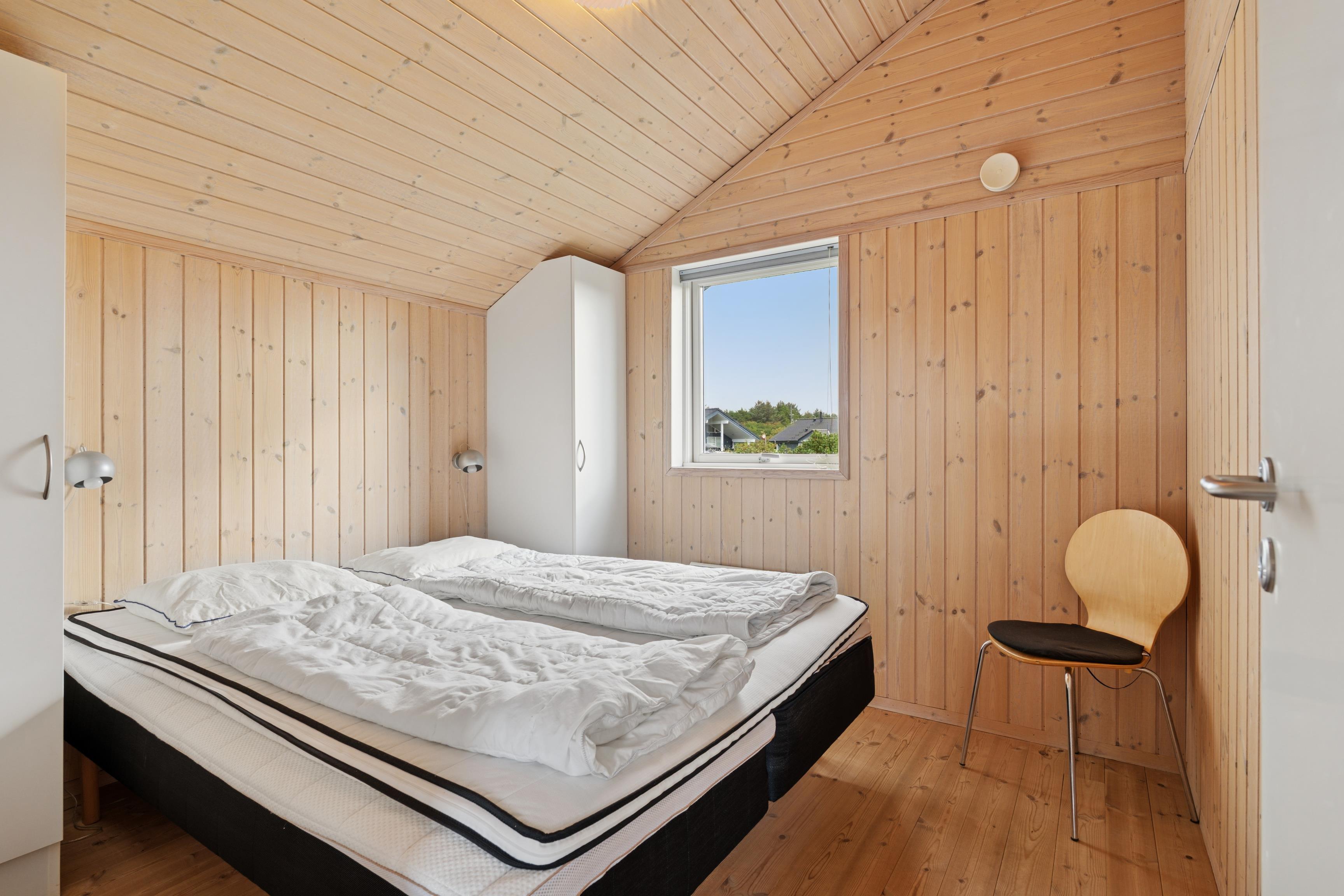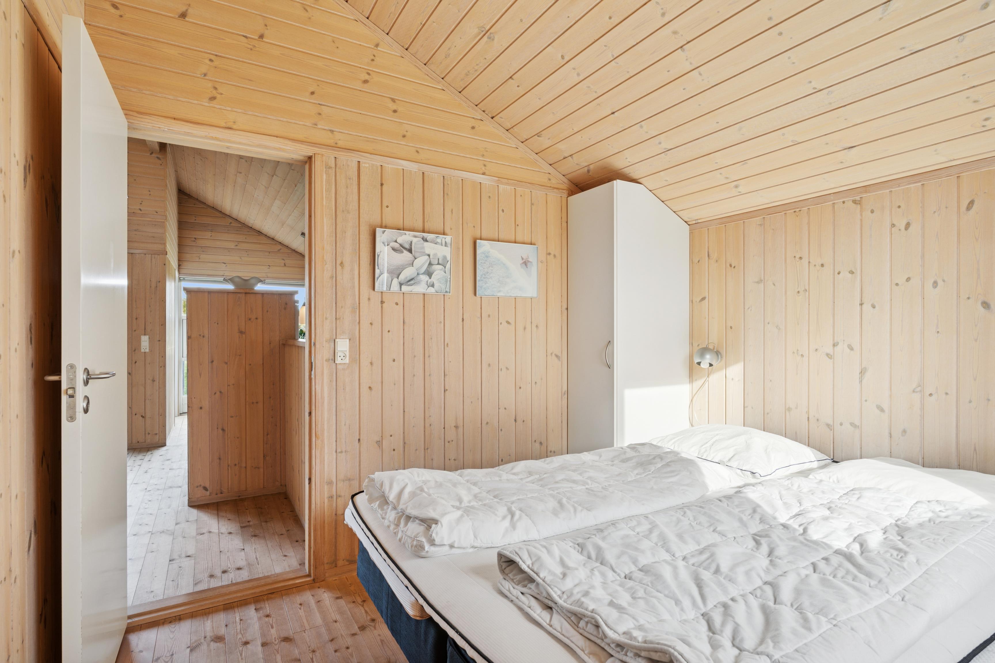 Huset er indrettet med 2 værelser med dobbeltseng samt 2 soverpladser på hems. Stue, køkken og spiseplads er åbent, så i kan hygge jer sammen om madlavningen, et spil kort eller læse en god bog. Der kan tændes op i brændeovnen på de kølige dage, hvor roen kan sænke sig efter en aktiv dag. Badeværelset byder på både spa og sauna.