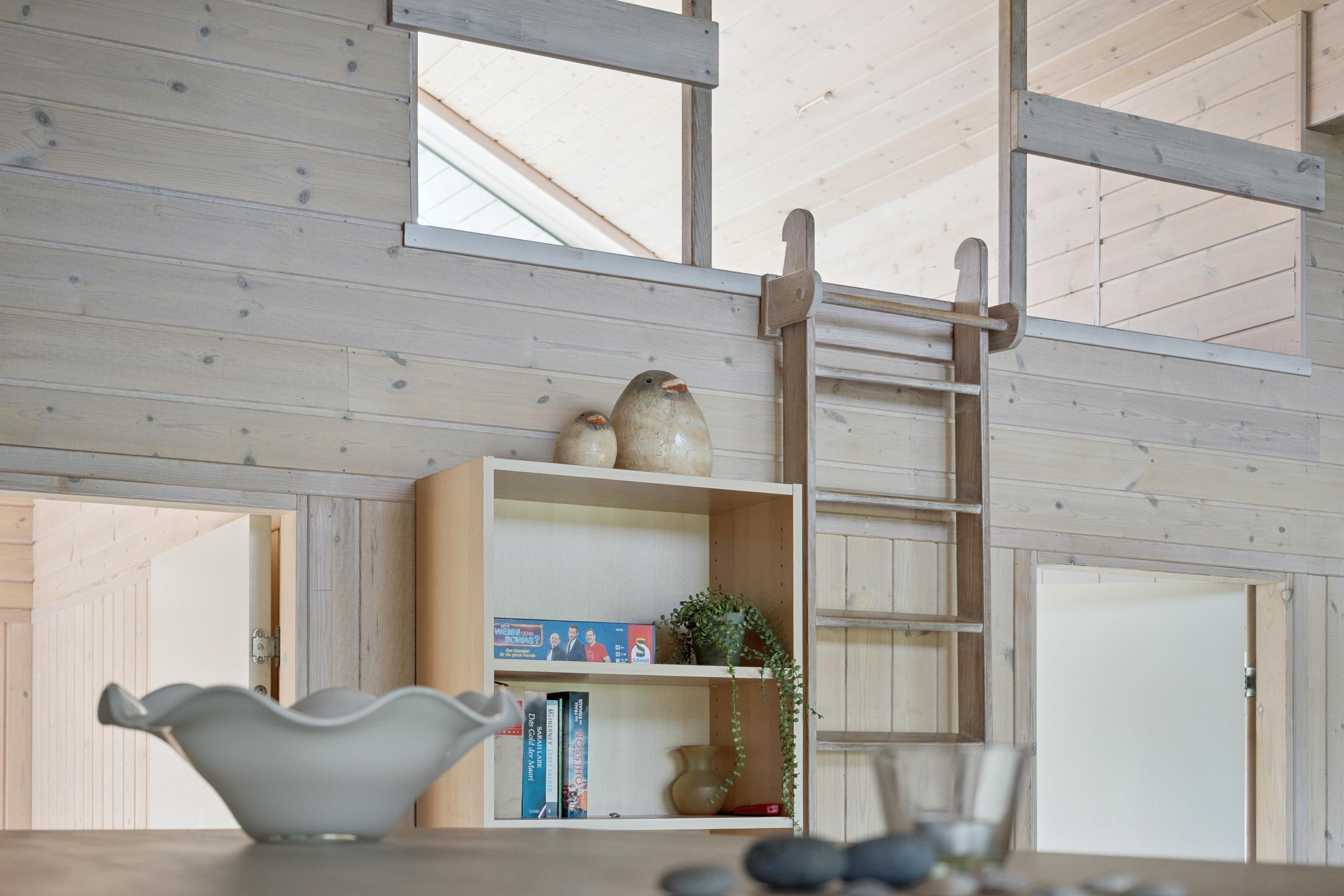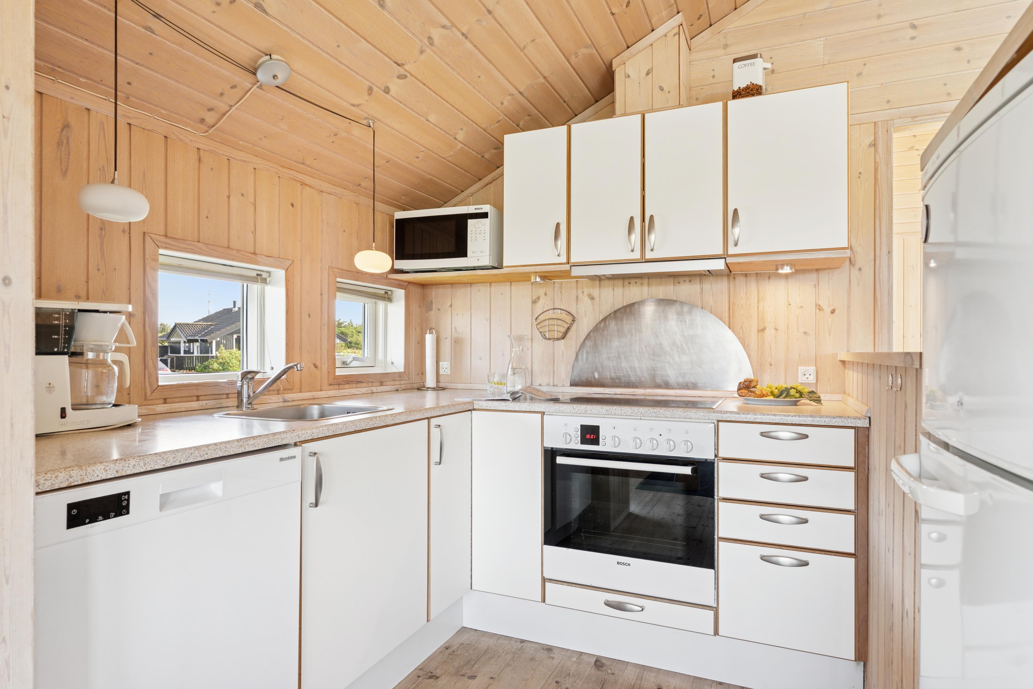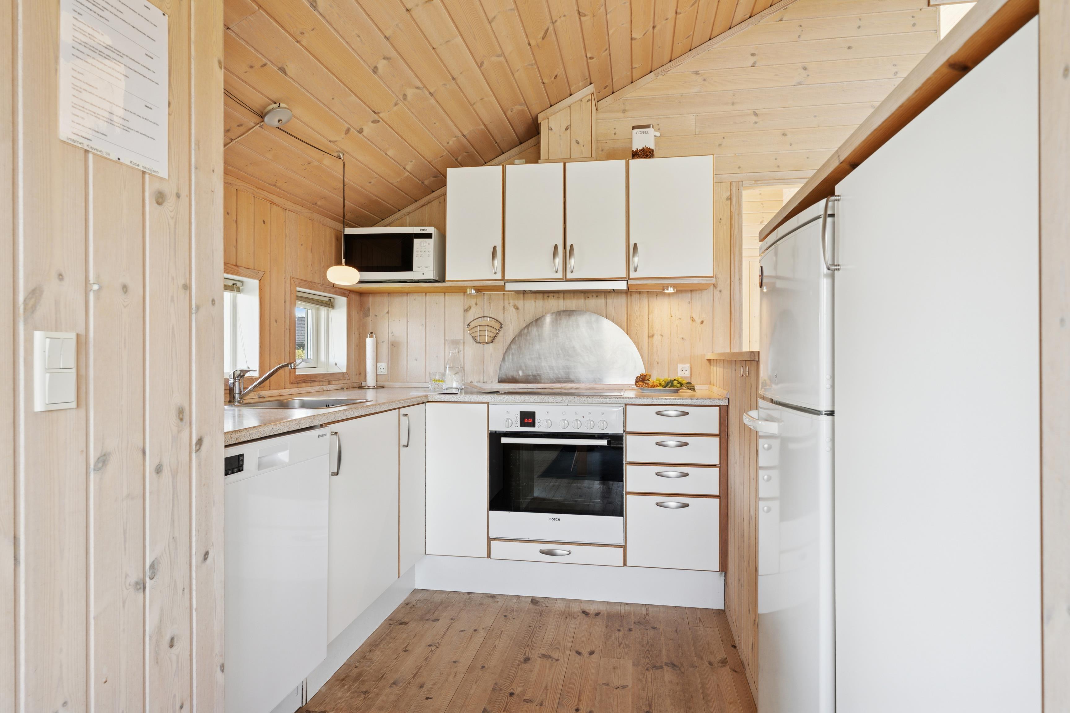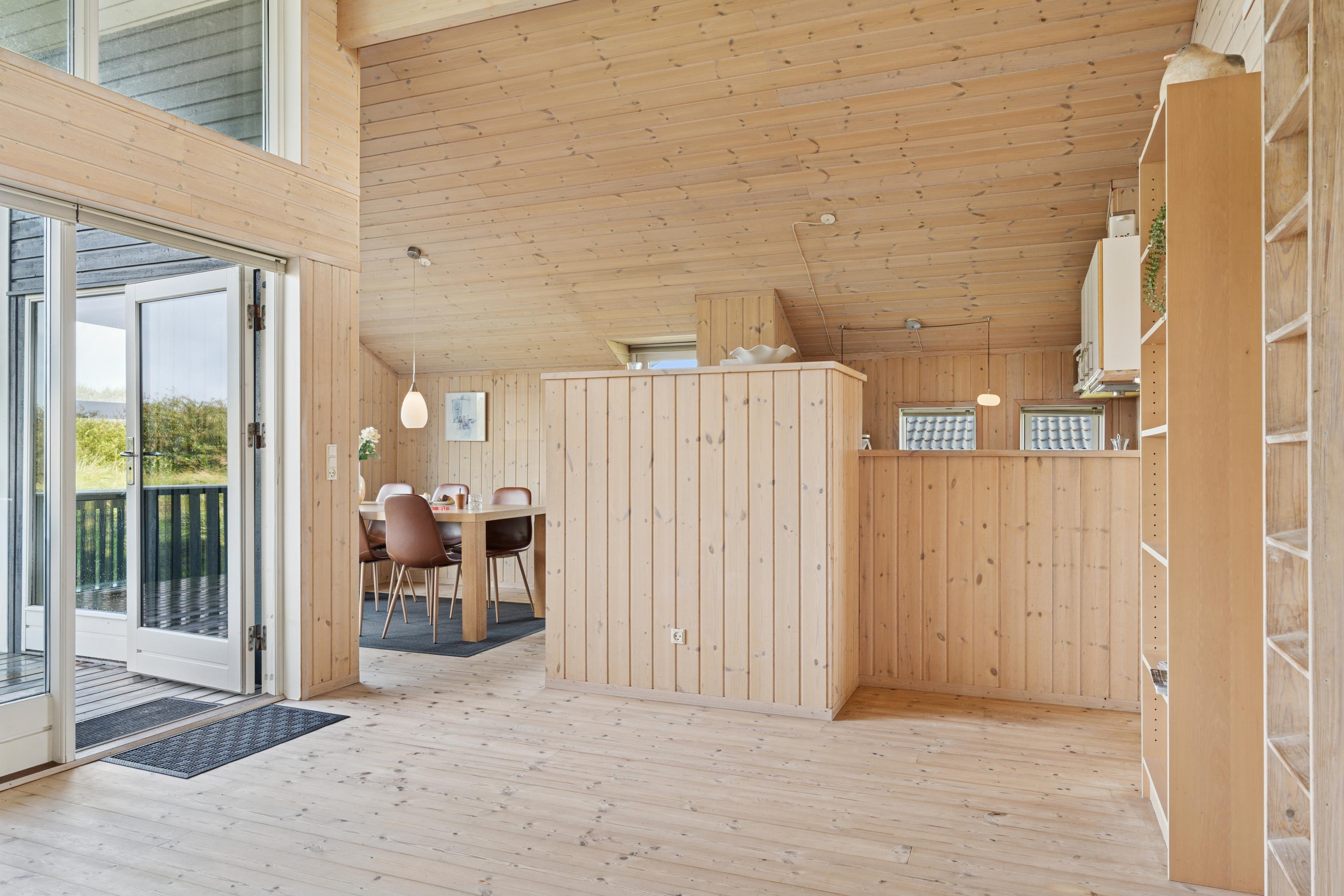 Huset er indrettet med 2 værelser med dobbeltseng samt 2 soverpladser på hems. Stue, køkken og spiseplads er åbent, så i kan hygge jer sammen om madlavningen, et spil kort eller læse en god bog. Der kan tændes op i brændeovnen på de kølige dage, hvor roen kan sænke sig efter en aktiv dag. Badeværelset byder på både spa og sauna.
