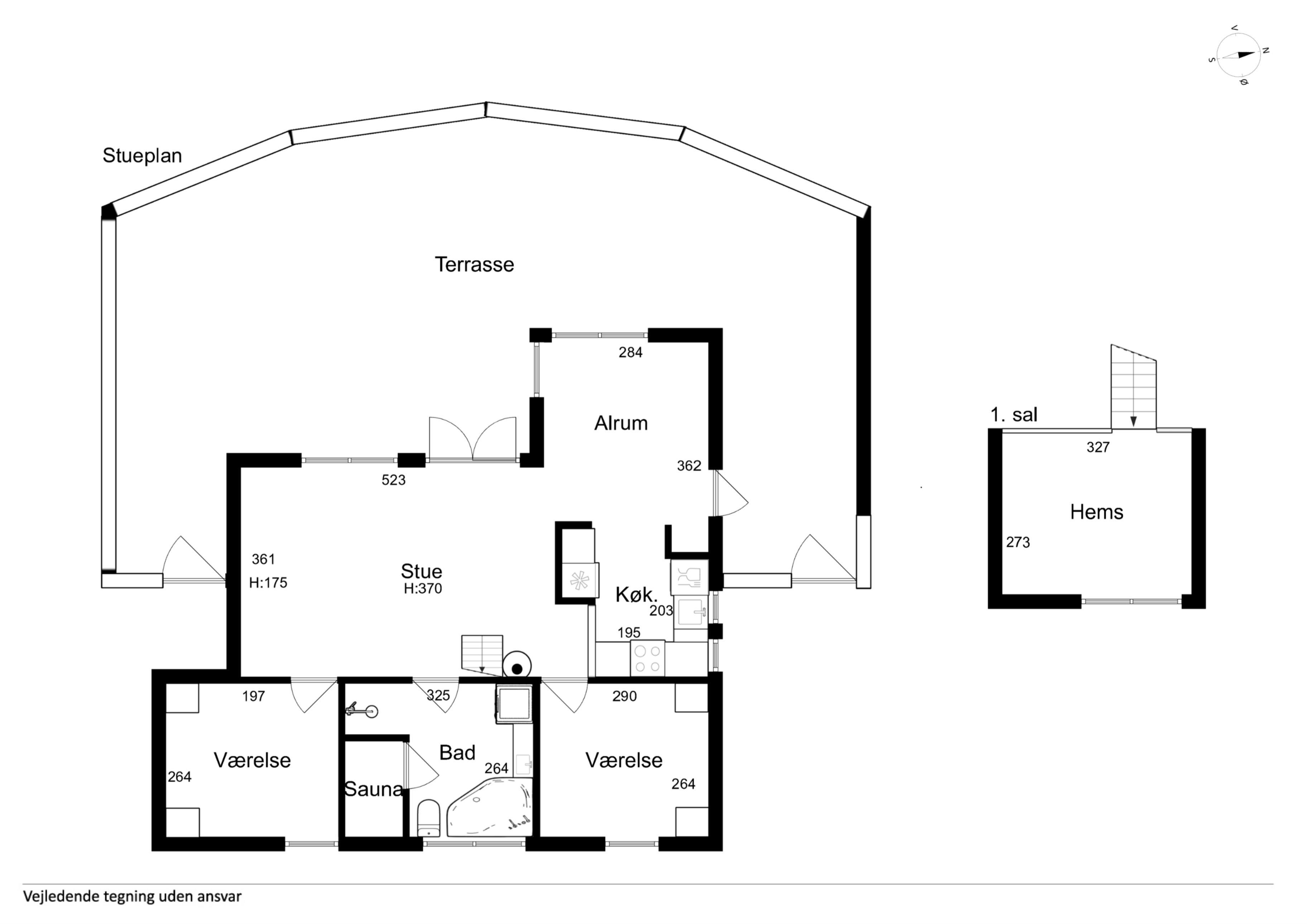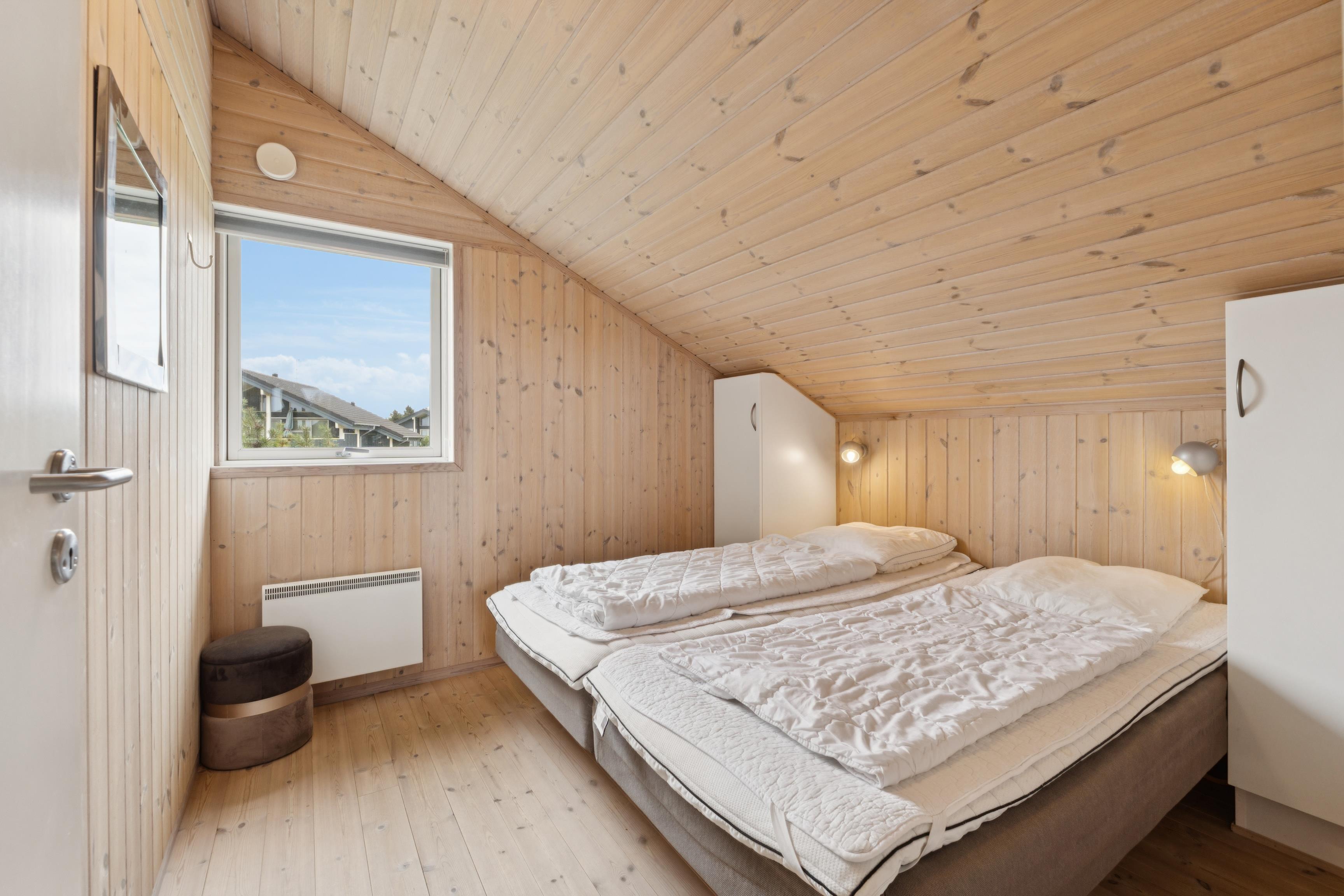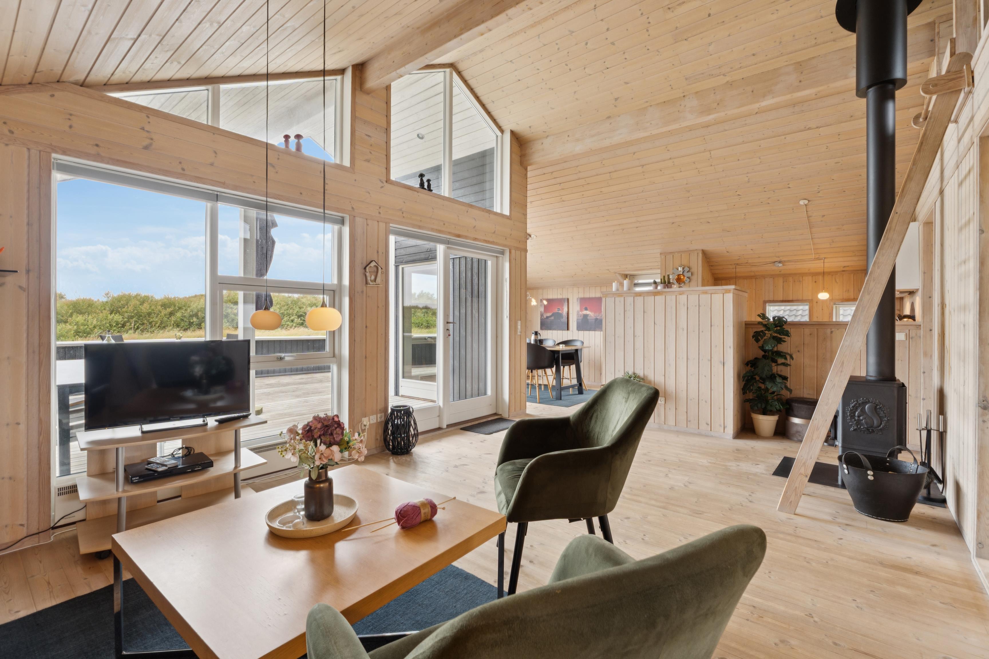 Stilfuldt indrettet – i alle områder – med et åbent køkken ud mod spisestuen og stuen og en stor lukket terrasse med vid udsigt over den danske natur har dette hus en særlig charme. Hele huset har trægulve af høj kvalitet, og møblerne er også af førsteklasses materialer. De to soveværelser er hver udstyret med en dobbeltseng og 2 skabe. Der er 2 sovepladser på en lys og åben hems, som kan nås via en stige og er bedst egnet til børn. I det lyse, hvidflisede badeværelse finder I en bruser, spabad og en sauna, hvor I kan slappe af og nyde jeres infusioner. Vaskemaskinen er også placeret her.