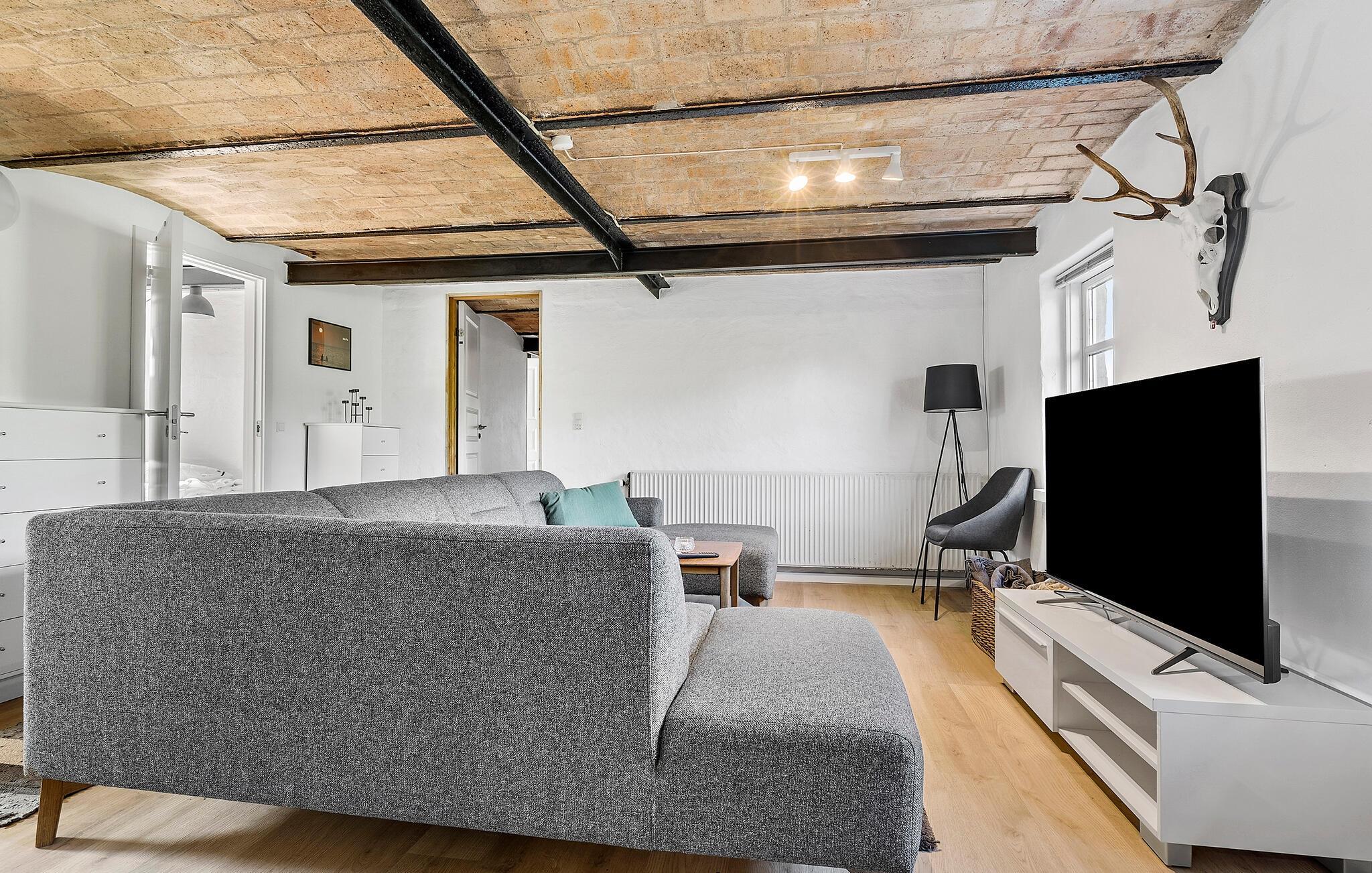Velkommen til denne nydelige lejlighed, der ligger i et tidligere landsted i Thy lige mellem Flade og Ørum Sø. Lejligheden er nydeligt indrettet med rå murstenslofter og varme træbjælker, der vidner om boligens tidligere virke. Kombineret med de komfortable møbler, de fine detaljer i udsmykningen og det veludstyrede køkken får I her den perfekte base for en dejlig ferie med den udvidede familie eller flere vennefamilier. Dæk op til den store festmiddag ved det rustikke spisebord af træ og nyd udsigten over vandet, inden I runder aftenen af i sofaen med brætspil eller en god film til sent. Hvis vejret bider lidt fra sig, kan I tænde op i pillebrændeovnen, der giver varme og det helt rette, knitrende lydtapet til aftenhyggen.