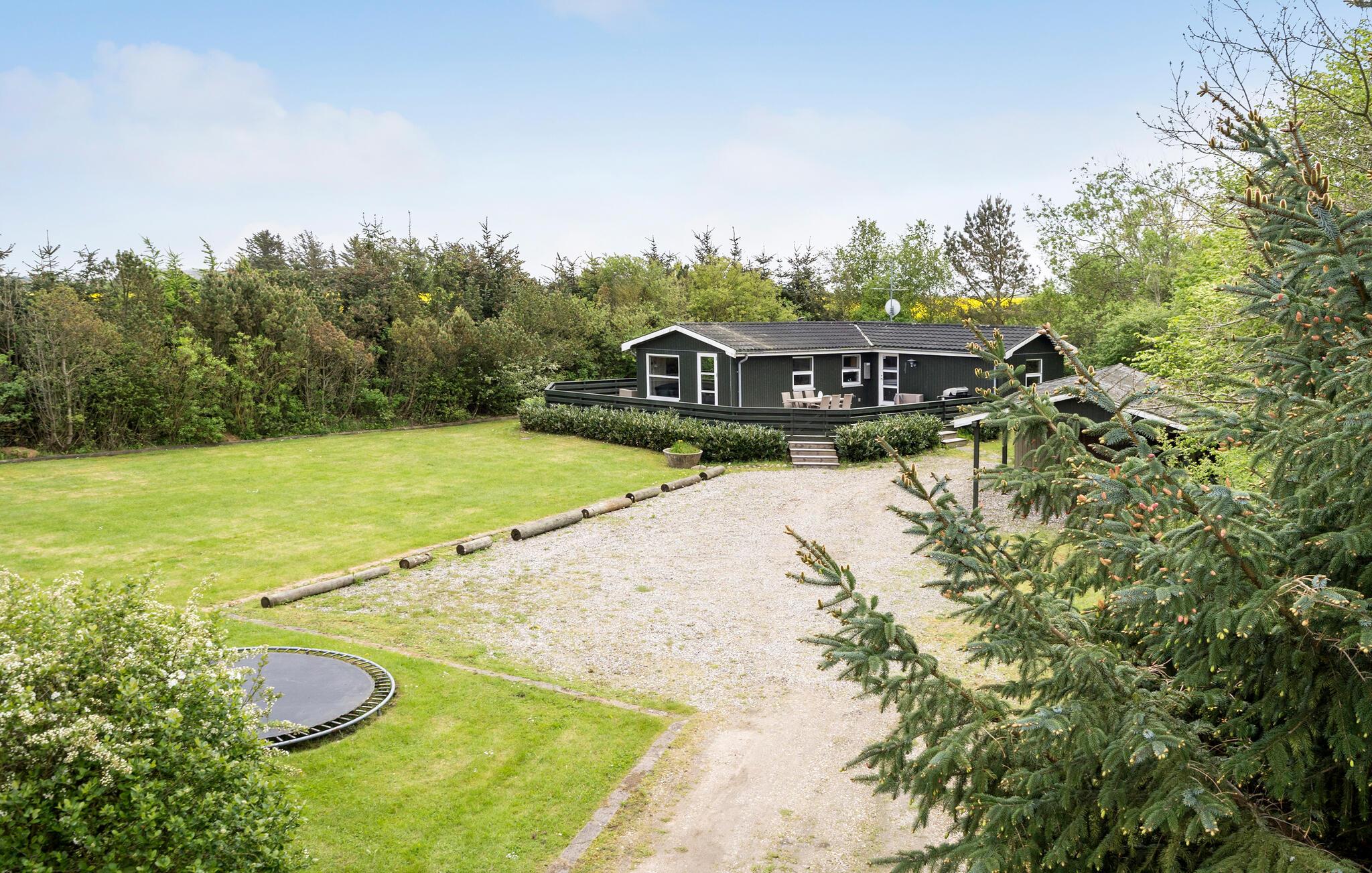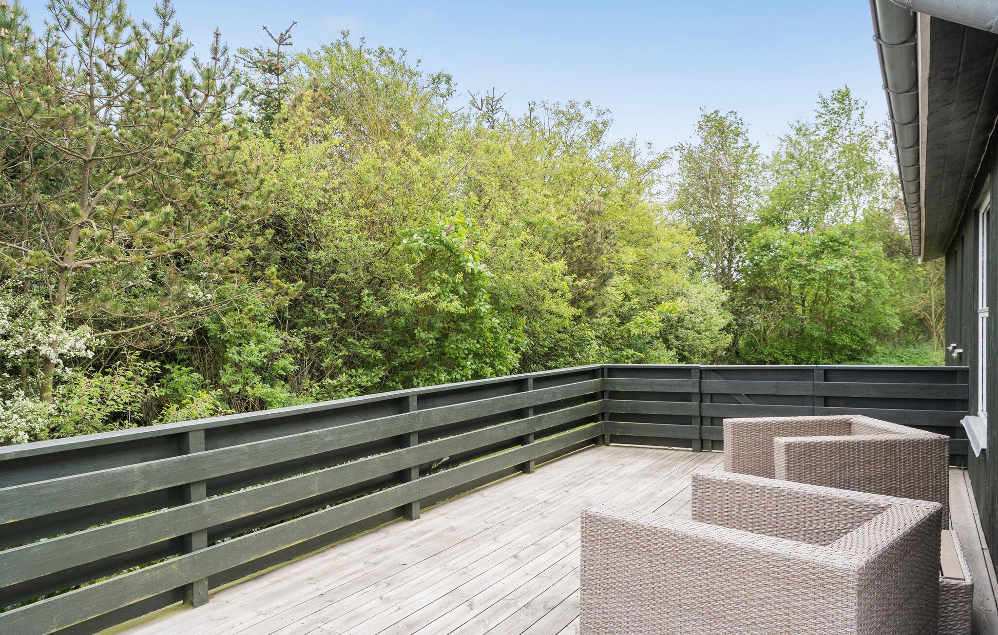 Flot træhus i Vestjylland med stor terrasse, nær Vesterhavet og Søndervig, ideelt til familieferie med hygge og aktiviteter.