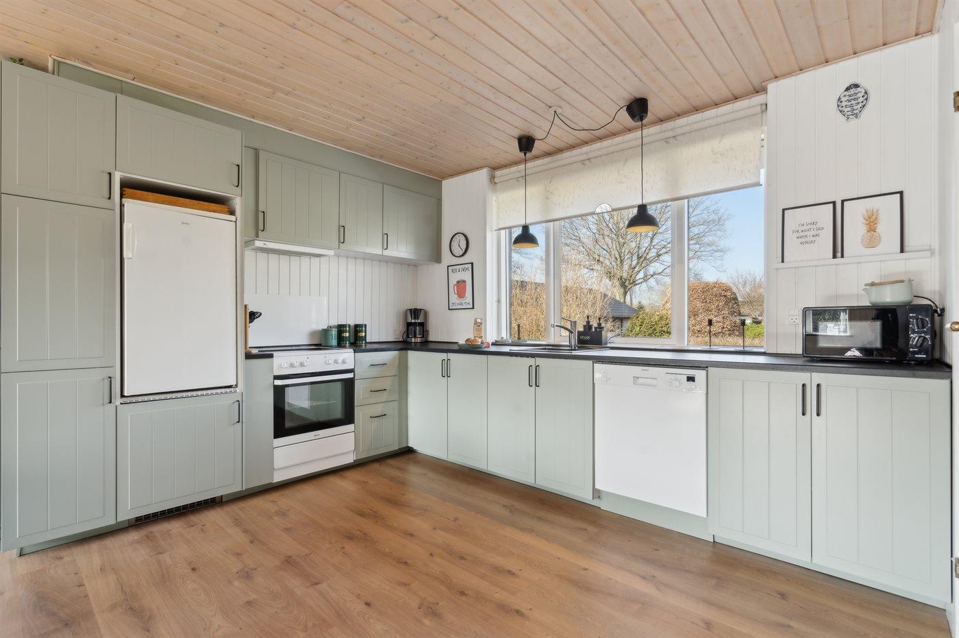 Køkkenet er udstyret med 1 køleskab. Der er 4 keramiske kogeplader, varmluftovn, mikrobølgeovn samt opvaskemaskine.