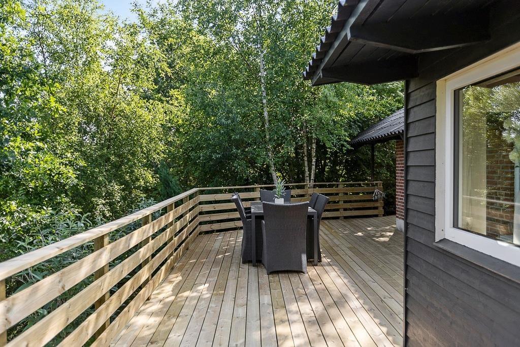 Udenfor inviterer den store, delvist overdækkede træterrasse til lange sommeraftener med grill, mad, vin og snak under stjernerne. Haven er indhegnet, så både små og firbenede lettere kan fare frit omkring, mens duften af nyslået græs og lyden af fugle i skovbrynet løfter sanserne. Her kan børnene lege, små fødder kan løbe frit, og små øjeblikke under åben himmel – som en stille stund med en bog eller en leg – bliver til dyrebare ferieminder i alle aldre.