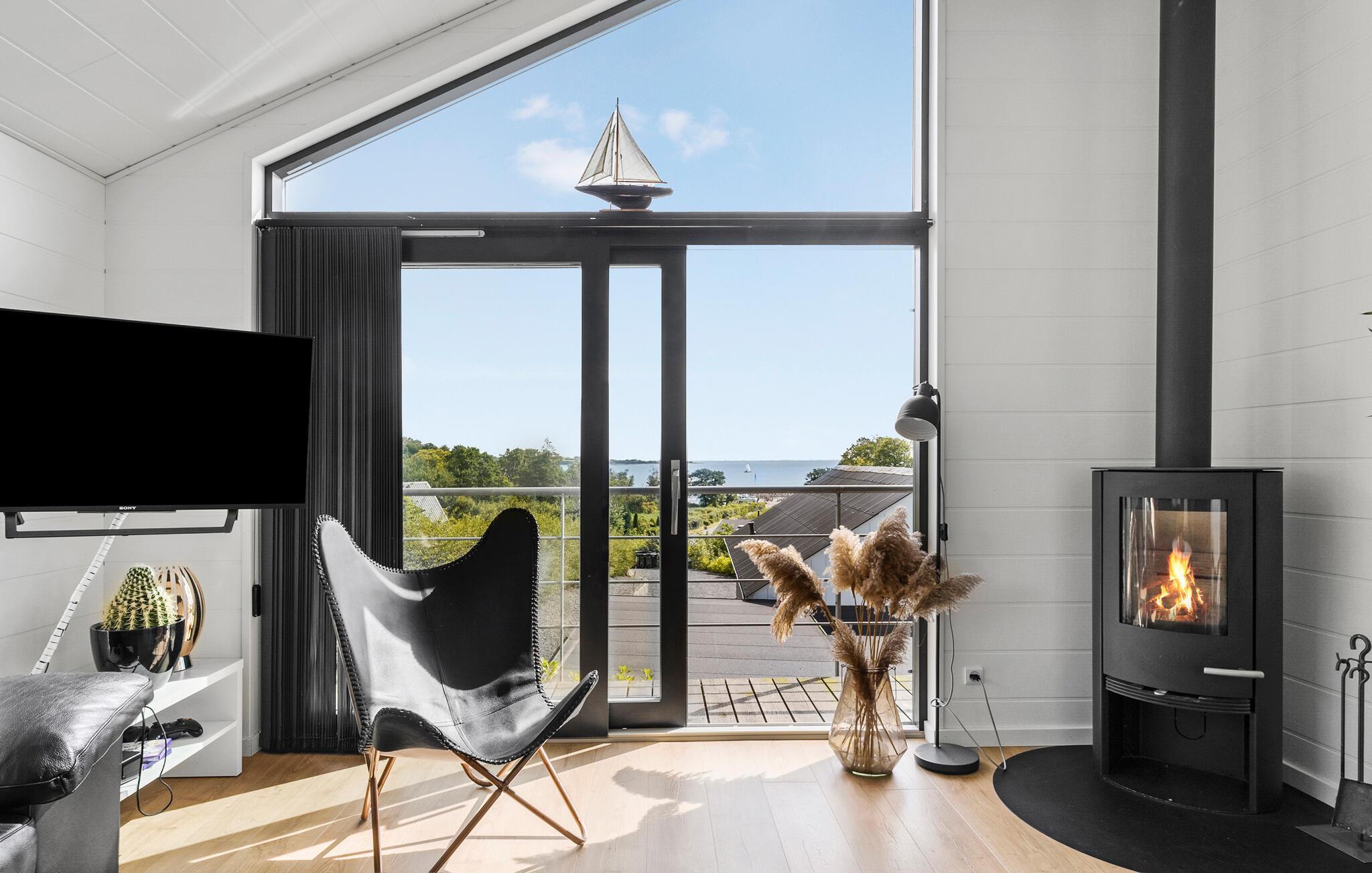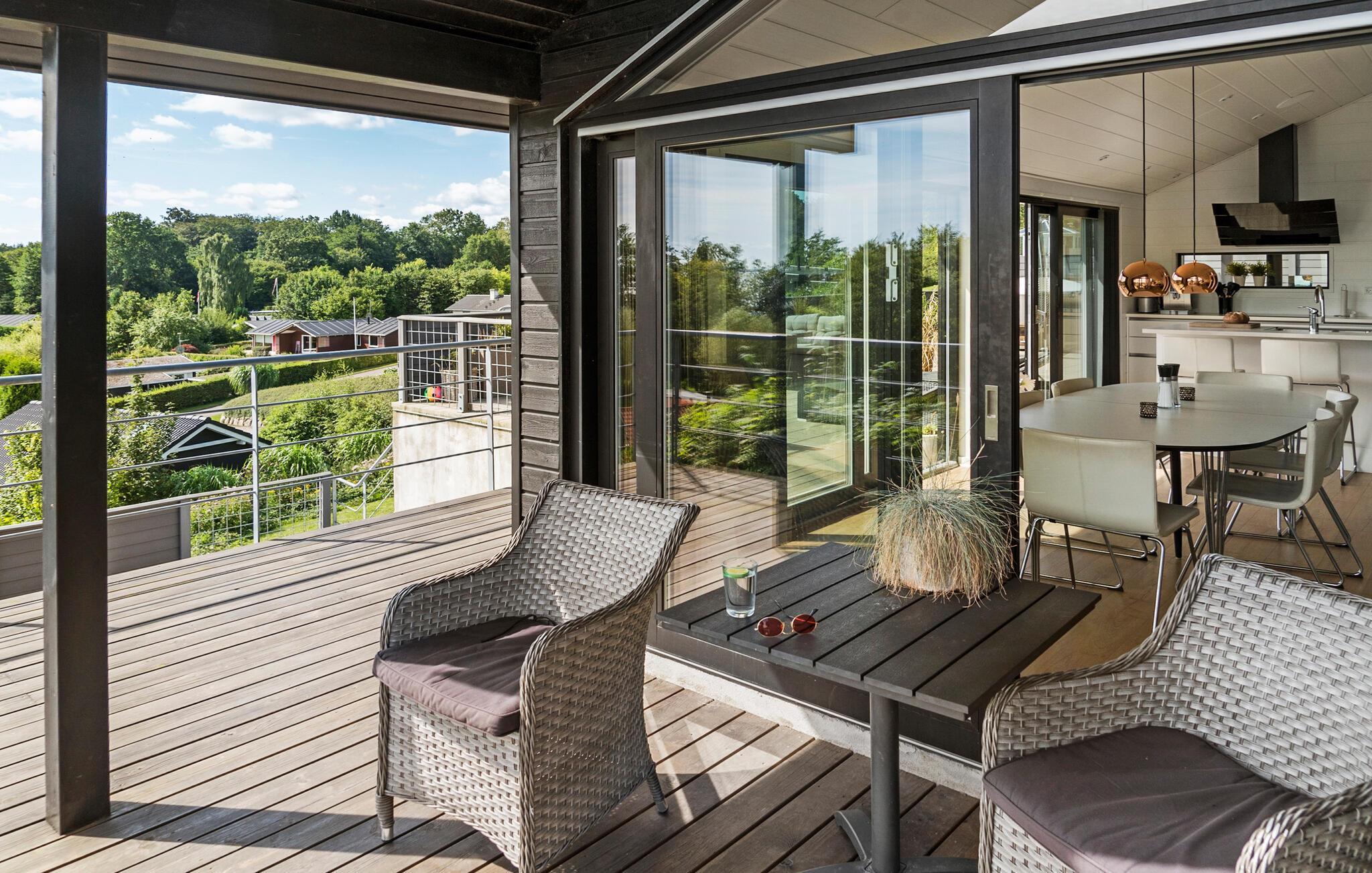 Nyd den varme feriestemning i et flot og lækkert sommerhus med havudsigt.