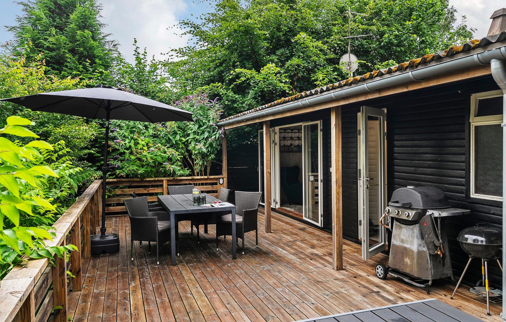 Udnyt det rummelige udendørsområde på den kuperede grund med dens frodige vegetation til afslappende timer. Spis på træterrassen, grill på varme sommeraftener eller træk jer tilbage til det beskyttede haveområde. Slap af i spabadet og nyd freden og roen midt i denne grønne oase.