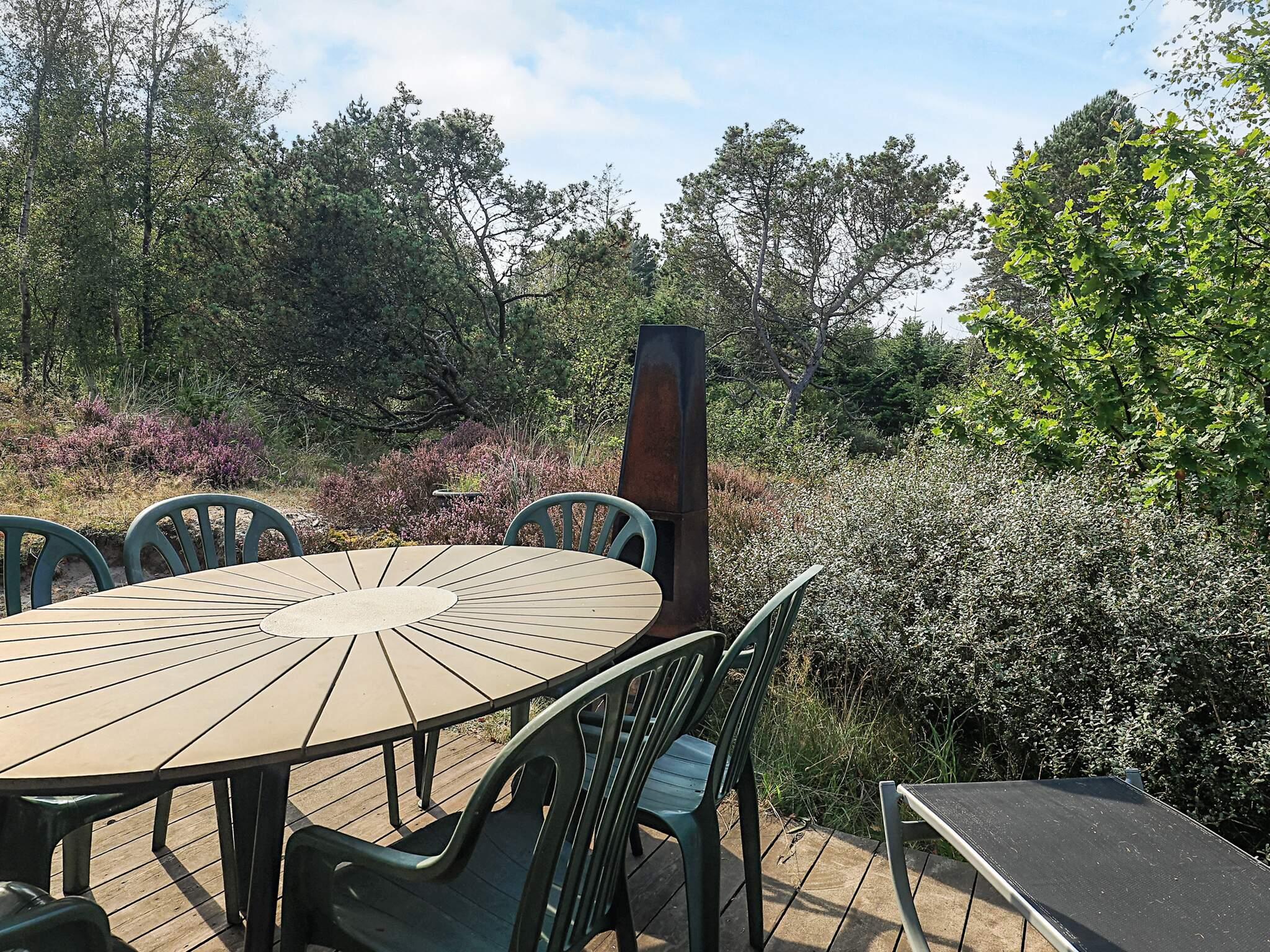 Huset er beliggende på en 1100 m² stor naturgrund med åbent terrasseareal. Desuden er der overdækket terrasse. Gasgrill til rådighed. Der er 1700 m til havet. Udlejes ikke til ungdomsgrupper og Håndværkere.