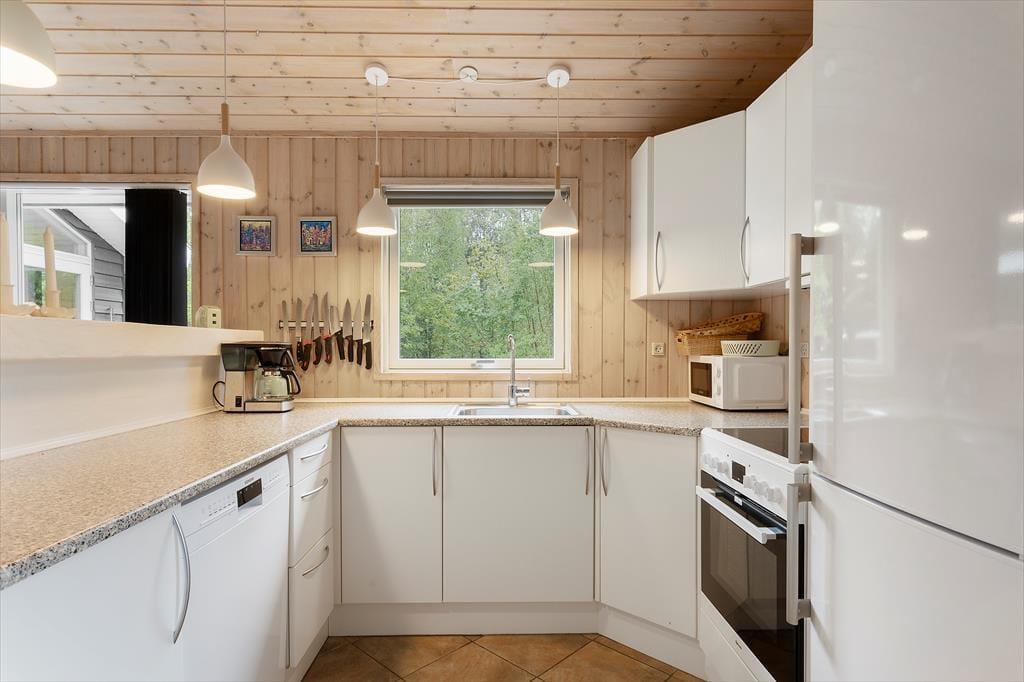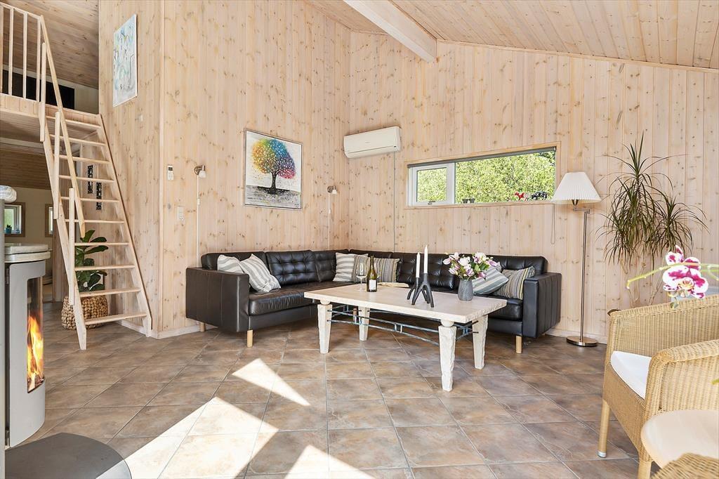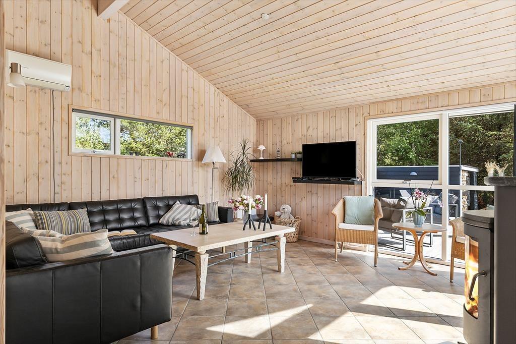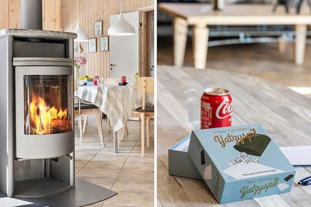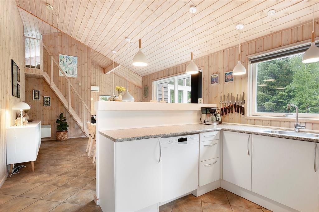 Sommerhuset byder på en lys og venlig atmosfære, der straks får dig til at føle dig hjemme. Stuen er rummelig og har store vinduer, der inviterer sollyset indenfor og giver et dejligt kig ud til de grønne omgivelser. Den åbne planløsning mellem stue og køkken gør det let at være sammen, uanset om I laver mad, spiller spil eller slapper af i sofaen. Med sit indbydende interiør og komfortable møbler er huset som skabt til hyggelige stunder med familien, uanset om det er foran brændeovnen på en kølig aften eller ved spisebordet til en fælles middag.