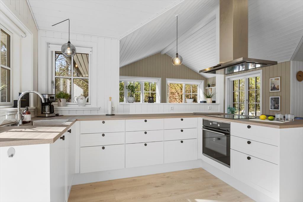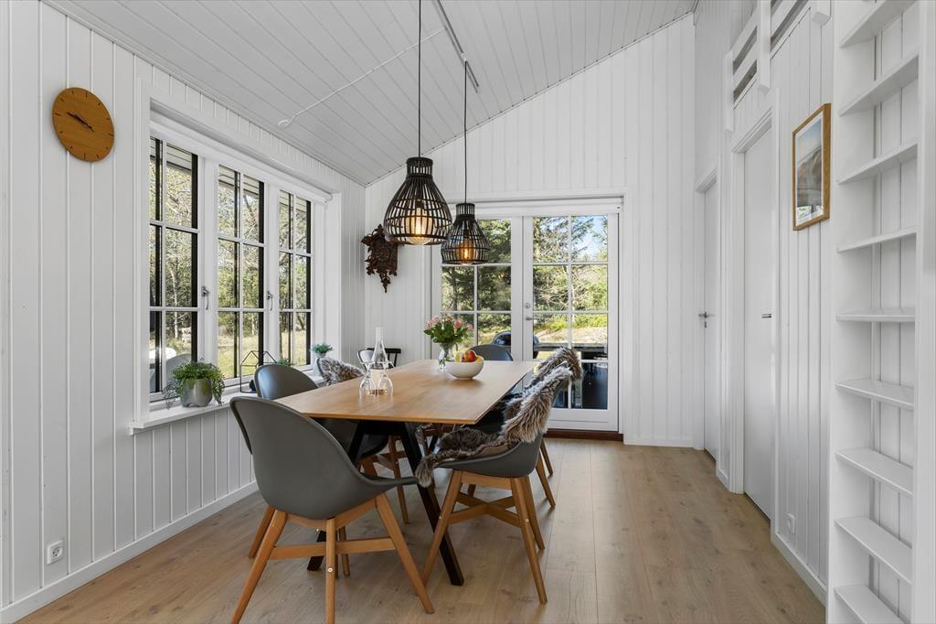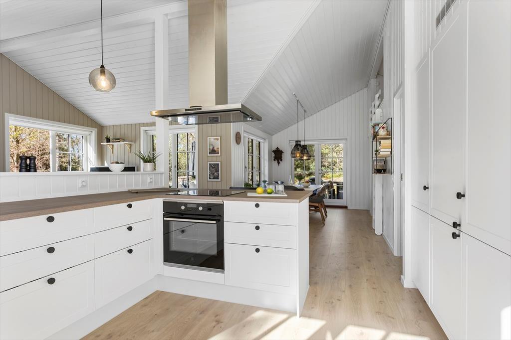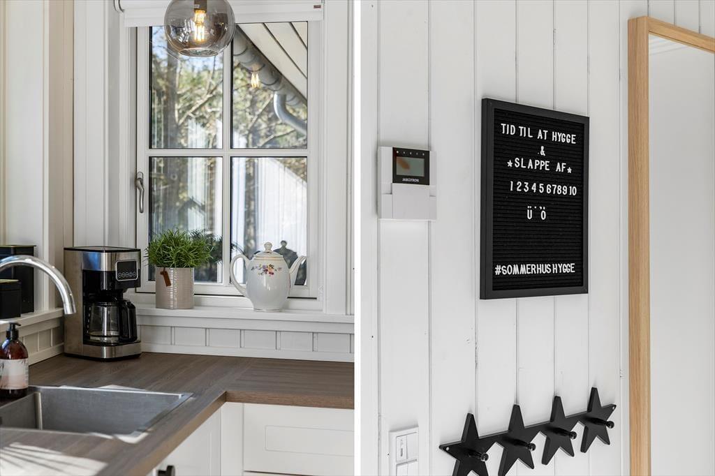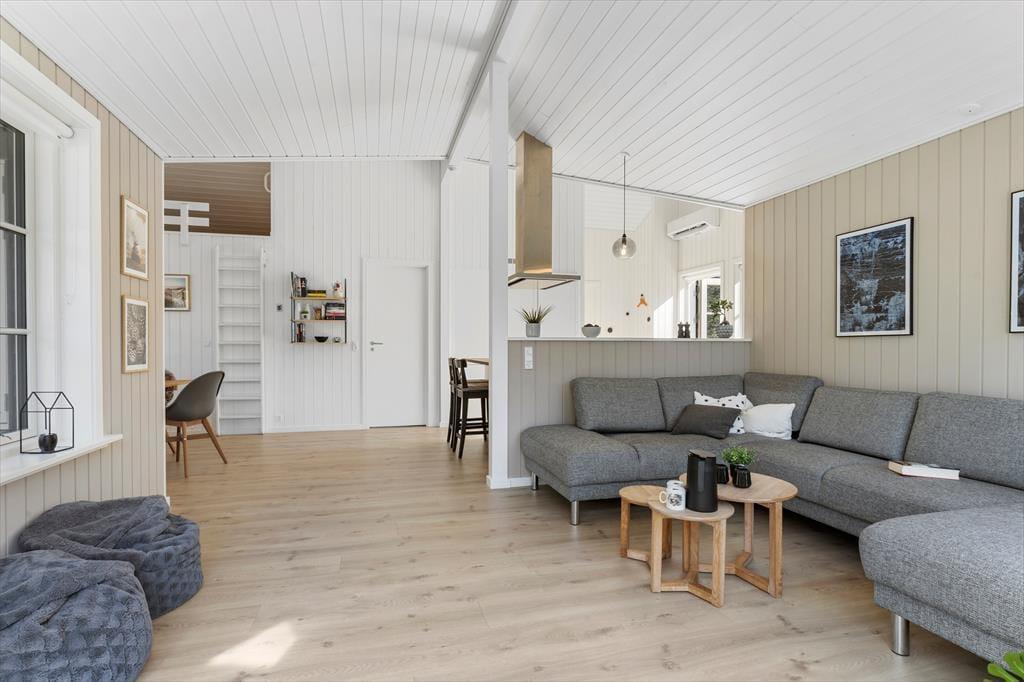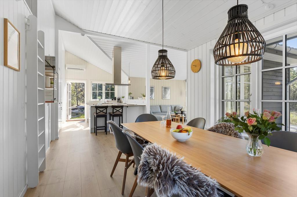 Det nybyggede sommerhus fra 2022 byder dig velkommen med en indbydende og harmonisk atmosfære. De hvide sprossevinduer lader lyset strømme ind og skaber en skøn kontrast til den mørke træfacade. Indenfor er planløsningen ideel, så der er god plads til både afslapning og samvær. Stuen er hjertet i huset, hvor du kan samles med dine kære til hyggelige aftener i sofaen eller lange middage ved spisebordet. Det åbne køkken gør det let at være sammen, selv når der trylles lækker mad frem til feriens måltider. Hele sommerhuset udstråler kvalitet og komfort, så du kan få en afslappende ferie i skønne omgivelser.