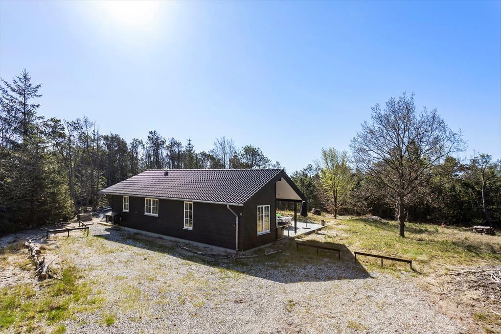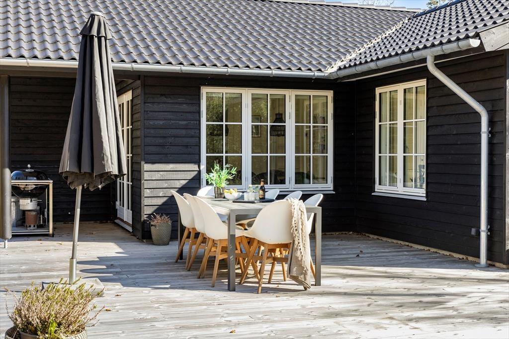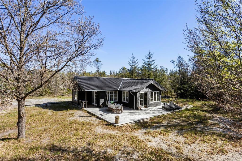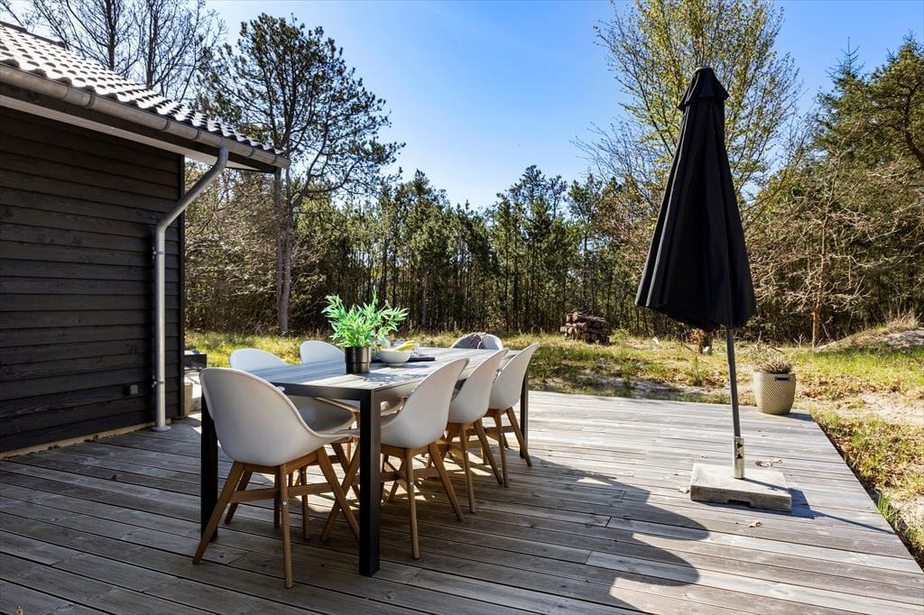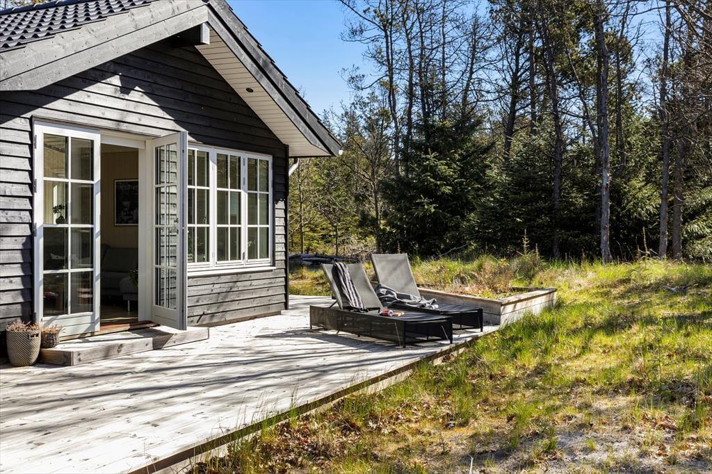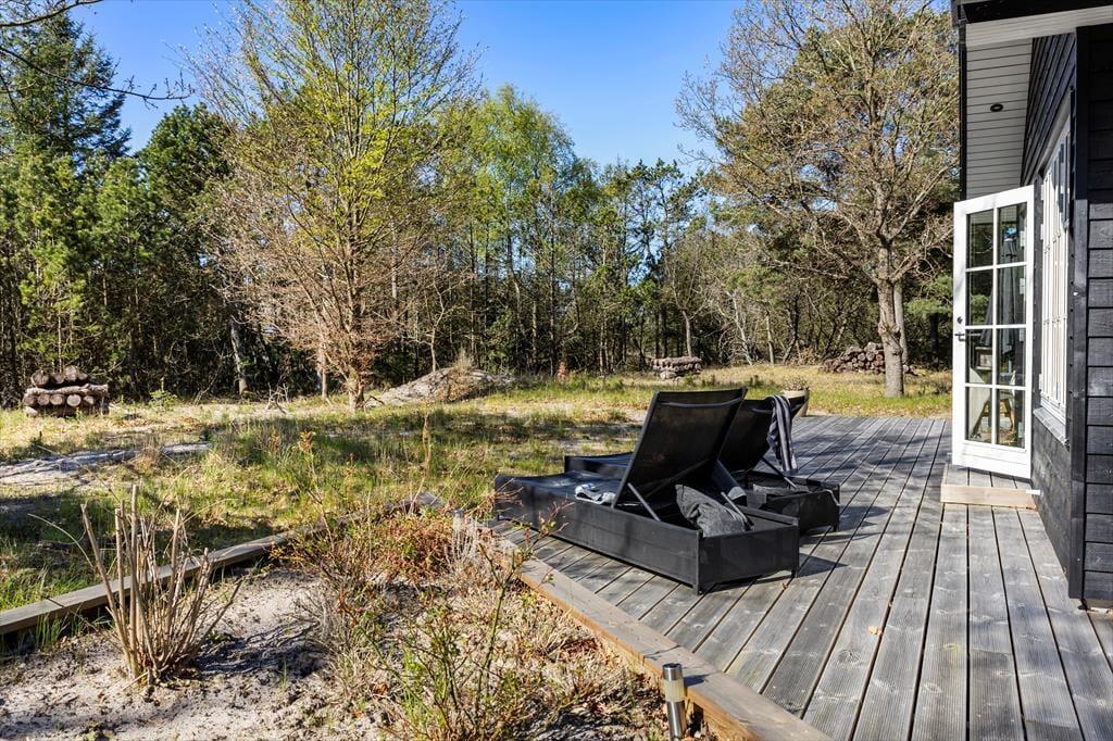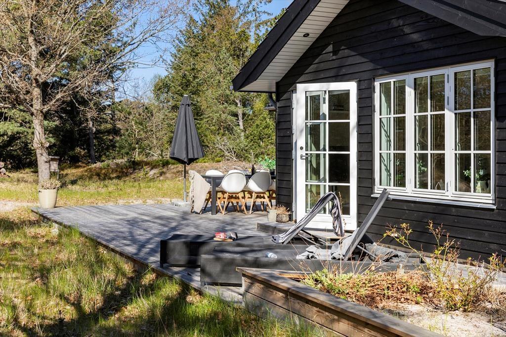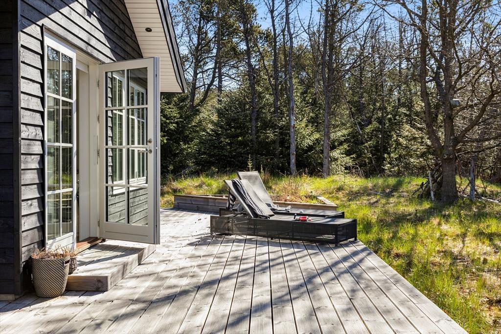 Den store træterrasse inviterer til lange dage i solen og hyggelige aftener med grillmad og gode samtaler. Her kan du nyde morgenkaffen til fuglenes kvidren og lade dagens første solstråler varme ansigtet. Terrassen har masser af plads til både spiseområde og liggestole, så du kan finde det perfekte spot til både afslapning og samvær. Omkring sommerhuset strækker naturen sig vidt, og du kan let begive dig ud på smukke gåture i det kuperede landskab eller tage en kort køretur til stranden for en forfriskende dukkert i Vesterhavet.