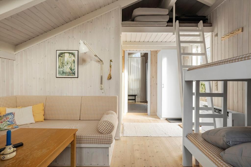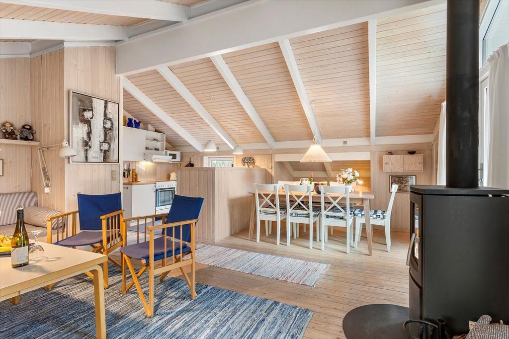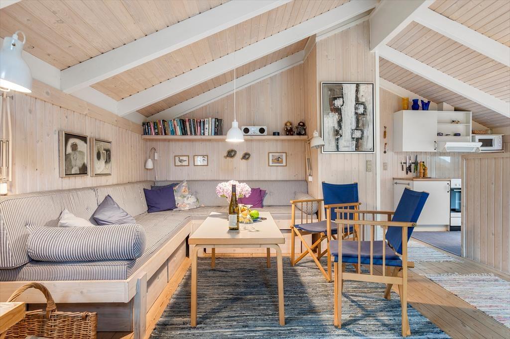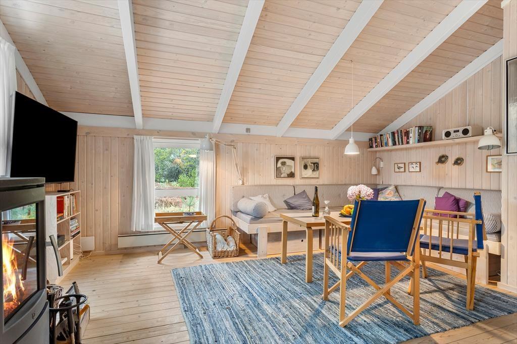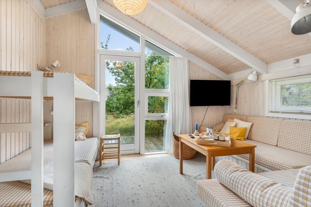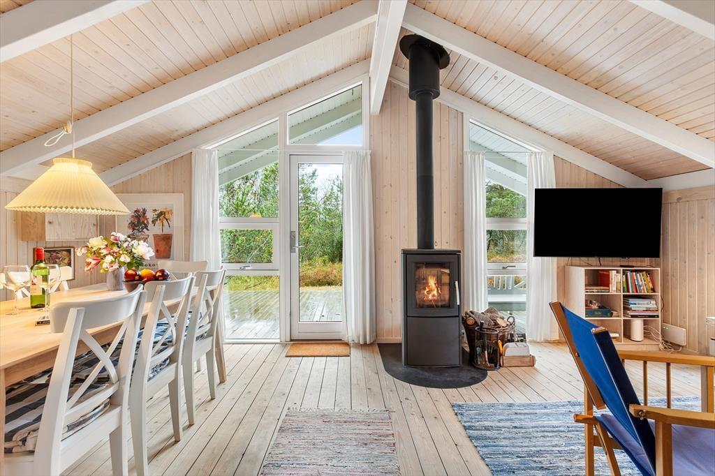 Når du træder ind ad døren, mærker du straks den lyse og imødekommende atmosfære, som gør det nemt at finde feriestemningen frem. Indretningen er hyggelig og smagfuld med en fin balance mellem klassisk sommerhuscharme og moderne komfort. Det lyse opholdsrum danner rammen om samværet – her kan I nyde en kop kaffe i sofaen, spille spil ved spisebordet eller varme jer foran brændeovnen, mens I lytter til naturens stille sus udenfor. I stuen er der desuden en hyggelig alkove, hvor man kan tage en middagslur, læse en god bog eller lade børnene hygge sig med tegnefilm. Køkkenet ligger i åben forbindelse med stuen, så samtalen kan fortsætte, mens du laver mad, og med to badeværelser er der god plads til, at alle kan få en behagelig start på dagen – det ene badeværelse ligger i annekset, som dermed fungerer perfekt som en selvstændig afdeling for dem, der ønsker lidt ekstra privatliv. Det tilhørende anneks byder desuden på ekstra sovepladser og giver mulighed for, at nogle i selskabet kan trække sig lidt tilbage og nyde roen, når behovet melder sig.