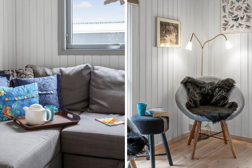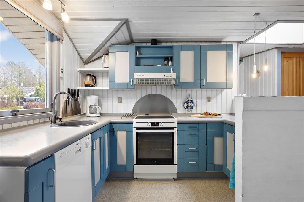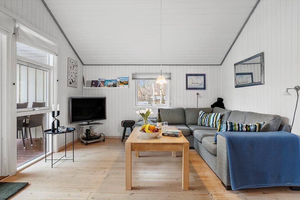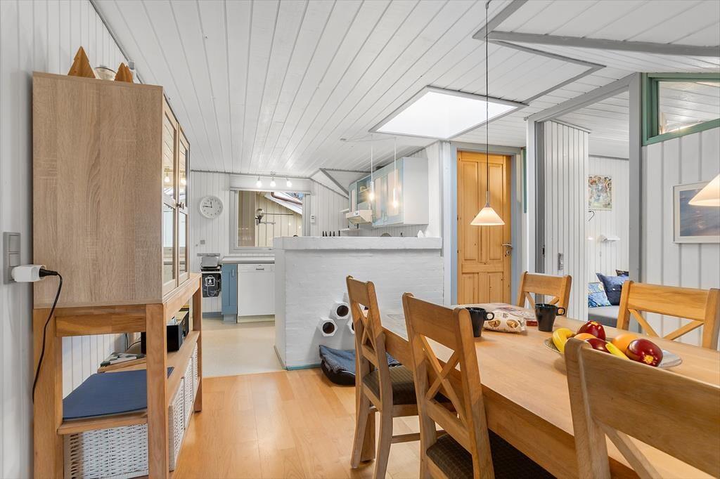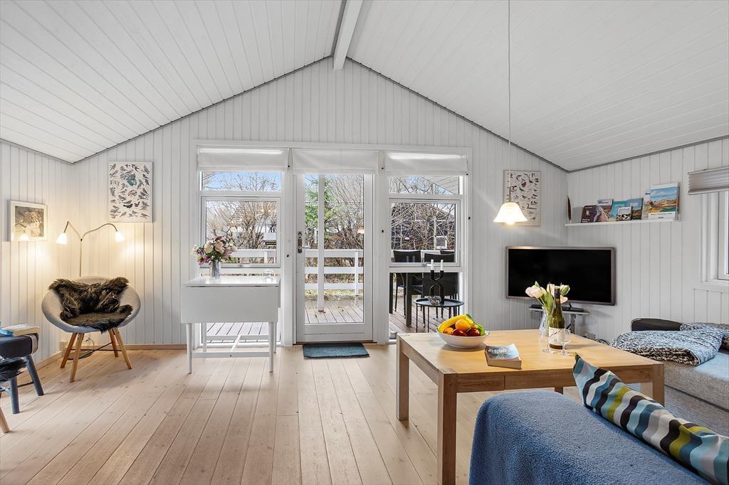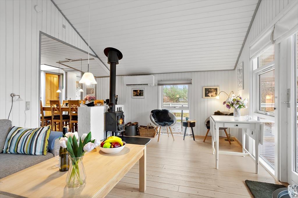Indenfor mødes du af en varm og indbydende atmosfære, hvor ferien straks falder på plads. Husets hjerte er den hyggelige opholdsstue, hvor lyset strømmer ind gennem de store vinduer og giver en fornemmelse af at være tæt på naturen – selv når du sidder indenfor. Her kan I samles til brætspil, filmhygge eller stille stunder med ild i brændeovnen, mens duften af friskbrygget kaffe breder sig. Køkkenet ligger i åben forbindelse med stuen, så madlavningen bliver en naturlig del af fællesskabet. Når det er tid til afslapning, kan du trække dig tilbage til husets wellnessafdeling, hvor både spa og sauna står klar til at forkæle krop og sind. Med to badeværelser er der god plads til, at hele familien kan starte og slutte dagen uden trængsel, og på det ene badeværelse finder du desuden en vaskemaskine, så det praktiske også er på plads.