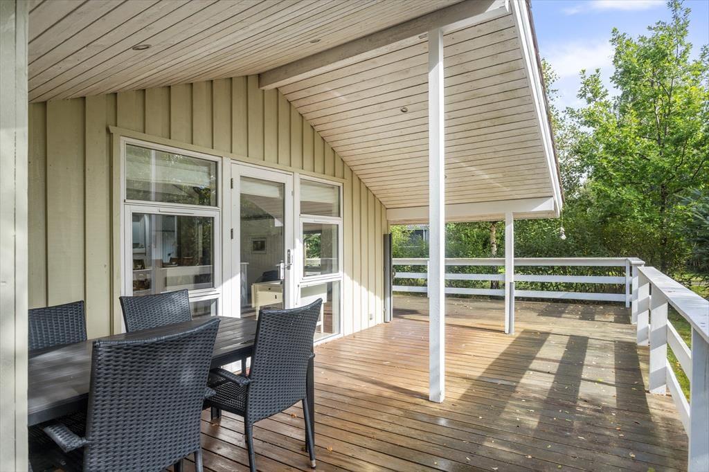 Udenfor venter en dejlig, indhegnet grund, der skaber trygge rammer for både børn og hunde, som gerne må være med på ferien. De velanlagte terrassearealer indbyder til mange timer i det fri, hvad enten solen skinner fra en skyfri himmel, eller du søger skygge under det overdækkede terrasseafsnit. Her kan du nyde morgenkaffen, mens duggen fordamper fra græsset, eller afslutte dagen med et glas vin og lyden af naturen som baggrundsmusik. Selvom grunden ikke indbyder til boldspil, er der alligevel grønne arealer med græs, hvor både børn og hunde kan tumle rundt, mens du selv nyder freden og udsigten fra terrassen