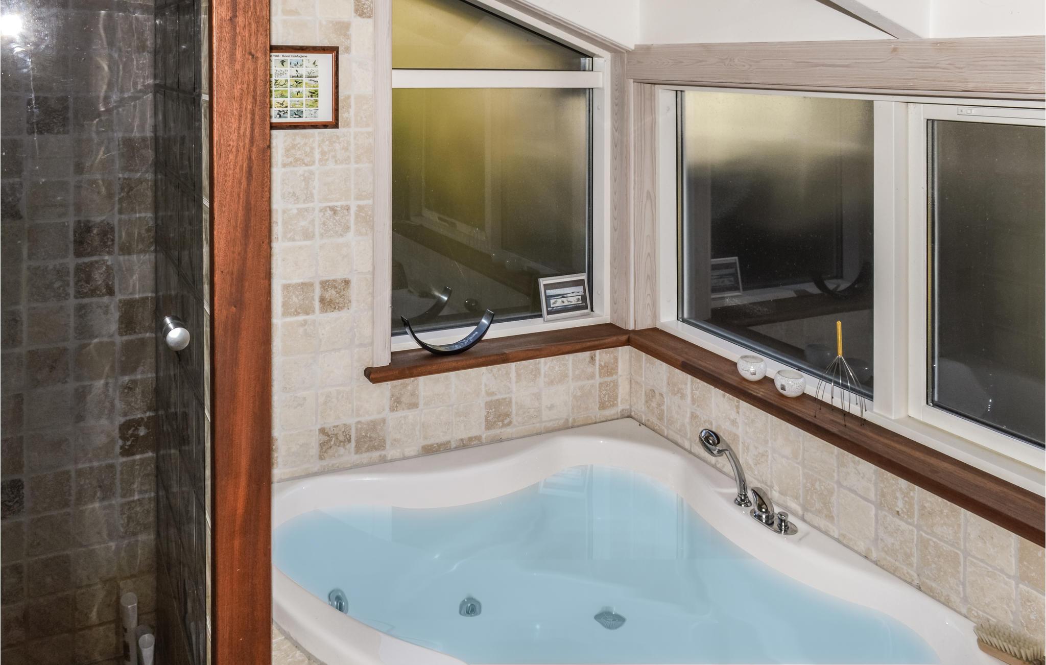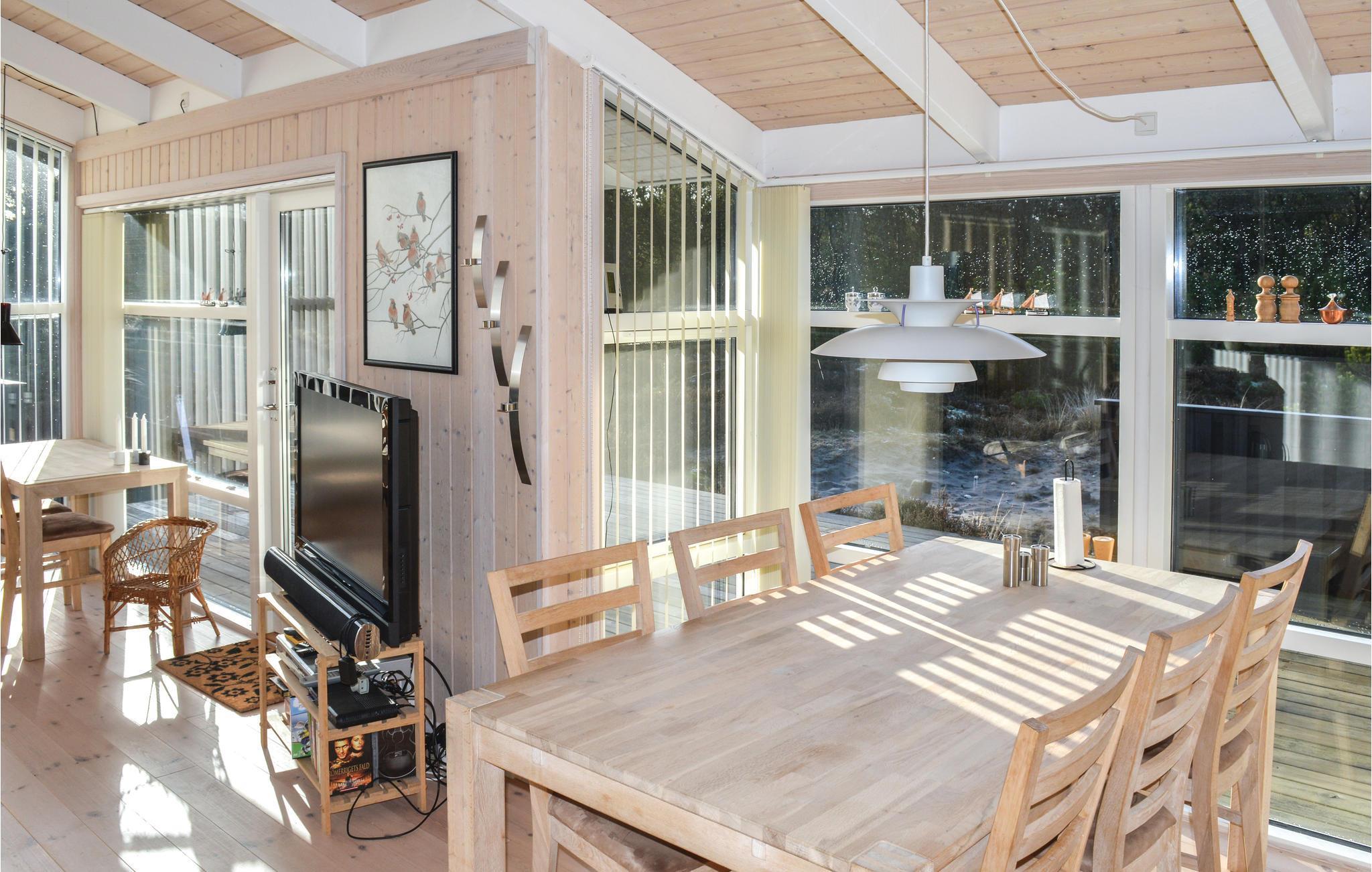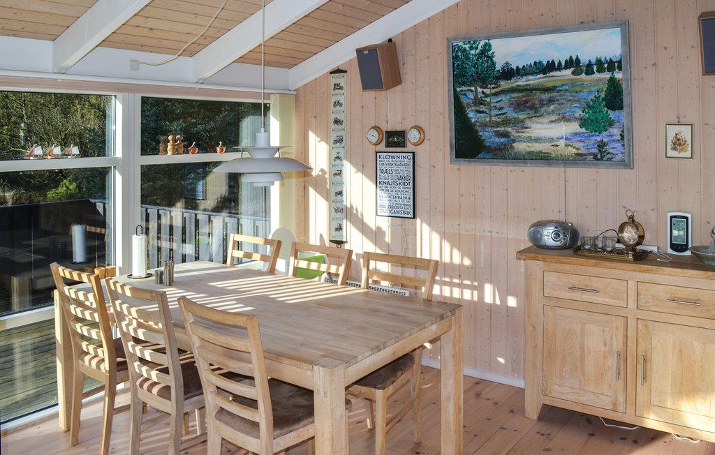 Dette charmerende træhus er indrettet med gode møbler og store vinduespartier, der lader lyset sive ind og giver en masse liv i det store fællesrum. Interiøret er præget af træelementer i farver, og huset har alle de faciliteter, I behøver til en rolig ferie uden de store bekymringer.