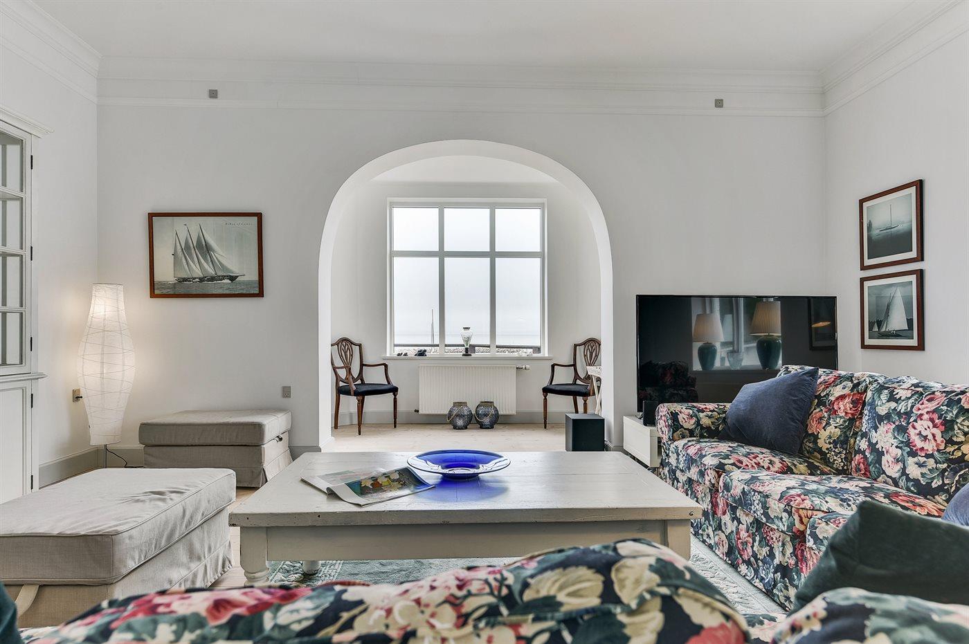 I yderste række til vandet og med en fantastisk panoramaudsigt over farvandet mellem Langeland og Fyn samt Lohals lystbådehavn ligger denne store og virkelig indbydende villa i 3 plan med sit helt eget tårn.