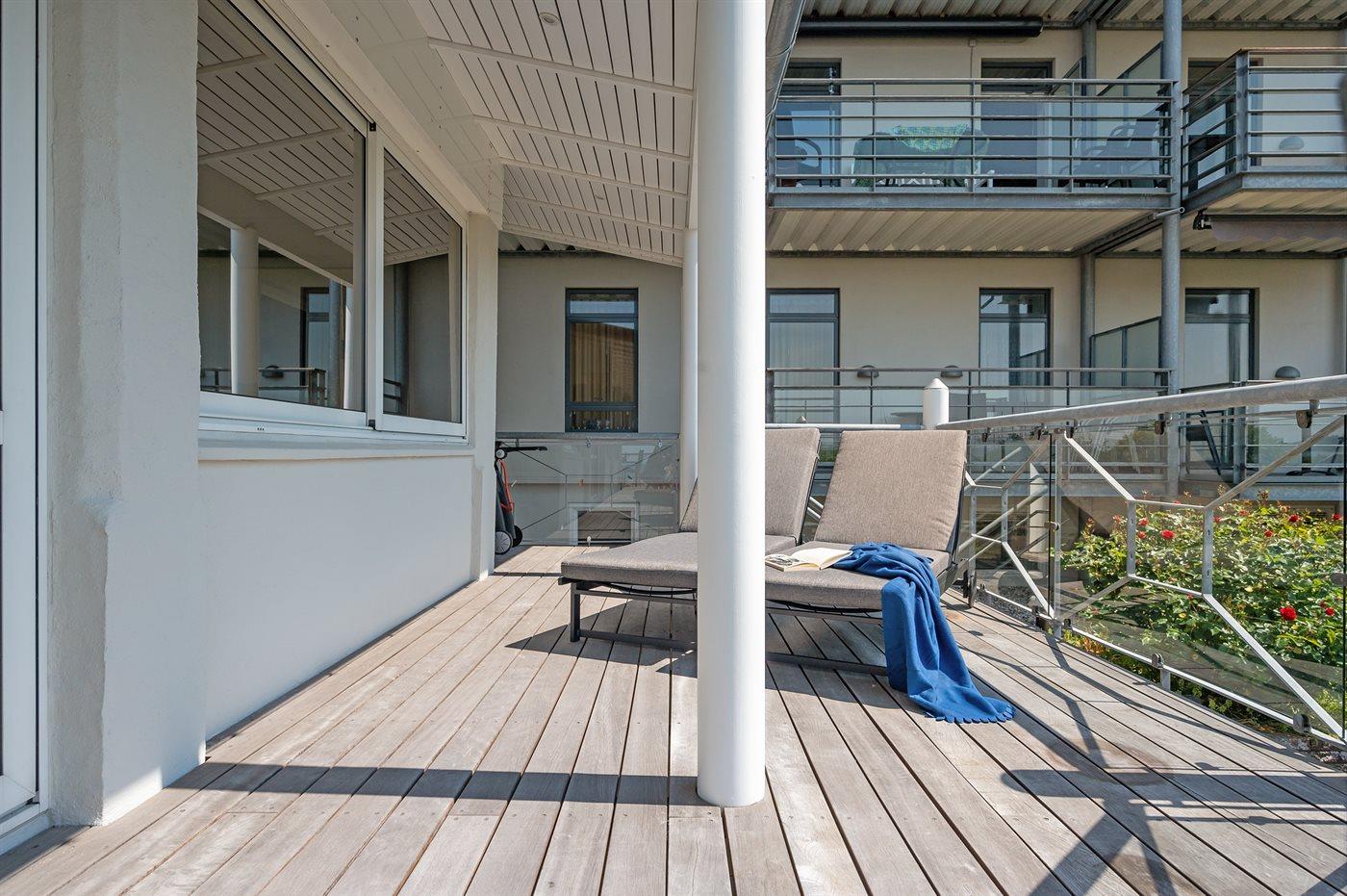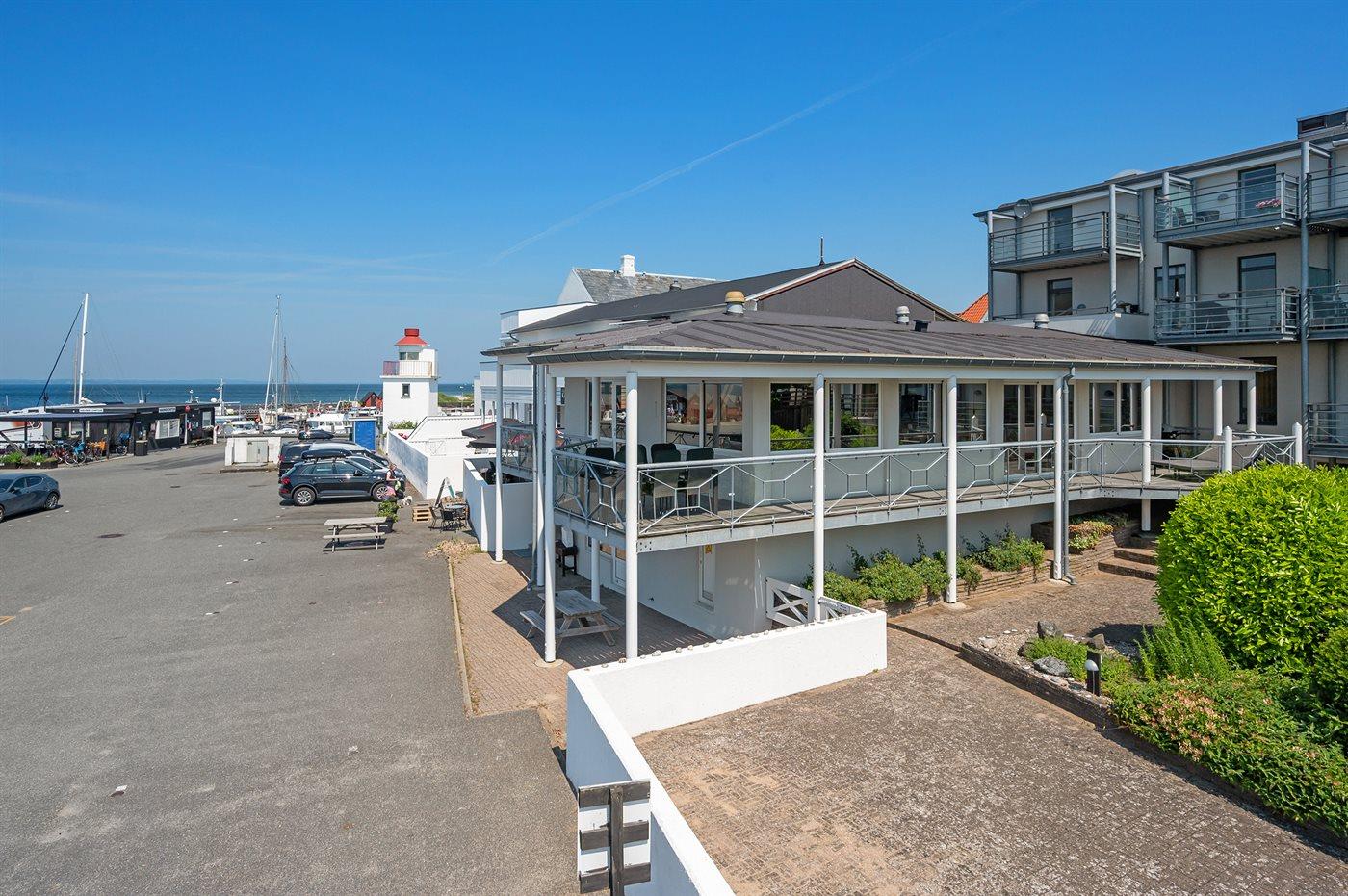 Med den bedste beliggenhed lige ud til marinaen i Lohals finder I denne store og flotte lejlighed. En skøn overdækket terrasse omgiver hele lejligheden, og derfra fører en trappe direkte ned til marinaen og de omkringliggende restauranter, ishus m.m. Udsigten fra både lejlighed og terrassen er helt fantastisk.