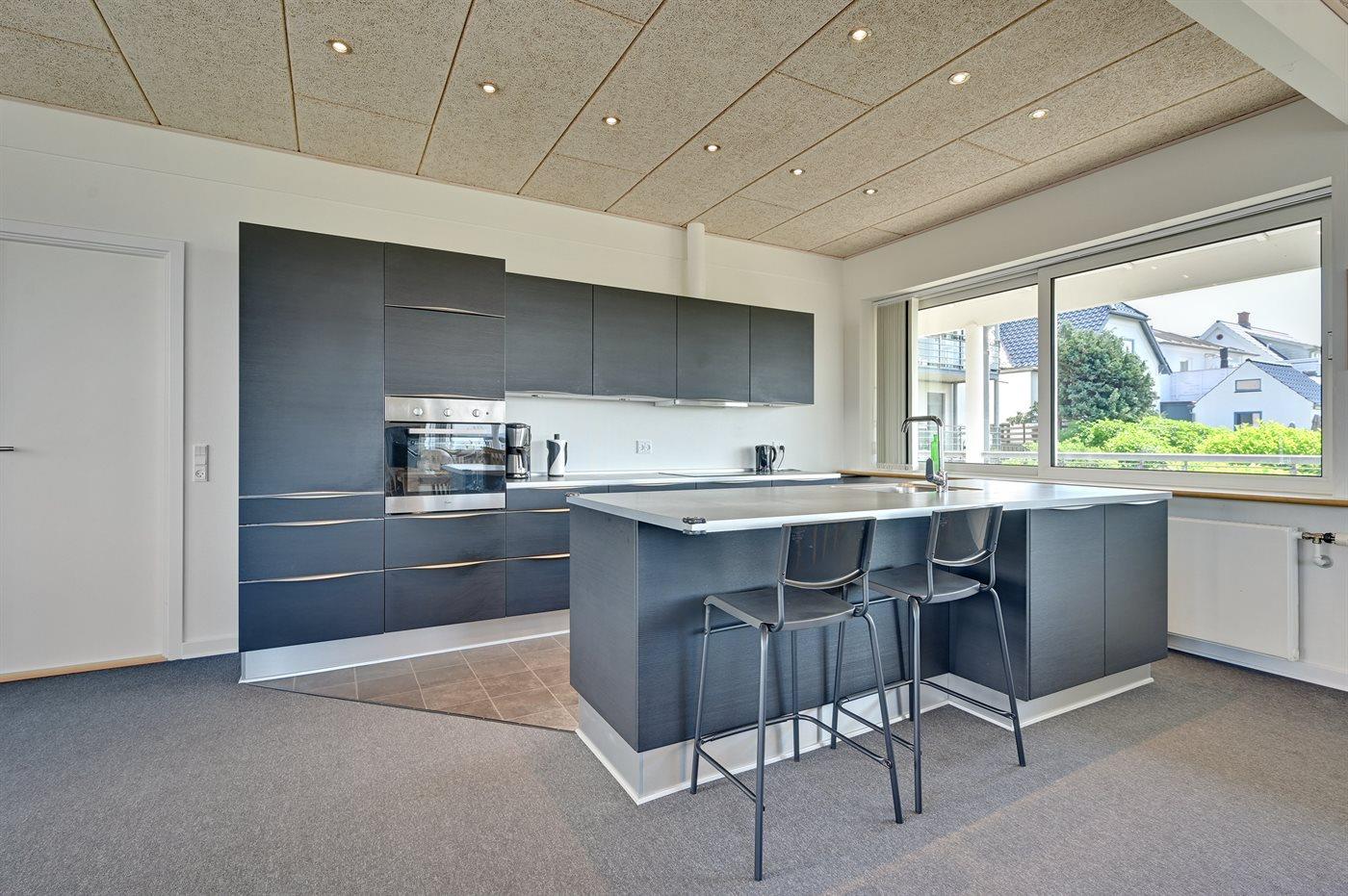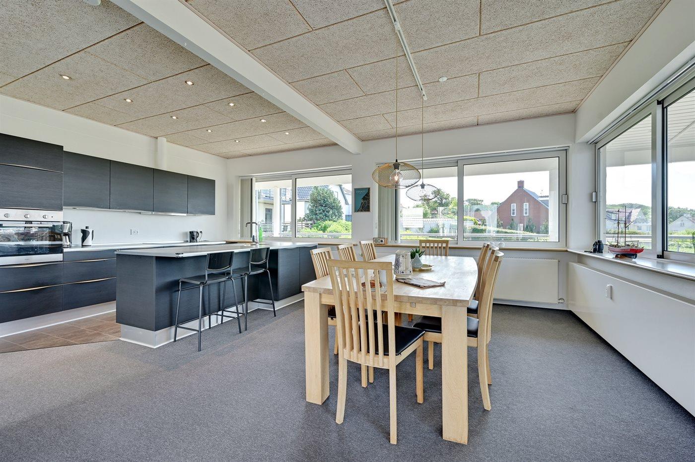 Køkkenet er udstyret med 1 køleskab. Der er 4 induktionskogeplader, varmluftovn, mikrobølgeovn samt opvaskemaskine.