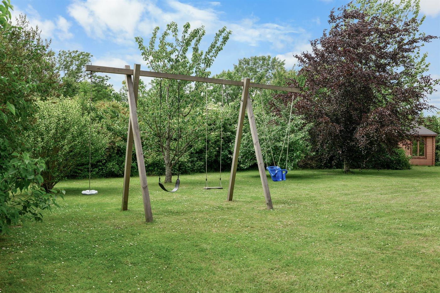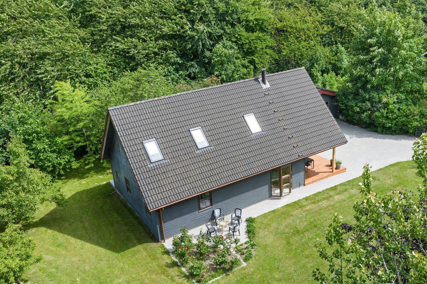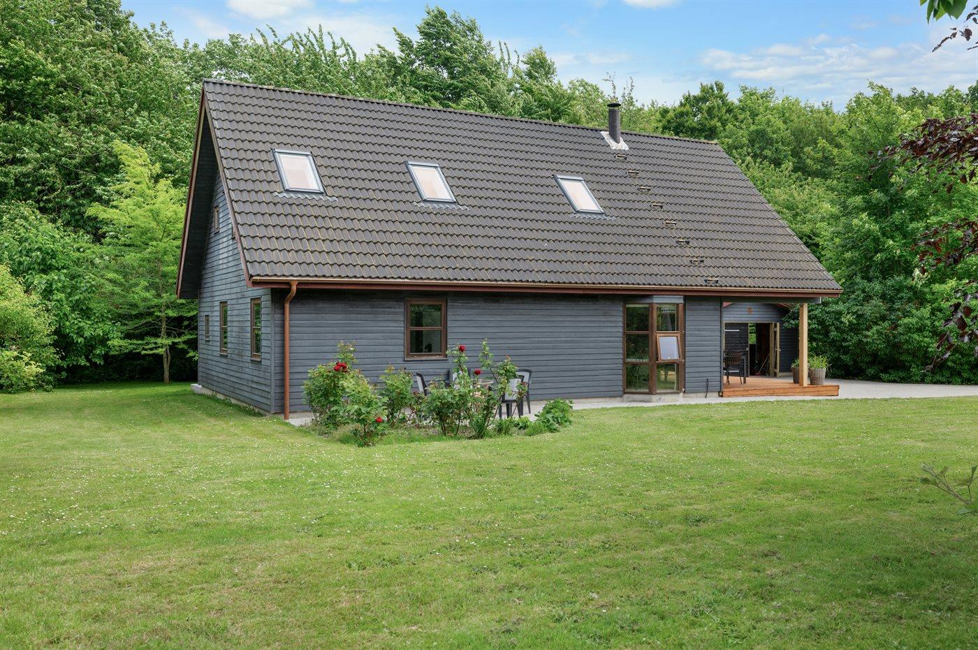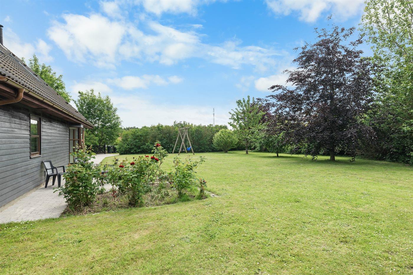 Der er en skøn overdækket terrasse og en stor have med bl.a. frugttræer, bærbuske, bålsted og gynger. Fra haven er der udgang til et stort skovområde, og flere strande i gåafstand.