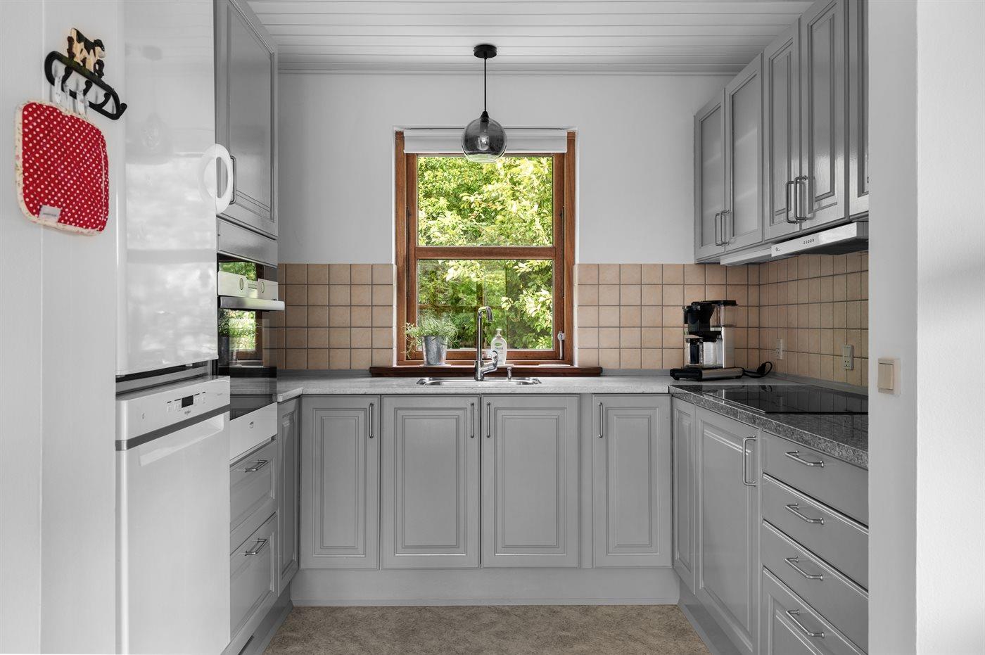 Køkkenet er udstyret med 1 køleskab. Der er 4 induktionskogeplader, varmluftovn, mikrobølgeovn samt opvaskemaskine Der er gulvvarme i køkkenet.